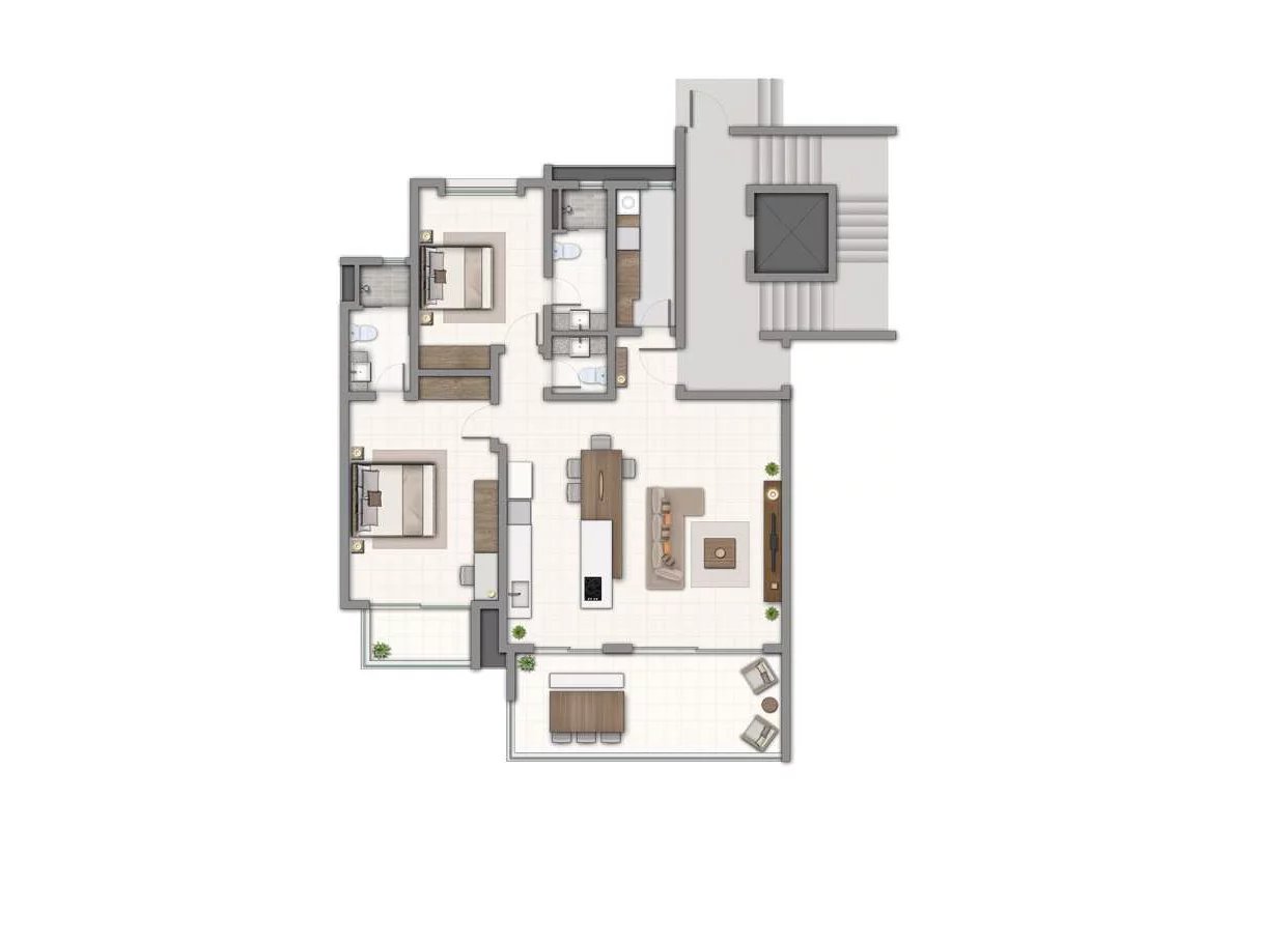 Hochwertige exklusive Oberflächen und die Verwendung der besten Materialien garantieren außergewöhnliche Ergebnisse für diesen geräumigen Wohnraum. Die subtilen Farben des Master -Raums schaffen eine luxuriöse und ruhige Atmosphäre, während der Balkon mit atemberaubender Aussicht einen weitläufigen und entspannenden Ruhestand bietet.