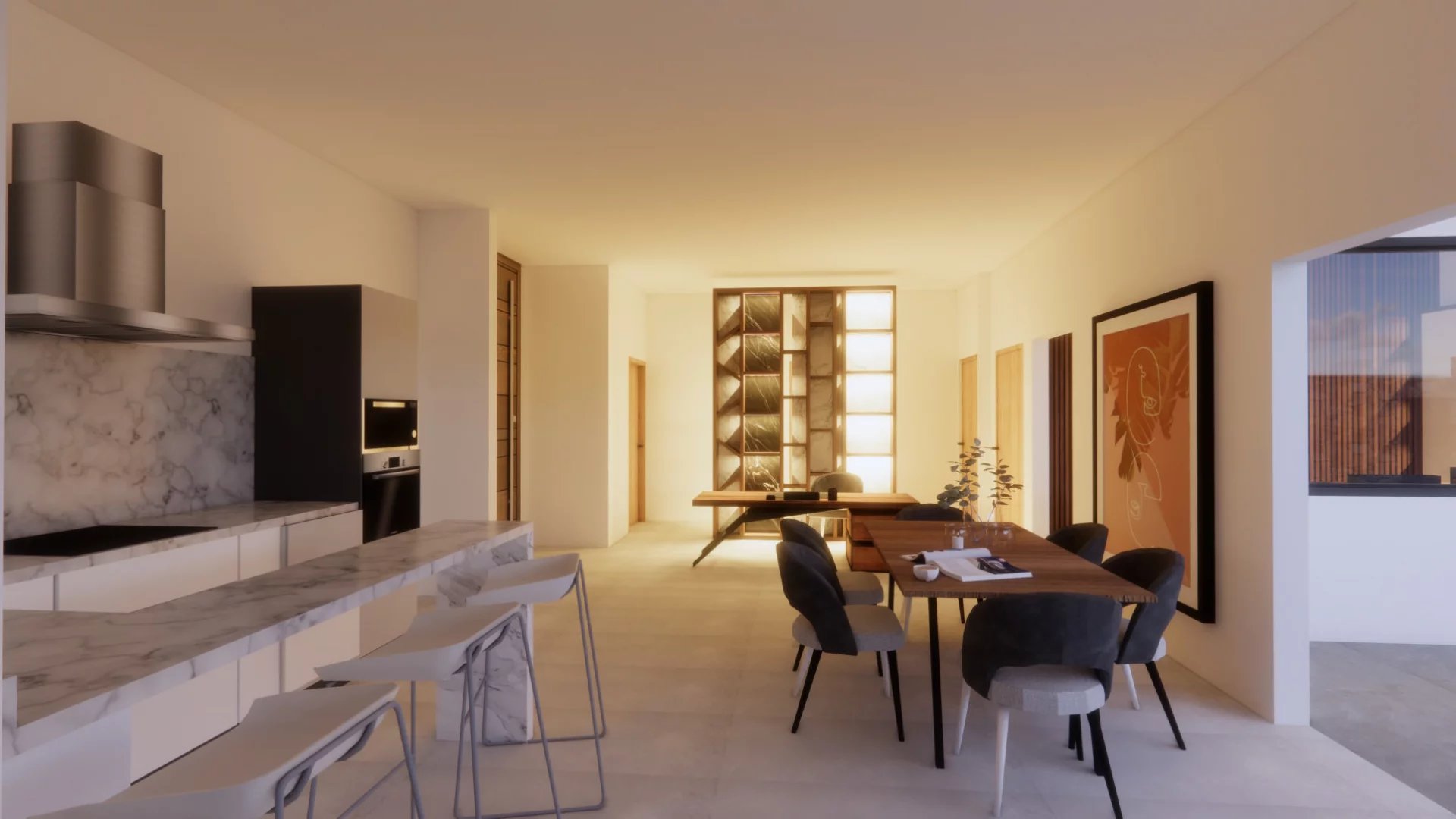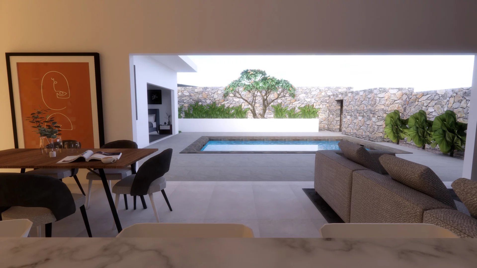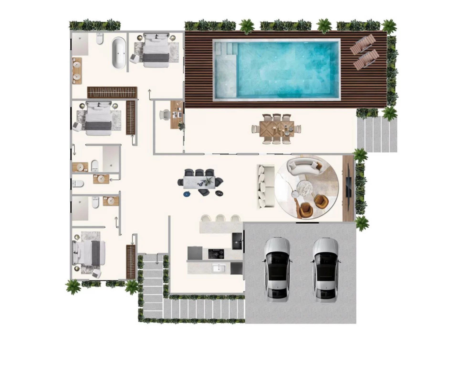 Die Villa LEO hat eine Fläche von 232 m² und umfasst 3 Schlafzimmer, jeweils mit eigenem Badezimmer. Sie verfügt über hohe Decken, einen privaten Pool, eine Terrasse und alle modernen Annehmlichkeiten.