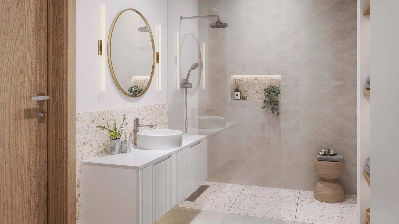 Eine warme Palette von pudrigen Farben mit Weißtönen verstärkt die Atmosphäre der Gelassenheit. Die italienische Dusche ist in Terrazzo gekleidet, um das Aussehen zu behalten Natürlicher und akzentuieren Sie die Dimension eines raffinierten Designs.