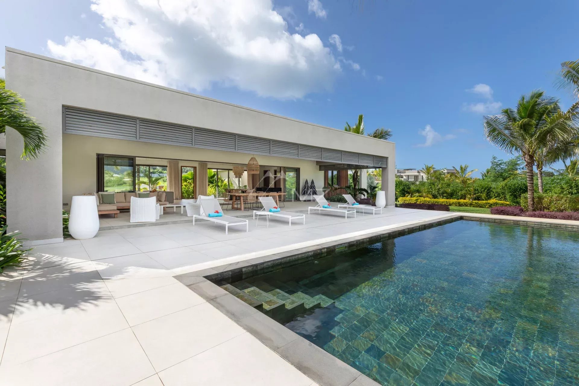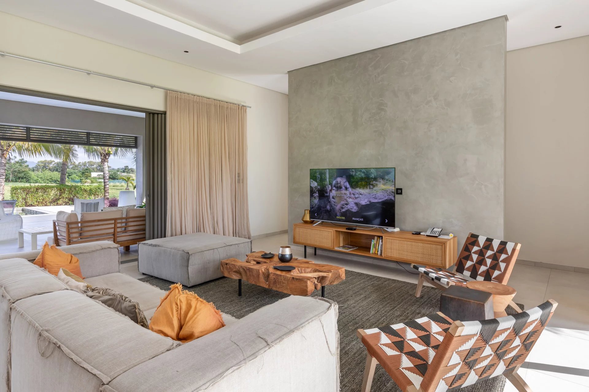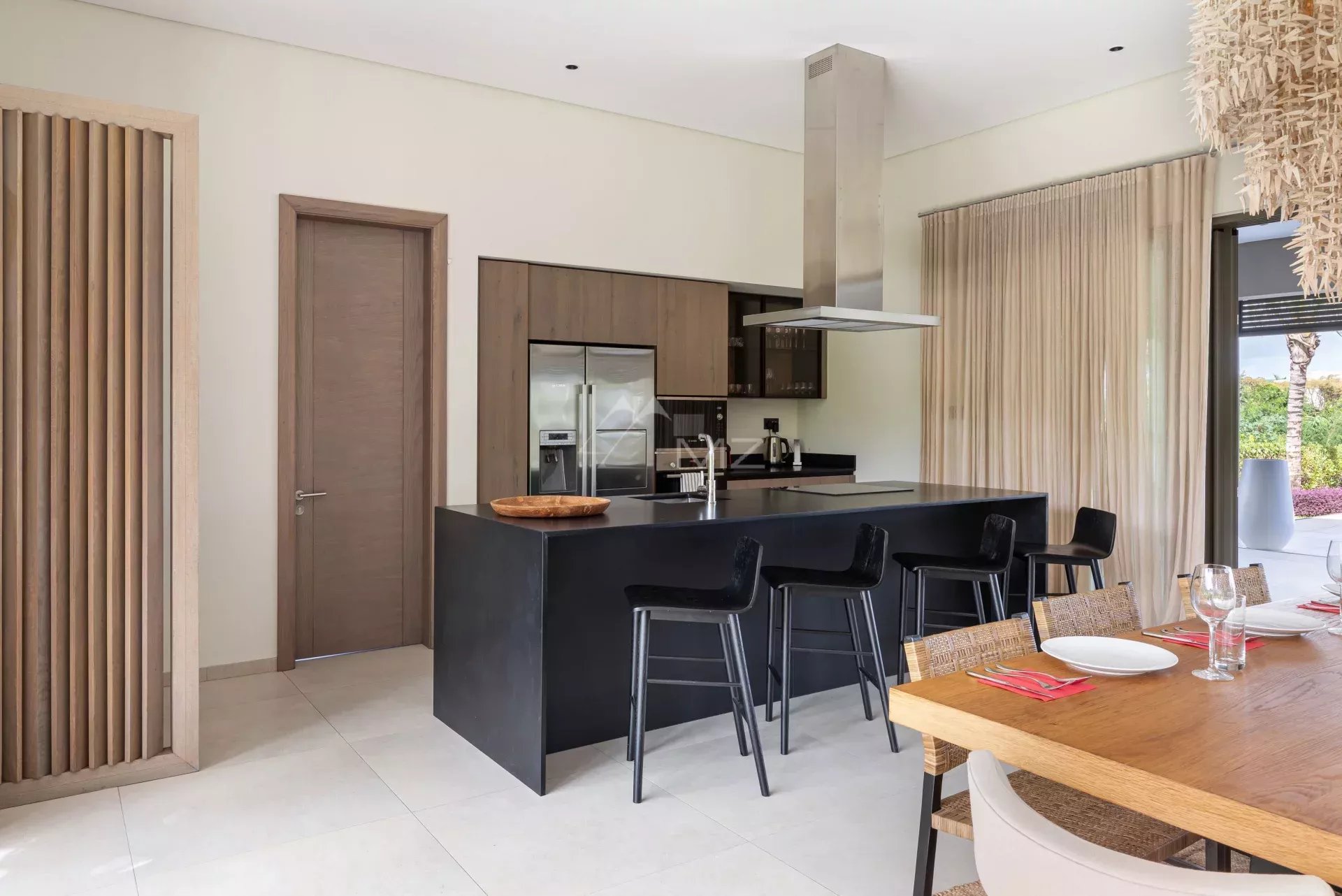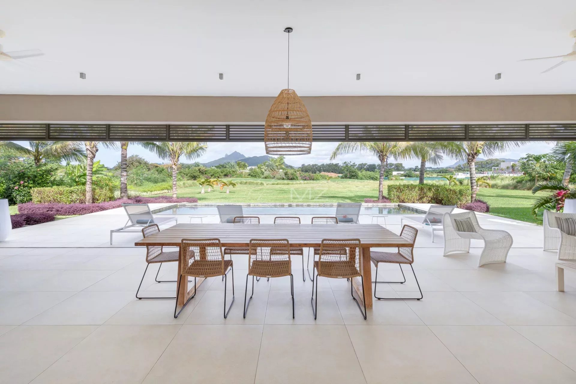 Wenn Sie nach einer luxuriösen Villa suchen, die Komfort und Modernität vereint, ist diese Immobilie im Viertel Rive Est genau das Richtige für Sie. Diese ebenerdige Villa mit 444 m² Wohnfläche befindet sich auf einem Grundstück von 2514 m² und bietet einen atemberaubenden Blick auf die gepflegten Fairways und die umliegenden Berge.