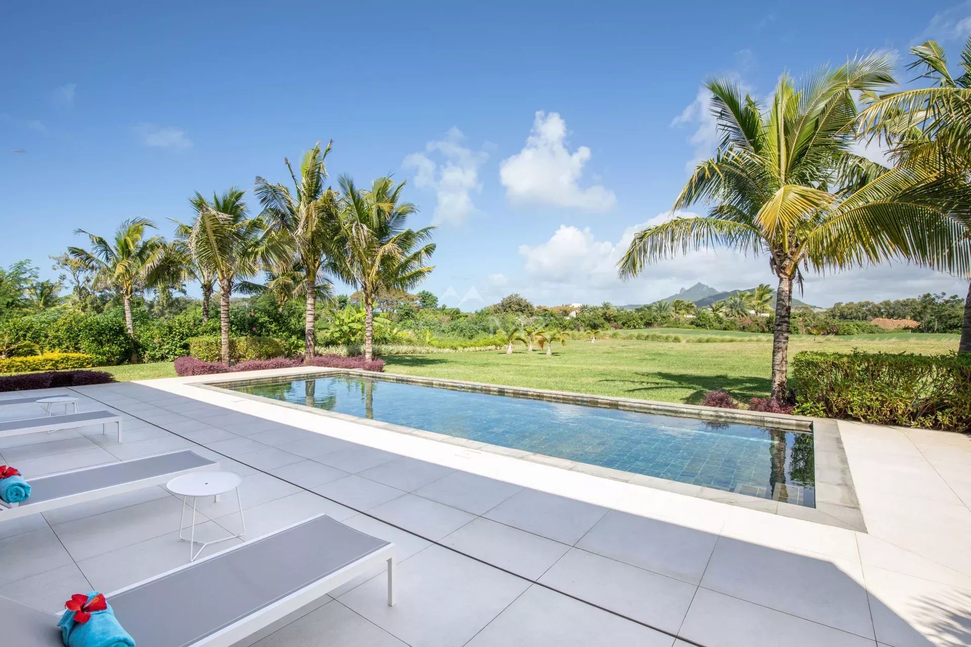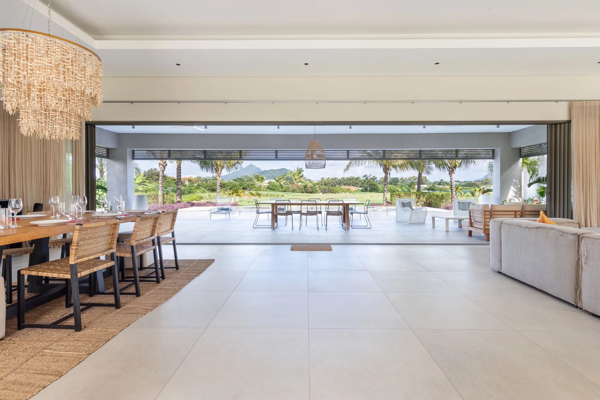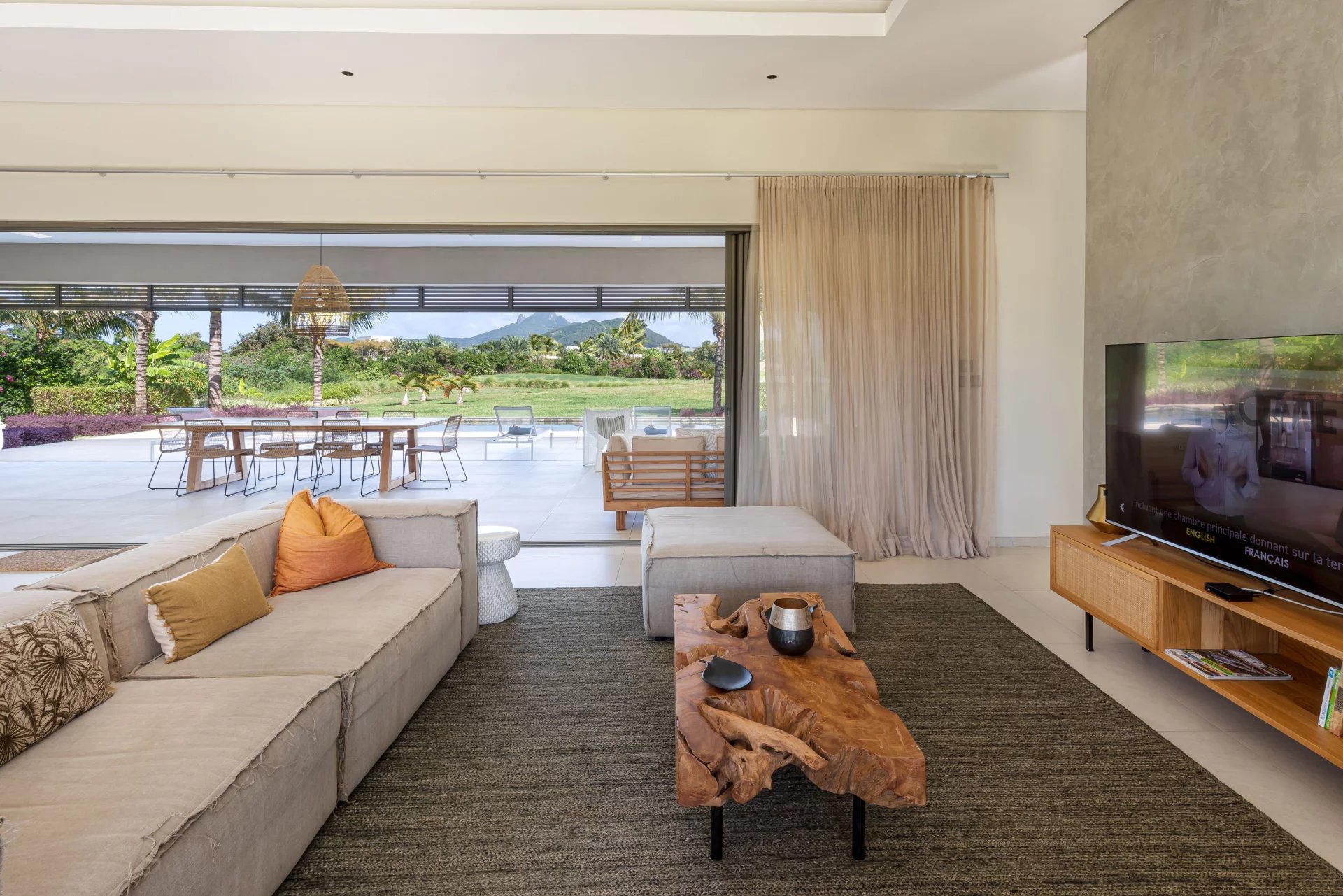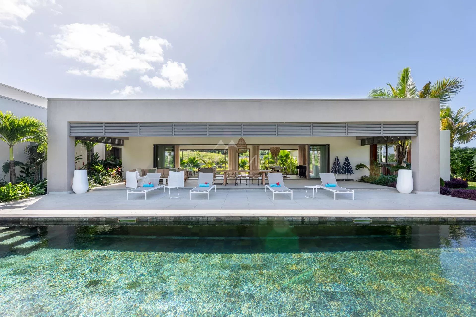 Wenn Sie nach einer luxuriösen Villa suchen, die Komfort und Modernität vereint, ist diese Immobilie im Viertel Rive Est genau das Richtige für Sie. Diese ebenerdige Villa mit 444 m² Wohnfläche befindet sich auf einem Grundstück von 2514 m² und bietet einen atemberaubenden Blick auf die gepflegten Fairways und die umliegenden Berge.