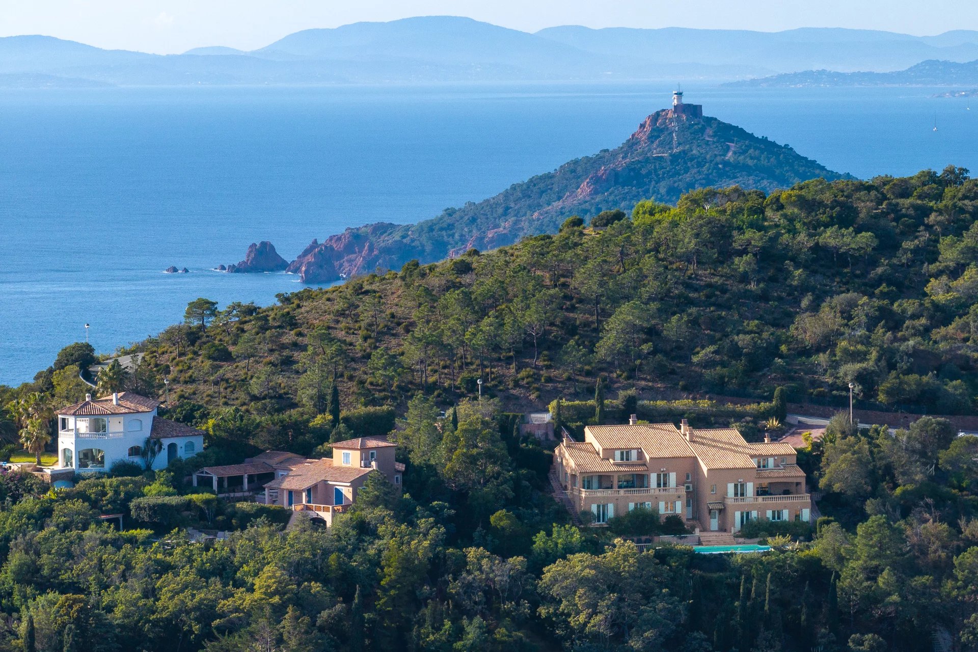 Auf den Anhöhen von Anthéor, in einem privaten Anwesen mit atemberaubendem Meer- und Bergblick, besteht diese Villa aus zwei unabhängigen Teilen auf einer Gesamtfläche von ca. 287 m².