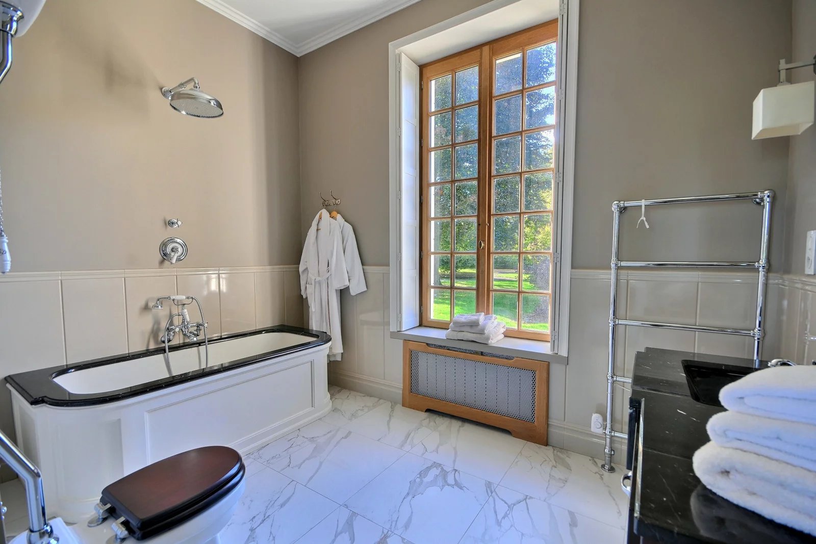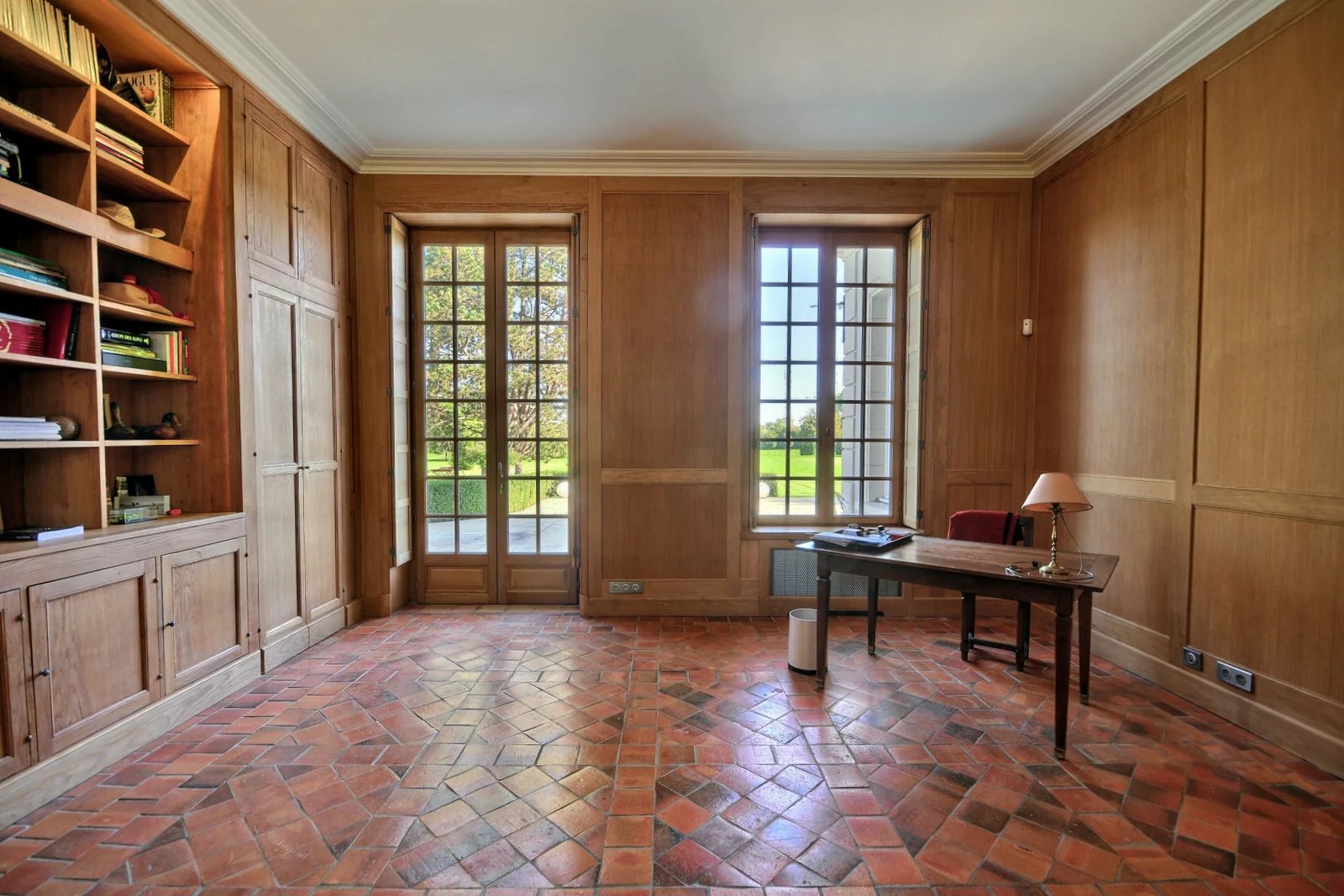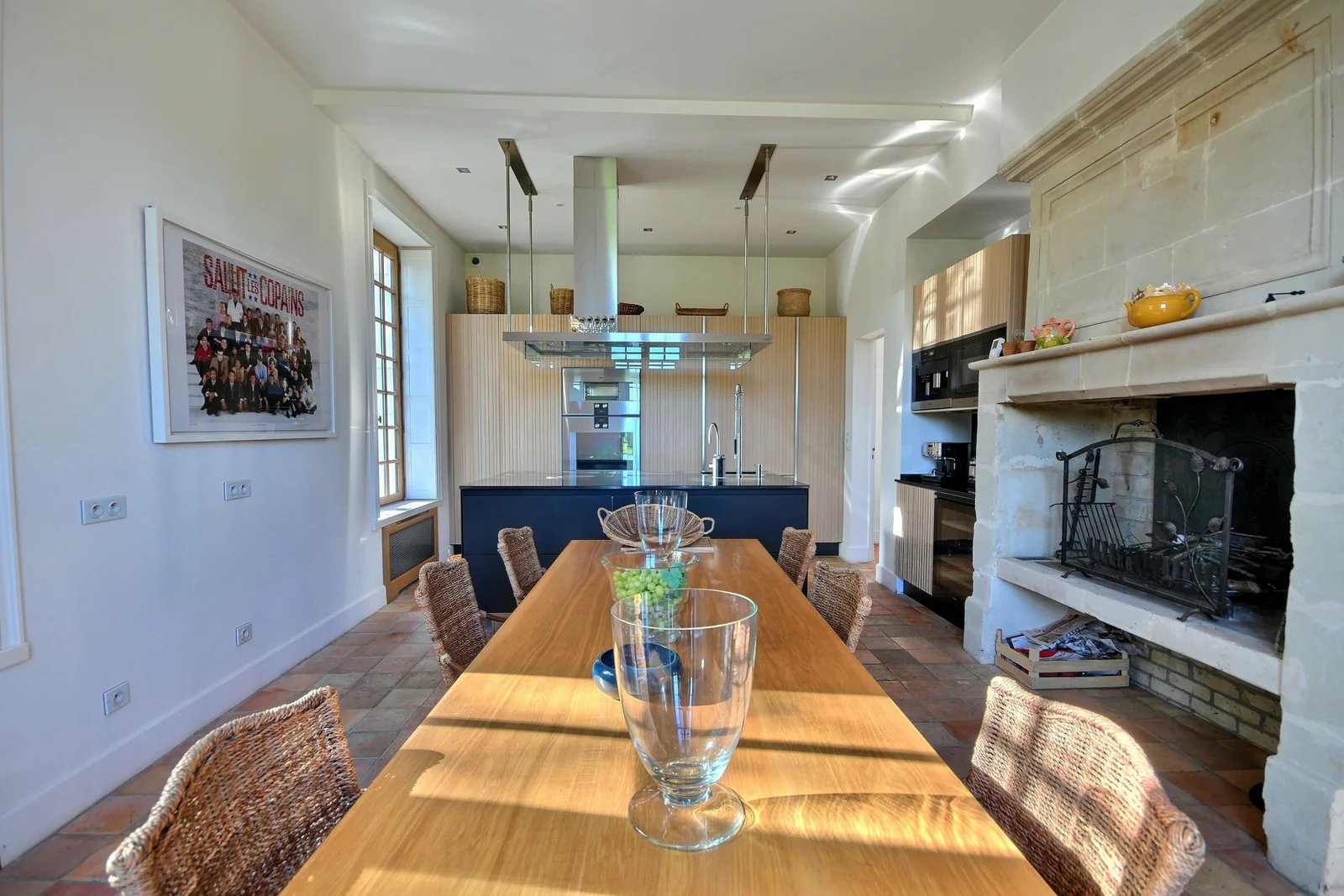 Es profitiert von hochwertigen Materialien: Schreinerarbeiten aus massiver Eiche, eine monumentale Treppe, Kamine im großen Wohnzimmer und in der Küche.