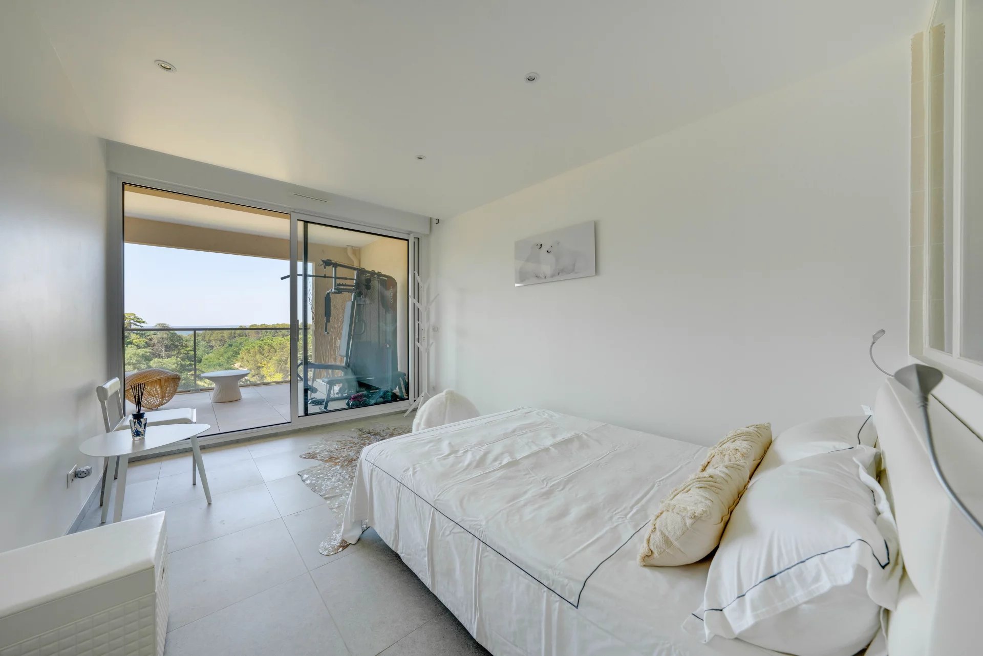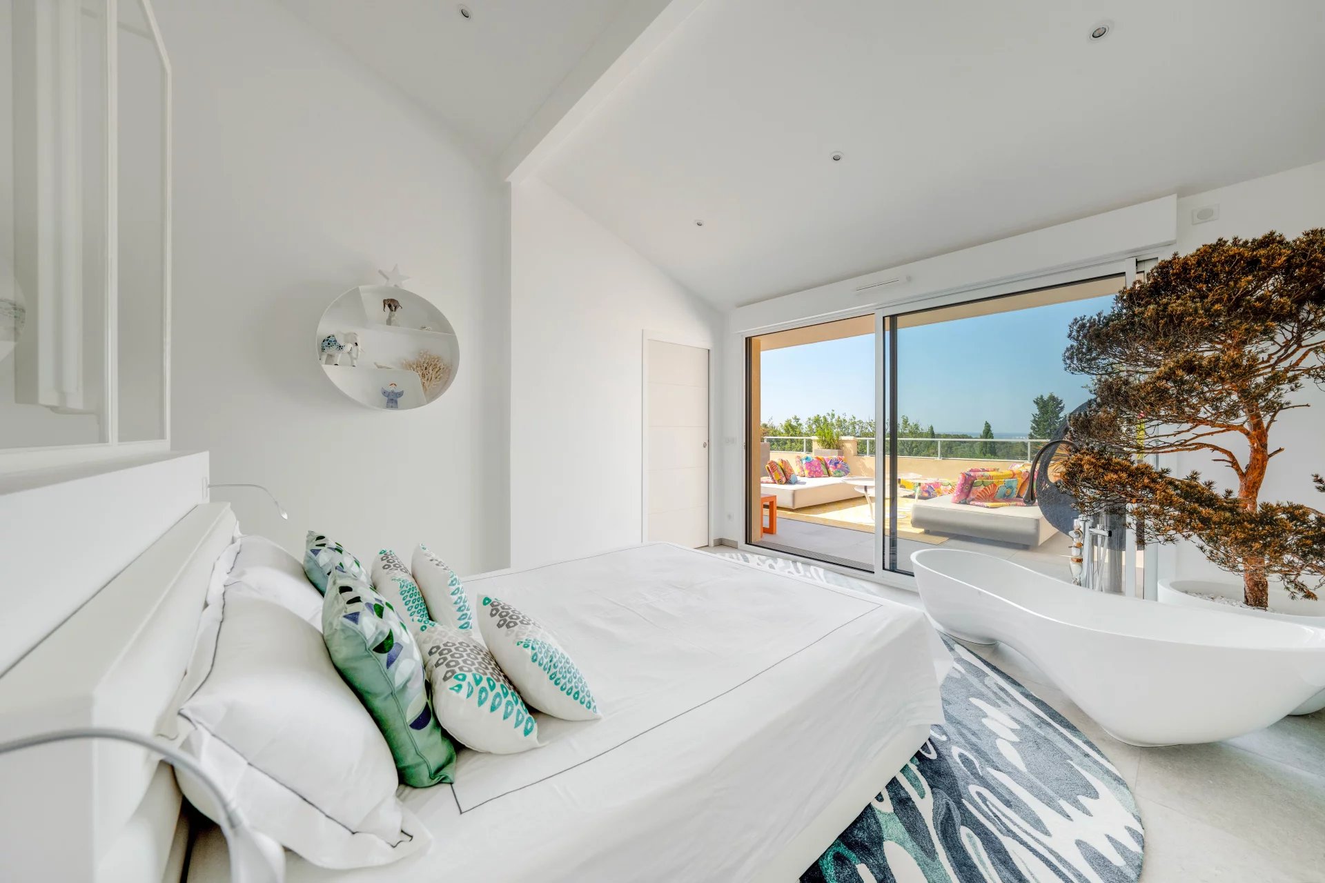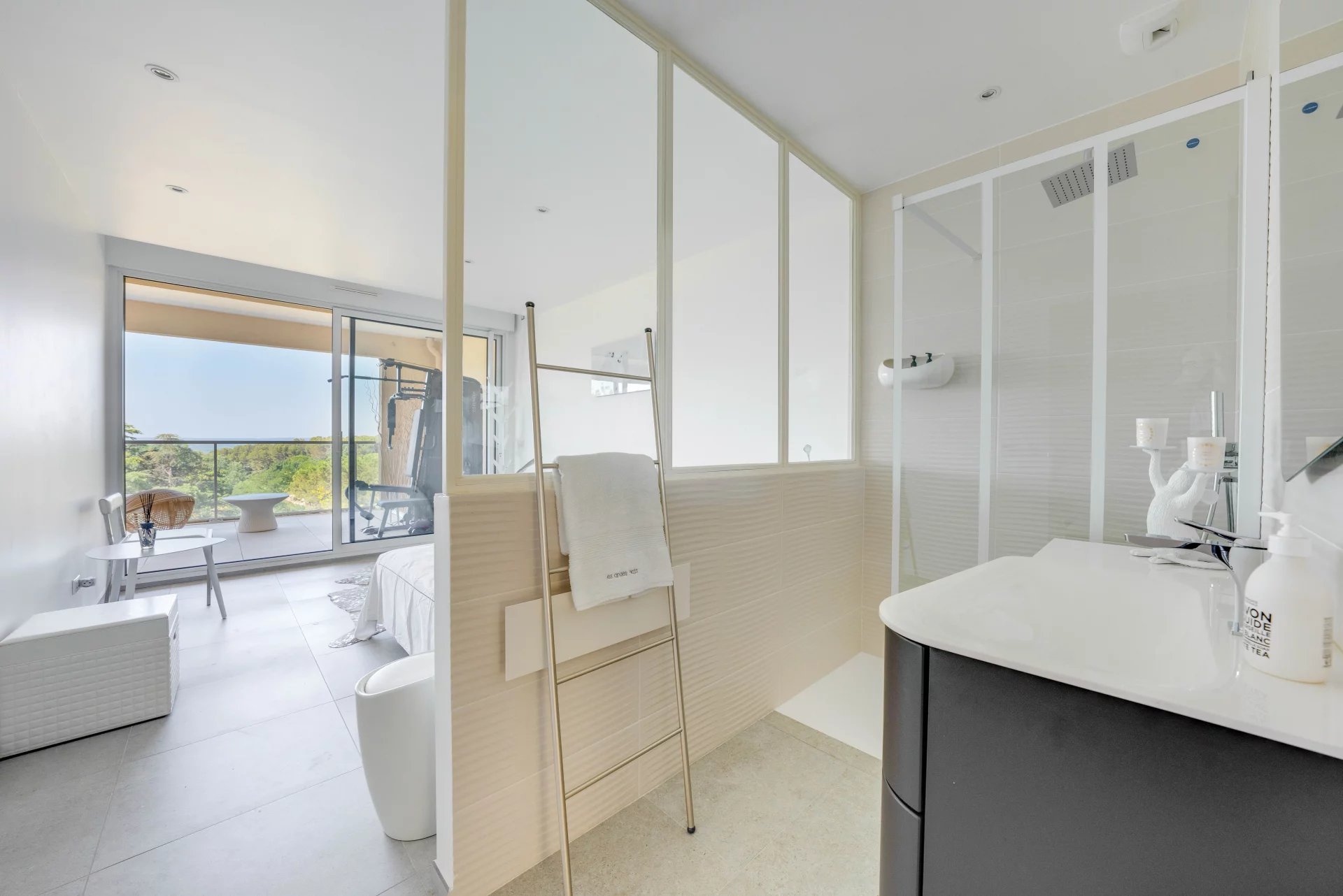 Die Wohnung besteht aus drei prächtigen Suiten, jede mit eigener Terrasse, die zum Entspannen im Freien einlädt. Die Master-Suite ist eine wahre Oase der Ruhe: Sie verfügt über ein maßgefertigtes Ankleidezimmer, eine elegante freistehende Badewanne und ein eigenes Bad – ein Ort des absoluten Wohlbefindens.
