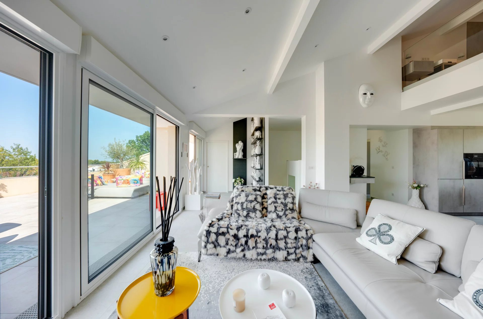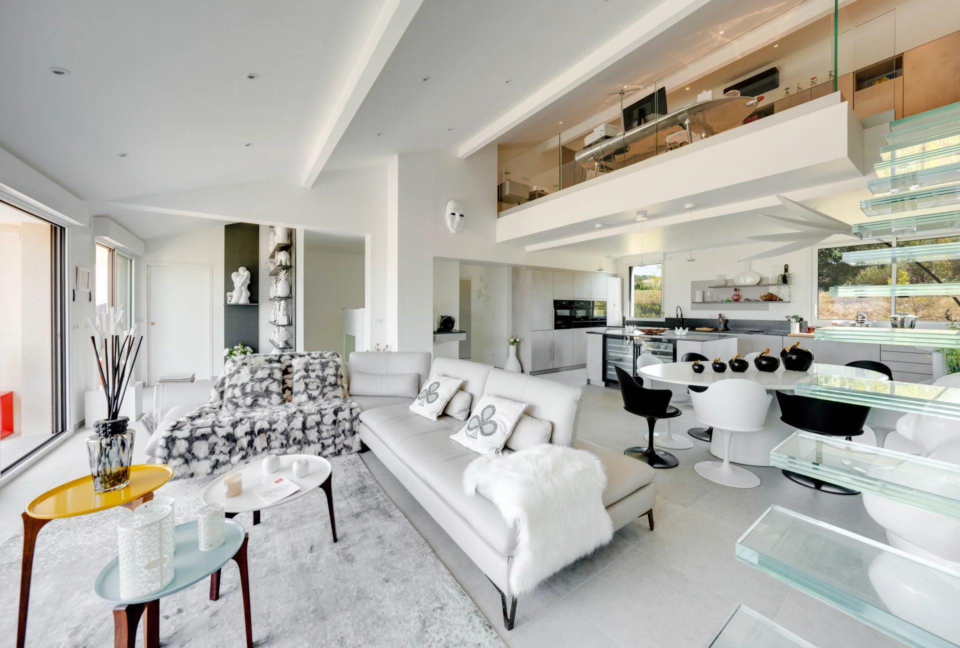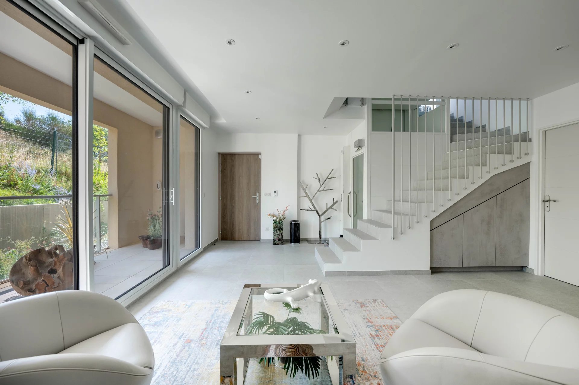 Das majestätische Wohnzimmer ist das Herzstück dieser außergewöhnlichen Wohnung. Dank großer Fenster ist es lichtdurchflutet und öffnet sich zu einer 75 m² großen Terrasse mit freiem Blick auf die umliegende Natur. Das über eine prächtige Glastreppe erreichbare Zwischengeschoss bietet ein geräumiges Büro und ein Ankleidezimmer.