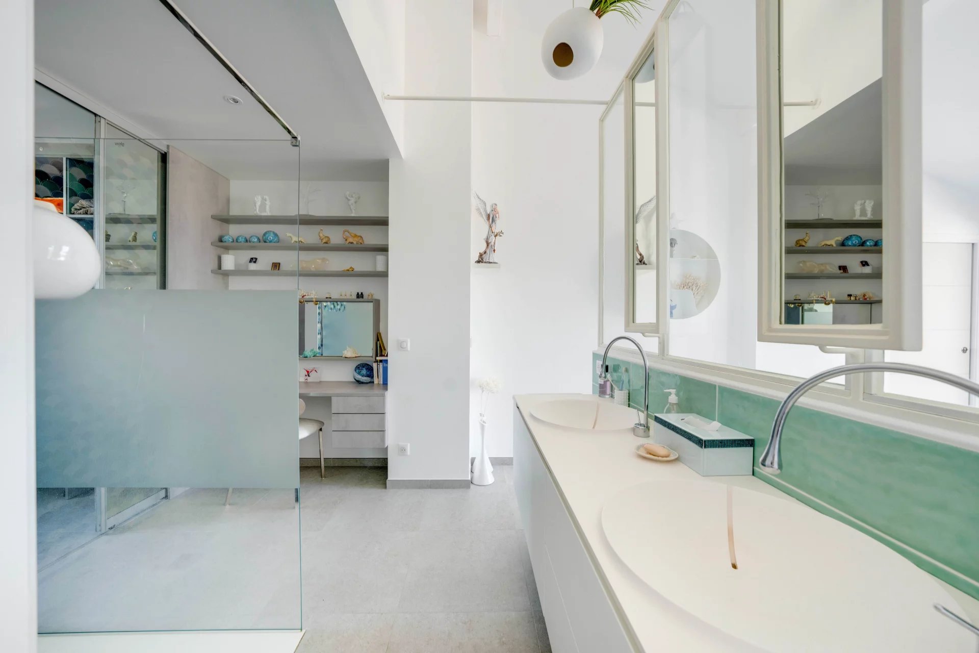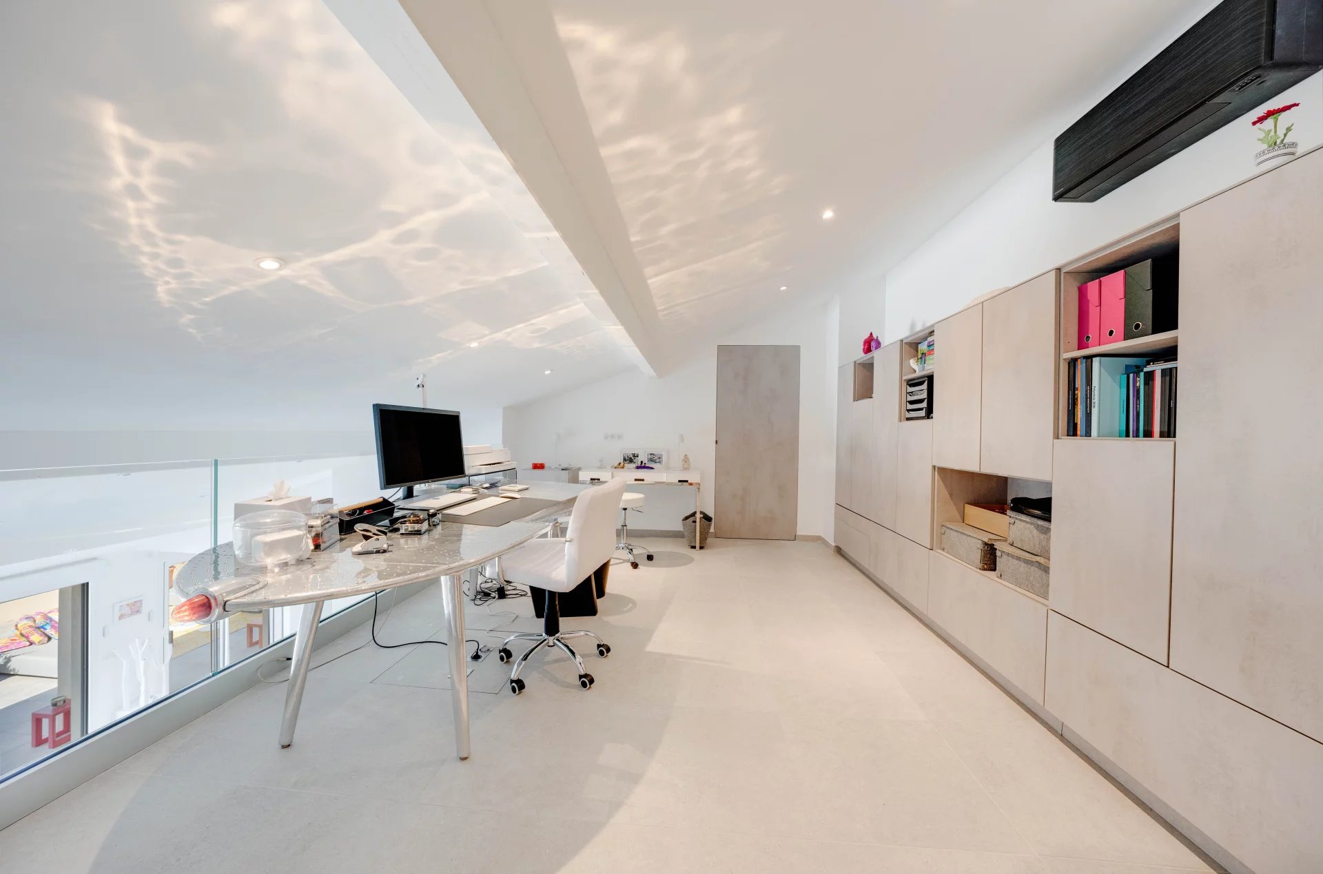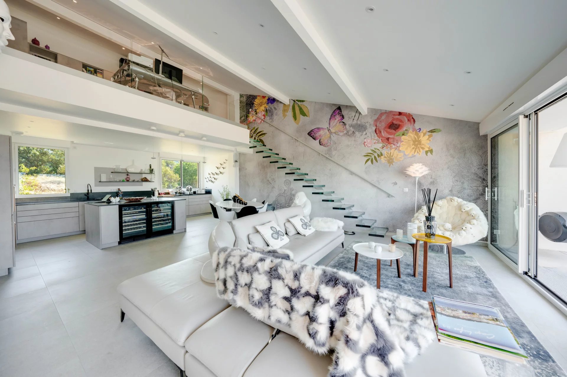 Das majestätische Wohnzimmer ist das Herzstück dieser außergewöhnlichen Wohnung. Dank großer Fenster ist es lichtdurchflutet und öffnet sich zu einer 75 m² großen Terrasse mit freiem Blick auf die umliegende Natur. Das über eine prächtige Glastreppe erreichbare Zwischengeschoss bietet ein geräumiges Büro und ein Ankleidezimmer.