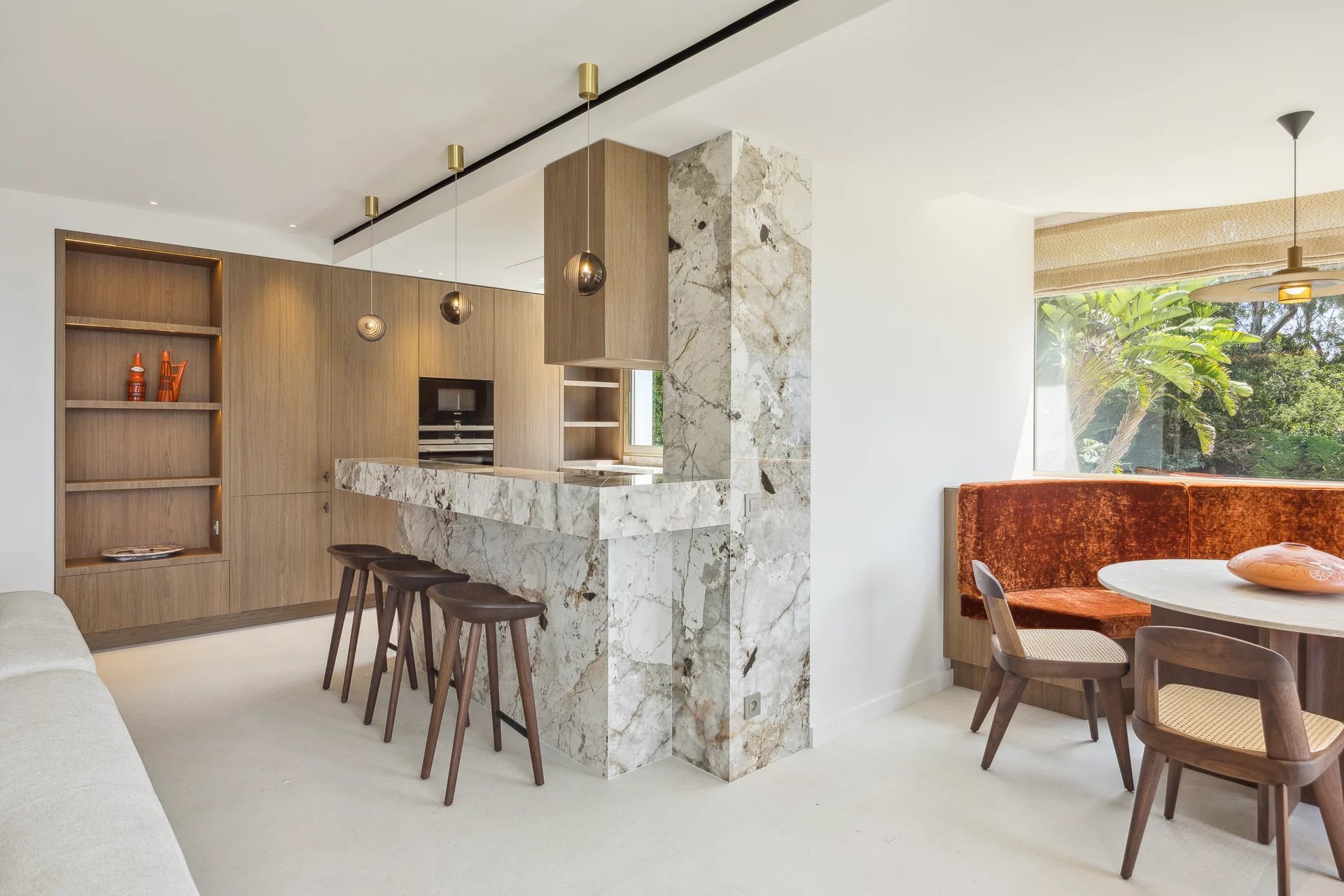 Diese geräumige Immobilie verfügt über ein helles Wohnzimmer mit Zugang zu einer Terrasse mit Panoramablick auf das Meer. Die voll ausgestattete offene Küche wird Liebhaber gehobener Küche und geselliger Atmosphäre begeistern.