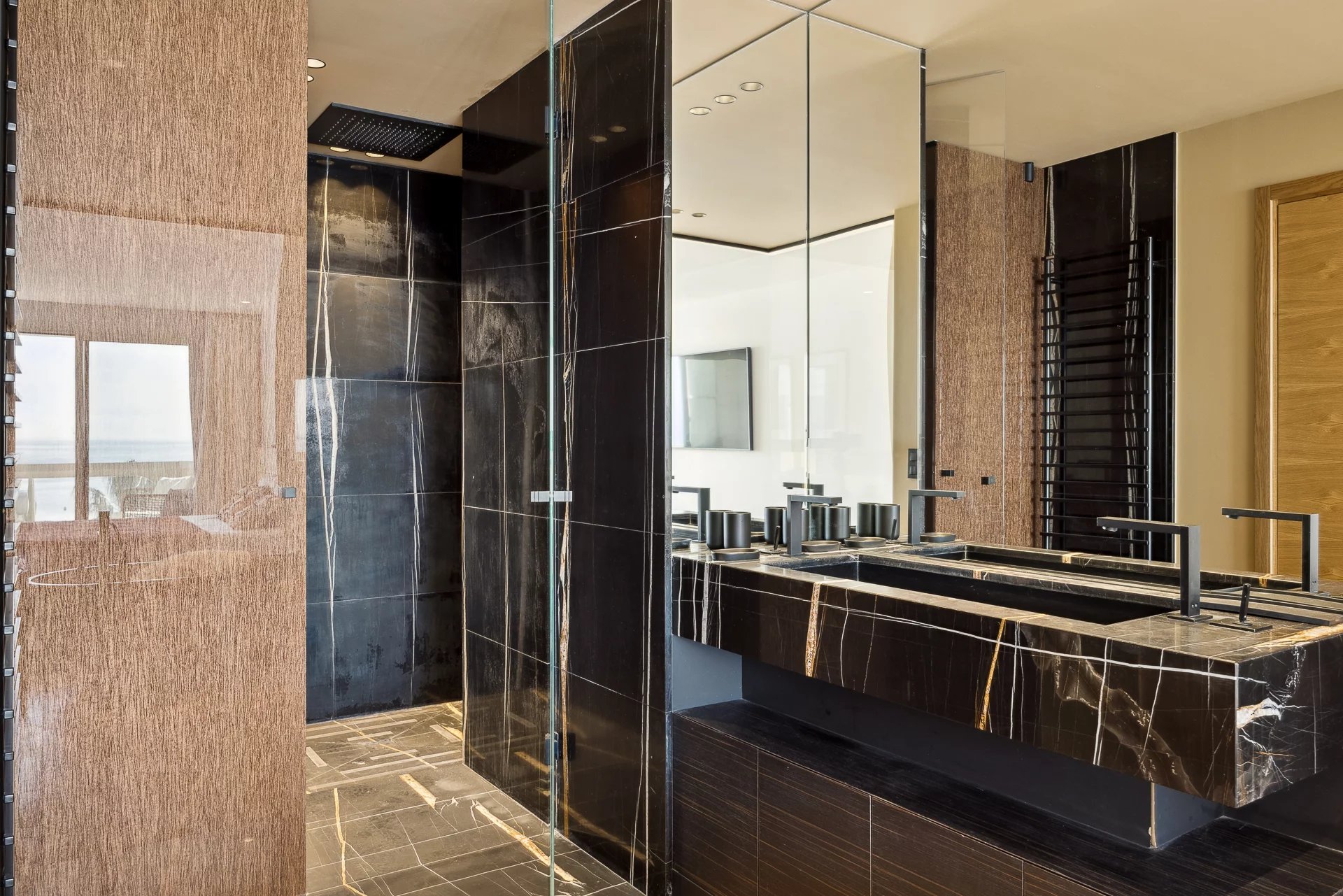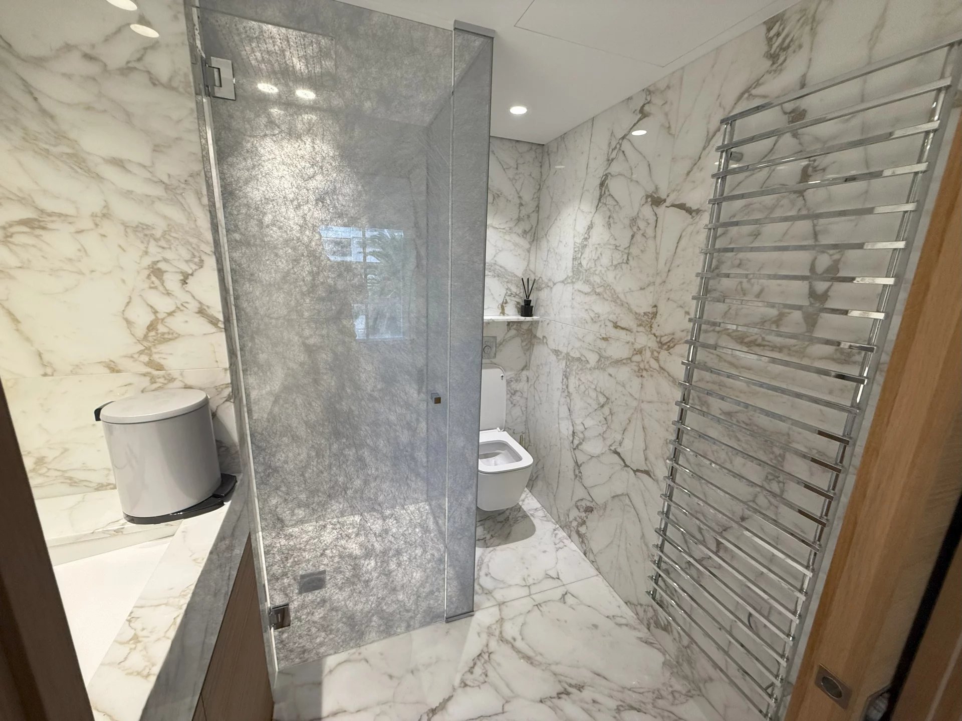 Die Wohnung ist wie folgt aufgeteilt: Eingangsbereich, großes Wohnzimmer mit voll ausgestatteter Küche, ein Schlafzimmer mit Duschbad und Toilette und ein Hauptschlafzimmer mit Ankleide und Badezimmer.