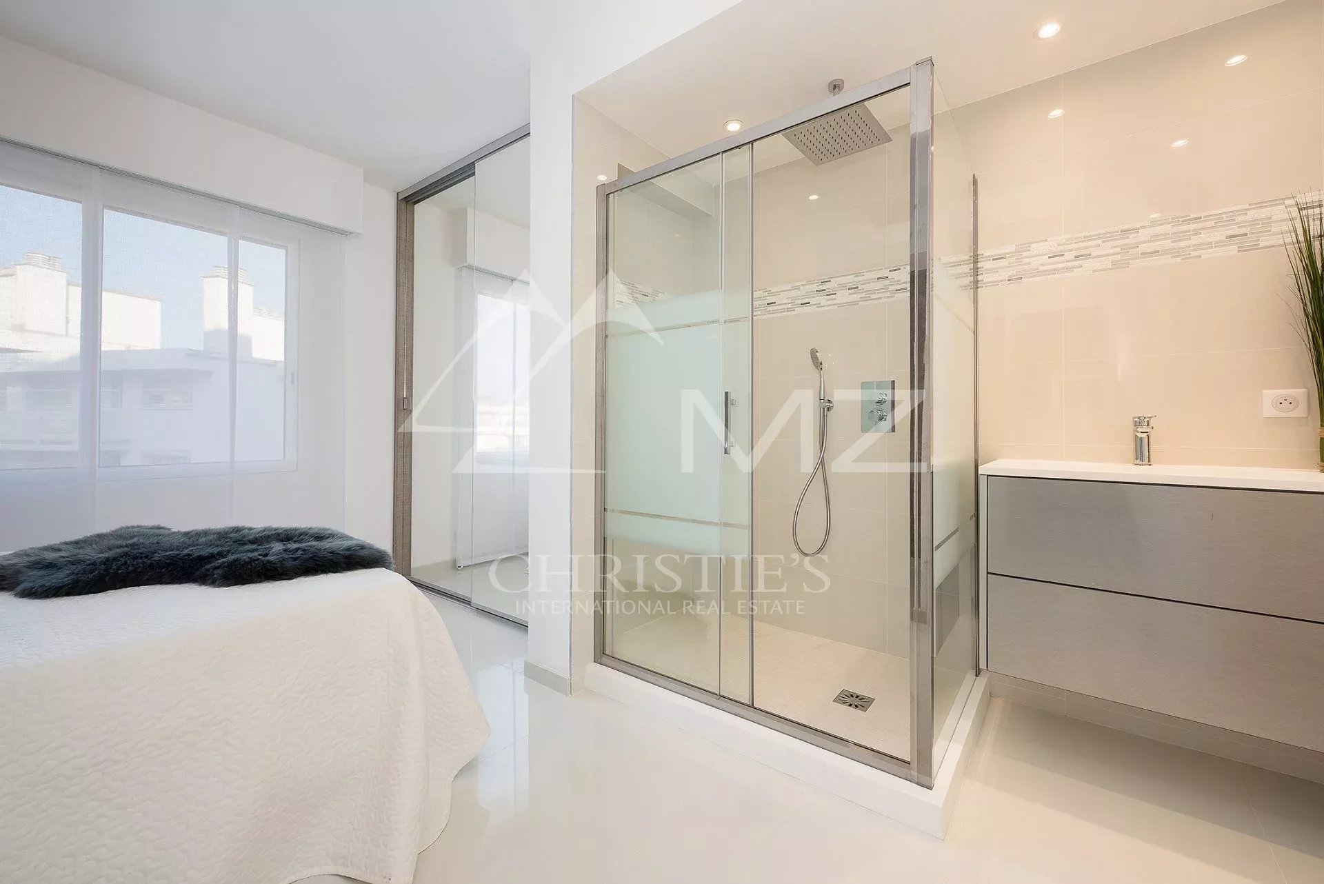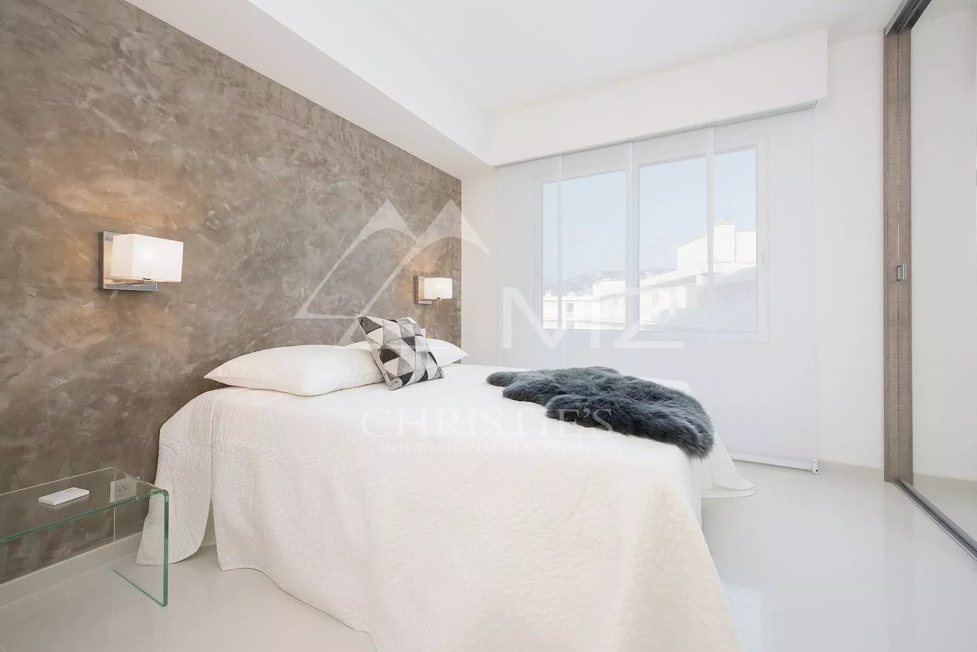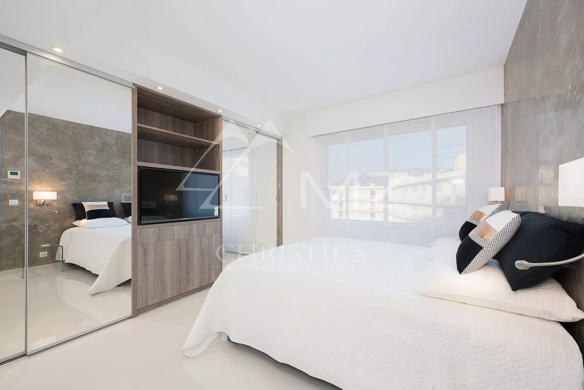 Auf der Croisette und in der Nähe des Palais des Festivals liegt diese wunderschöne Wohnung im Hochparterre von ca. 85m². Sie besteht aus: einer offenen Küche mit Wohnzimmer und Zugang zur Terrasse, zwei Schlafzimmern en suite mit Duschbad.