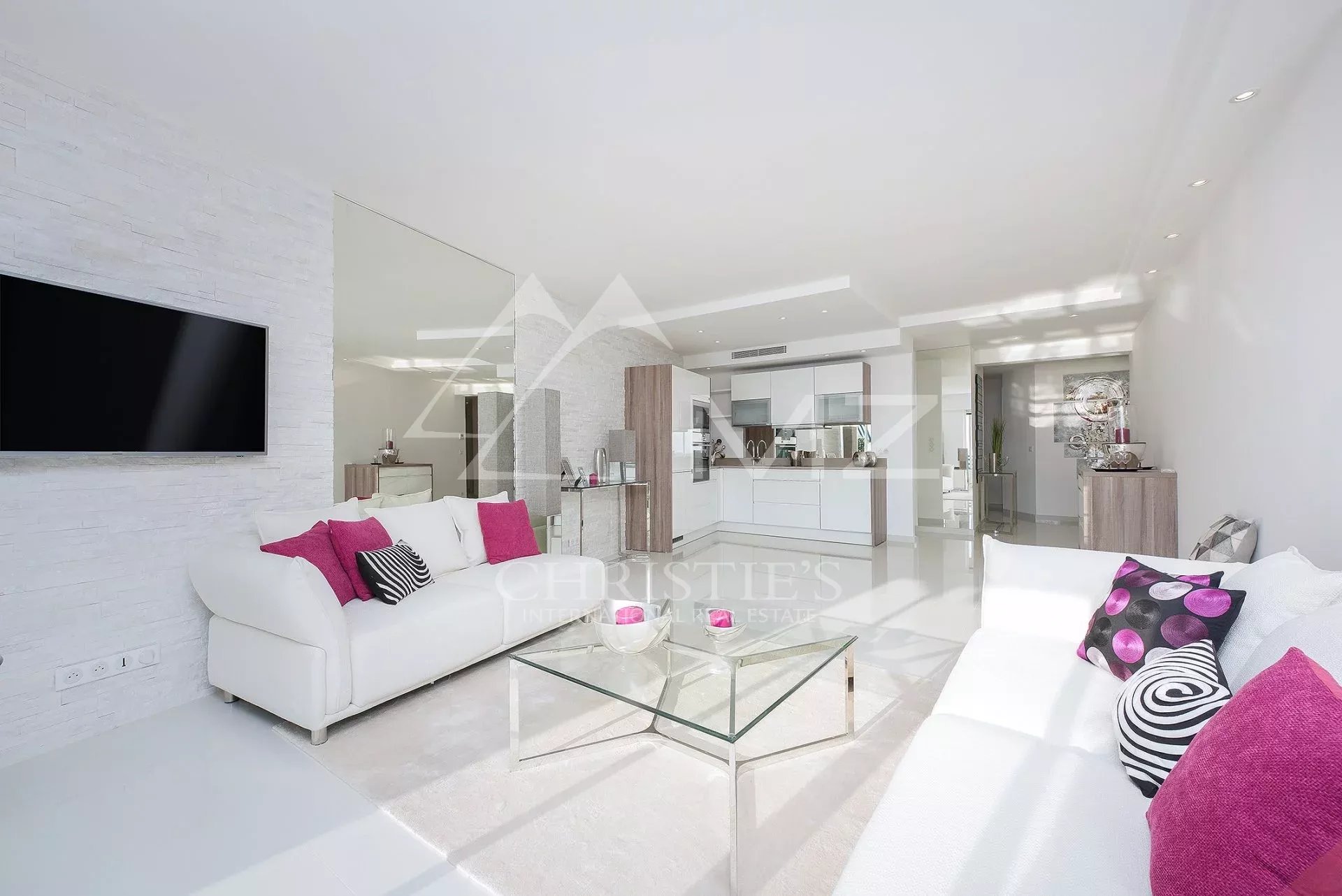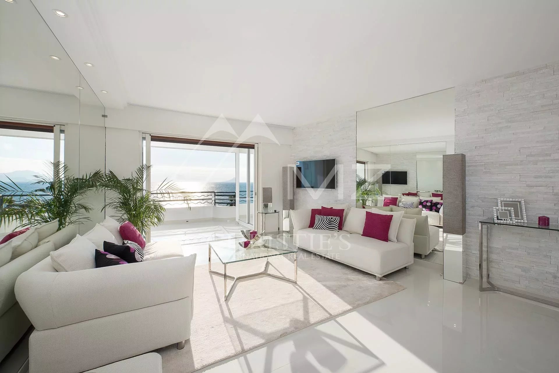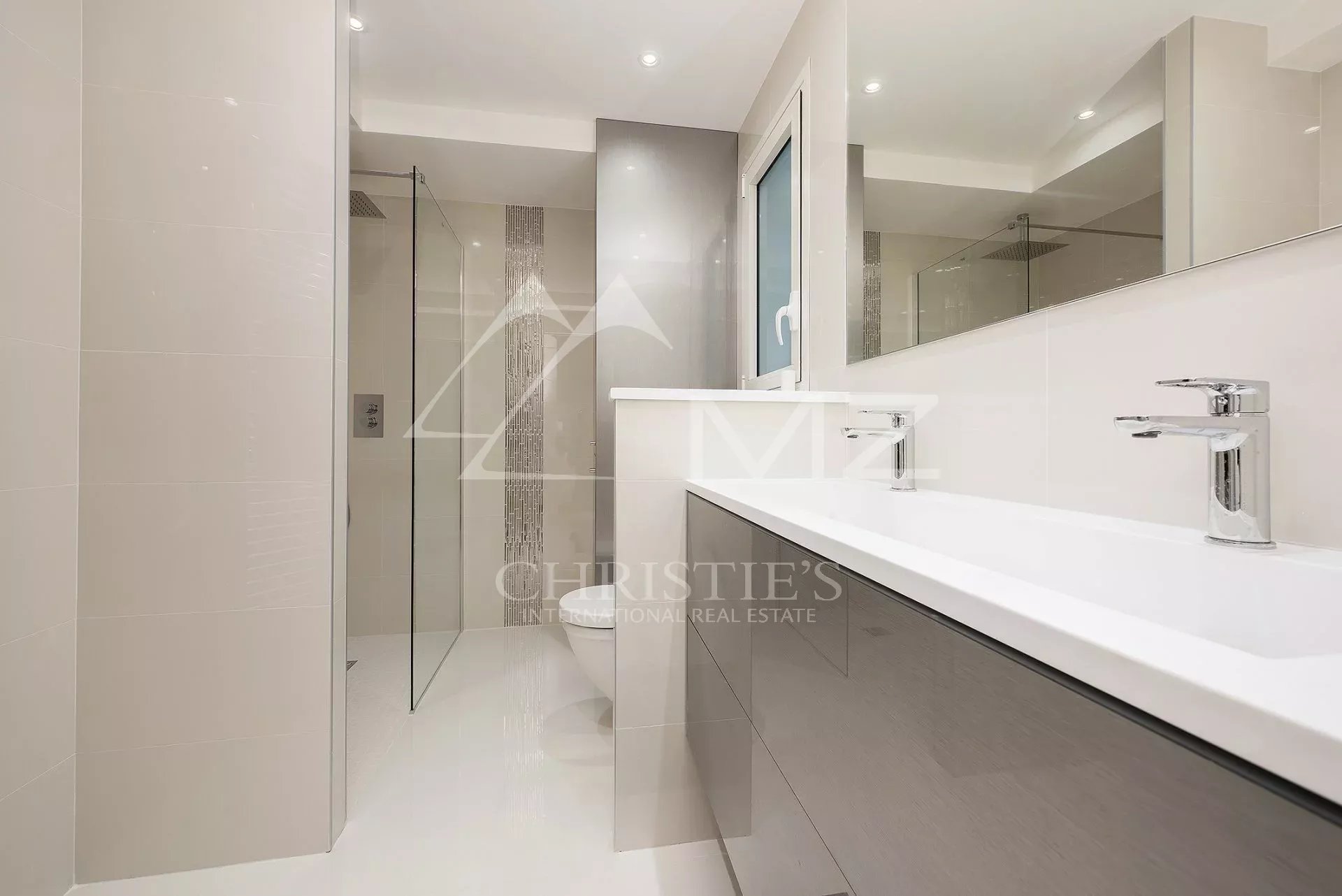 Auf der Croisette und in der Nähe des Palais des Festivals liegt diese wunderschöne Wohnung im Hochparterre von ca. 85m². Sie besteht aus: einer offenen Küche mit Wohnzimmer und Zugang zur Terrasse, zwei Schlafzimmern en suite mit Duschbad.