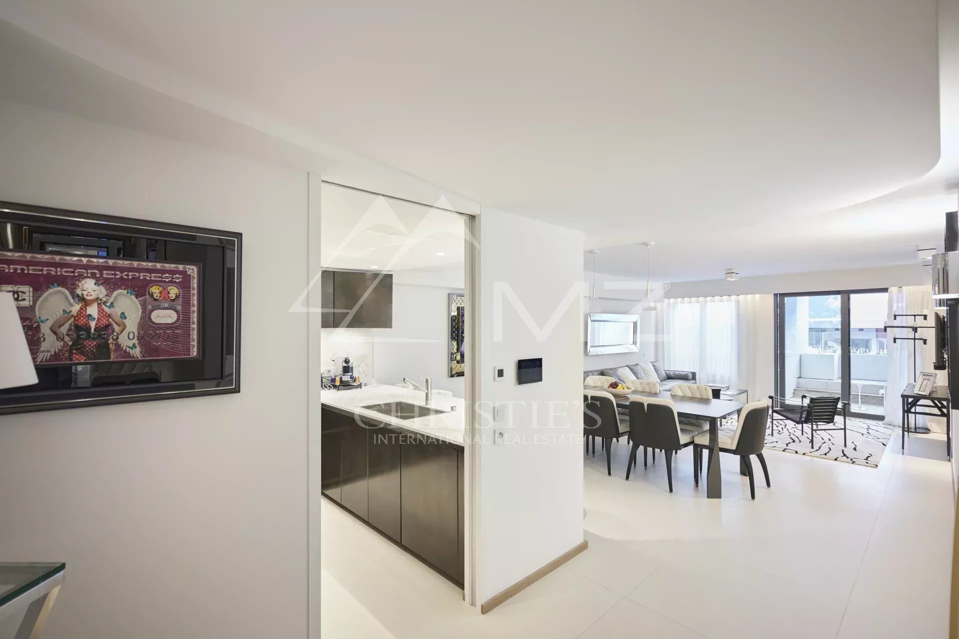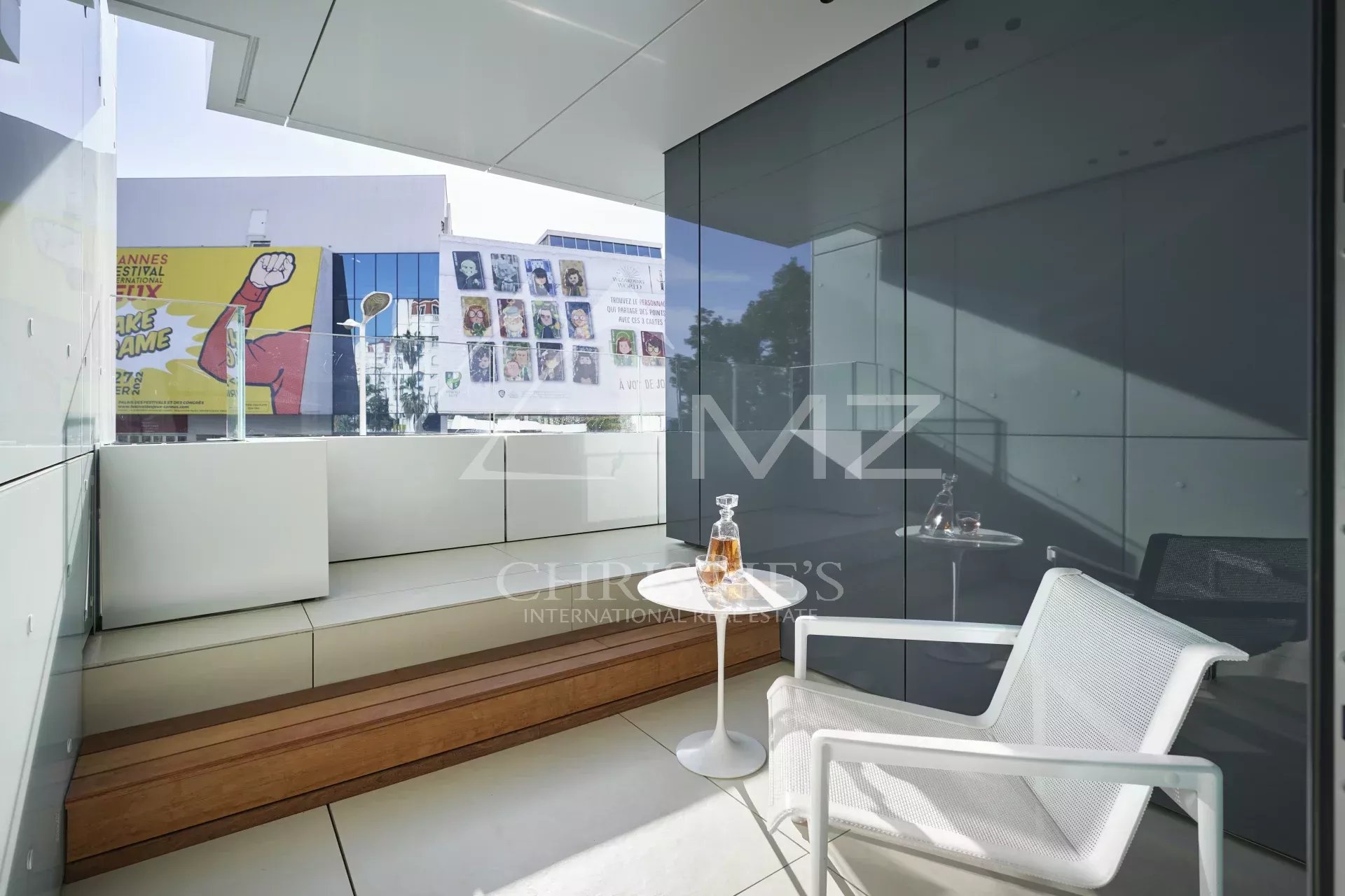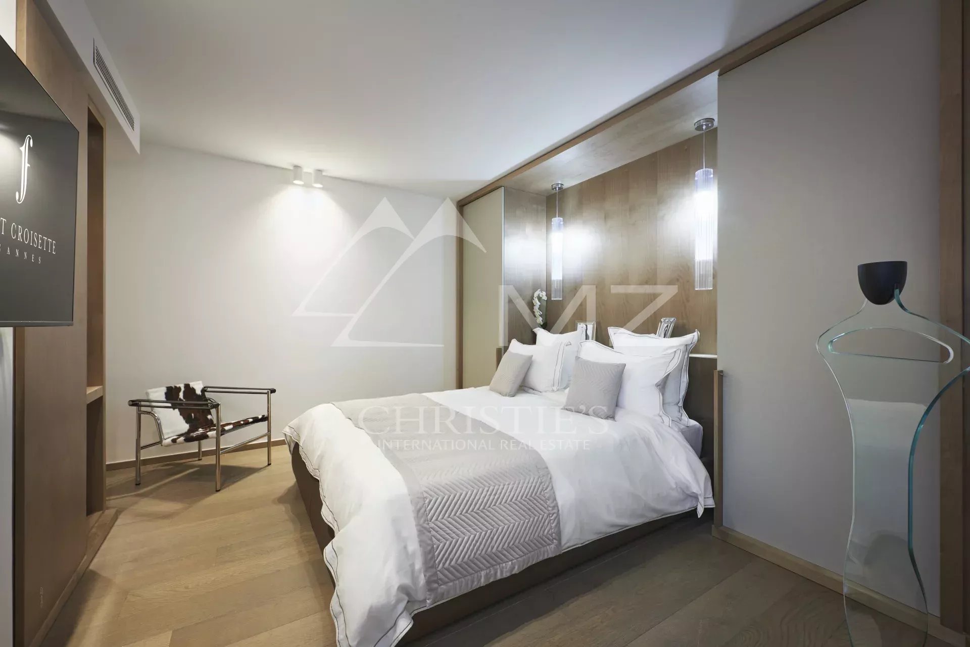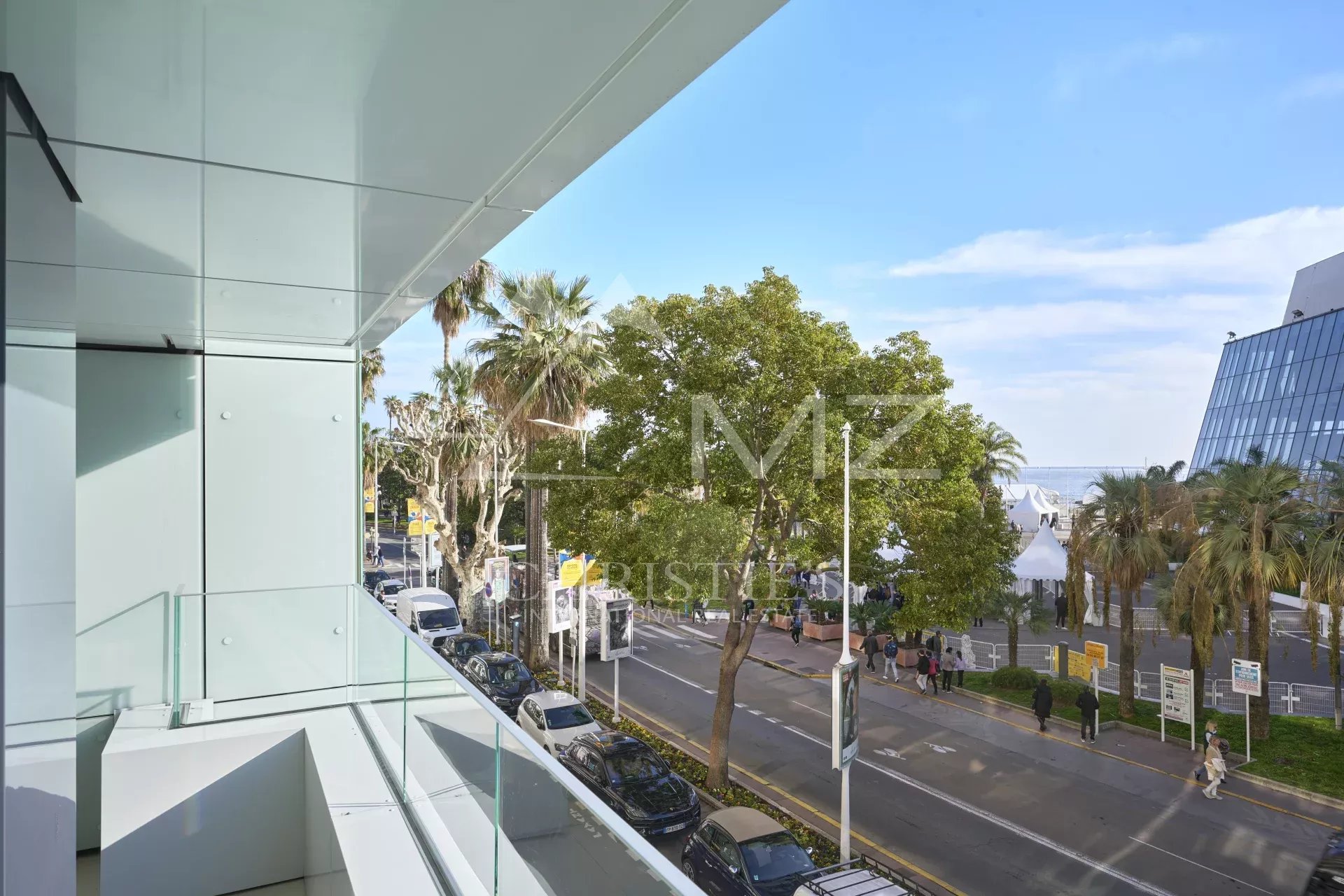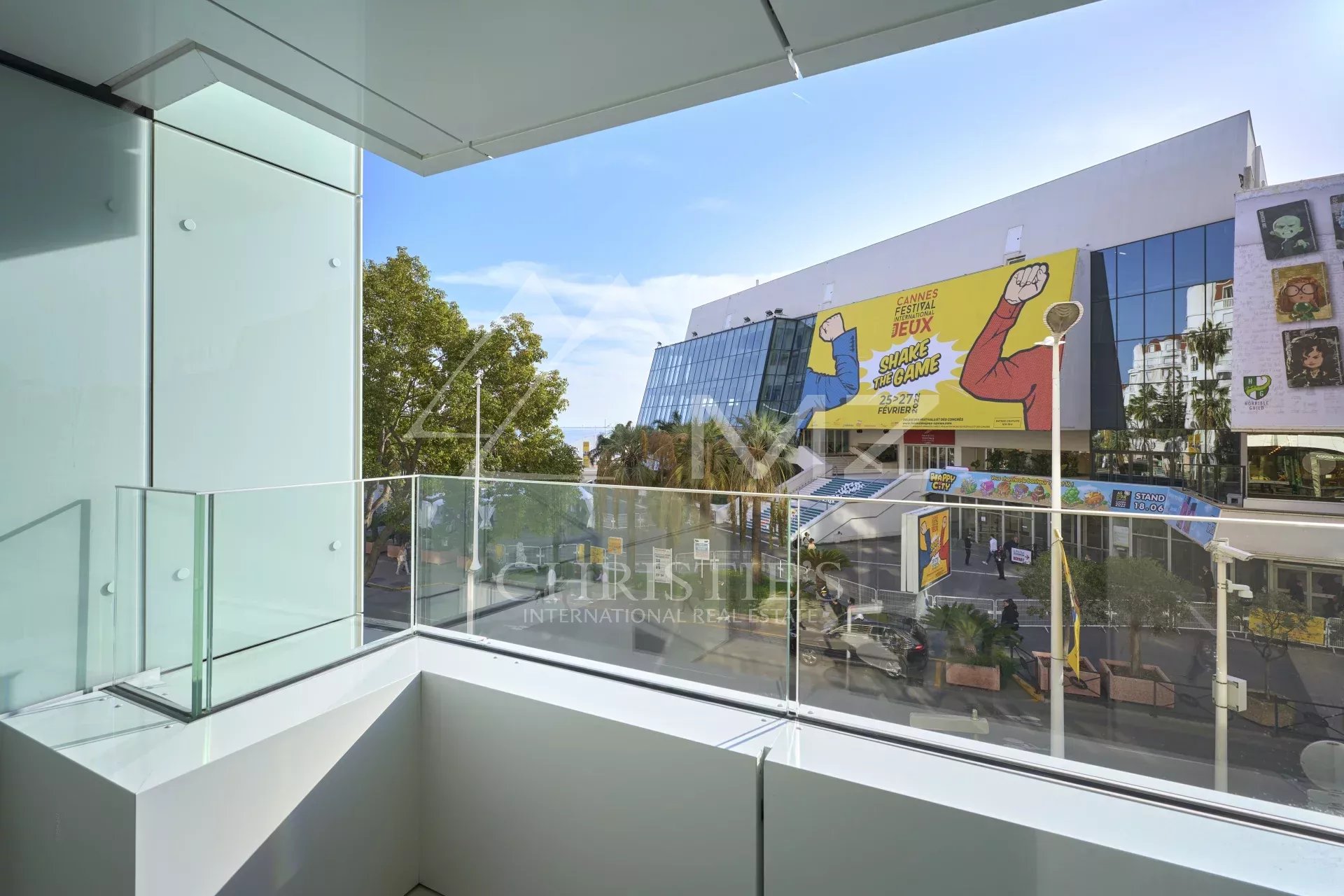 203 - Situé dans un immeuble neuf de la Croisette, en face du Palais des festivals, appartement de 114m² environ, comprenant : un séjour, une salle à manger, une cuisine équipée, une chambre en suite avec salle de douche et une chambre de maitre avec salle de bains/douche. Service conciergerie sur place. Idéal congrès et vacances.