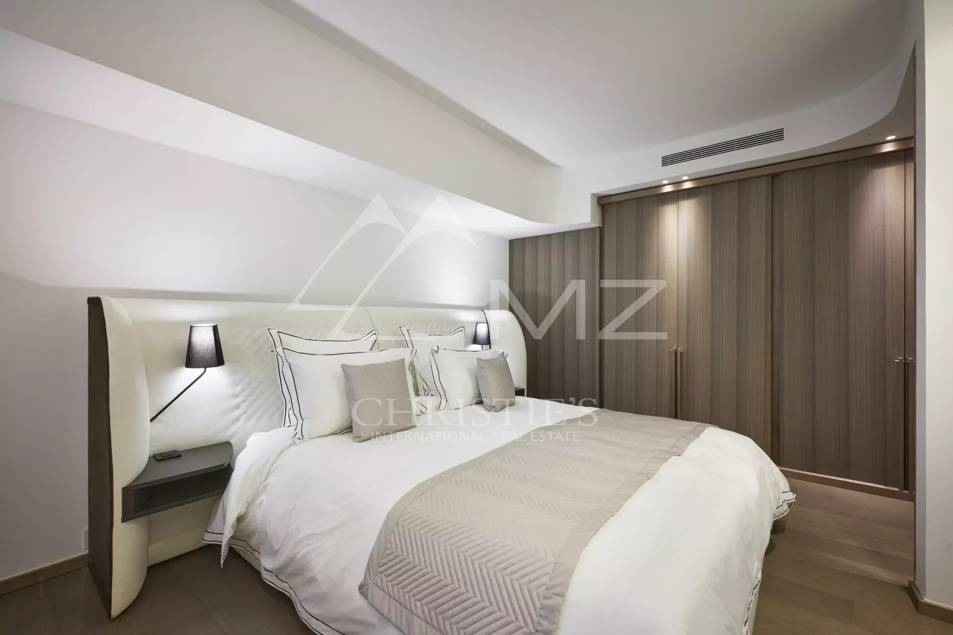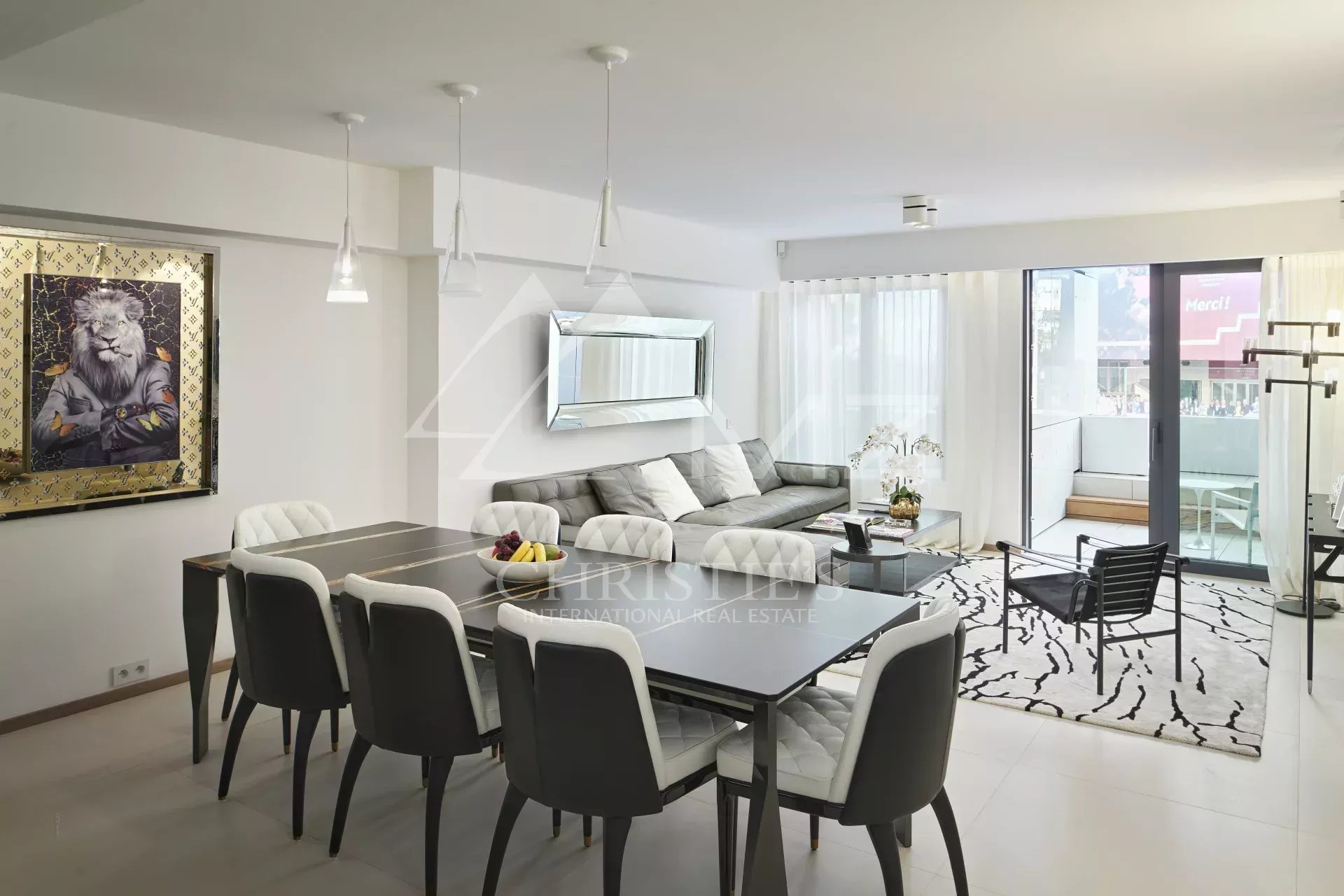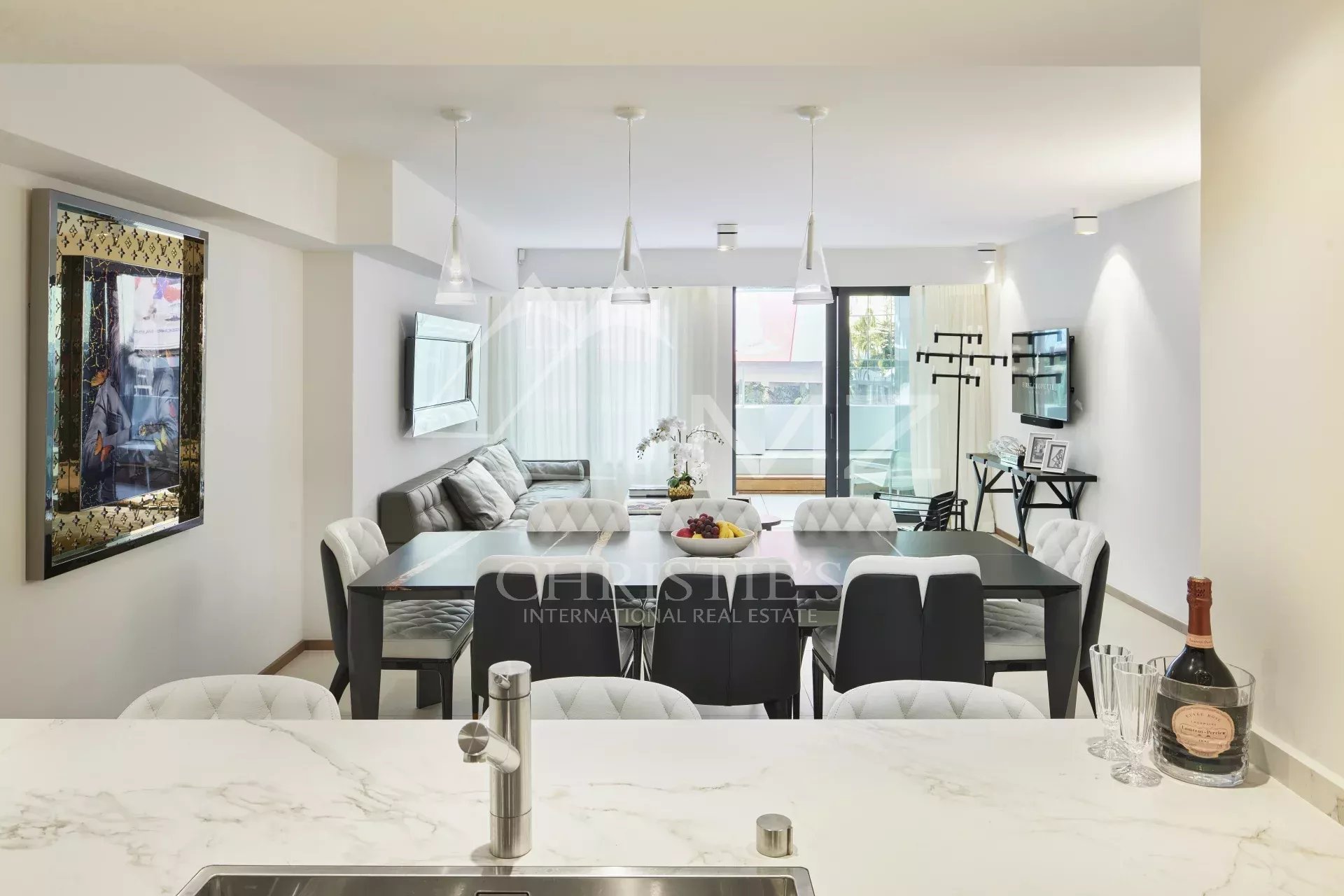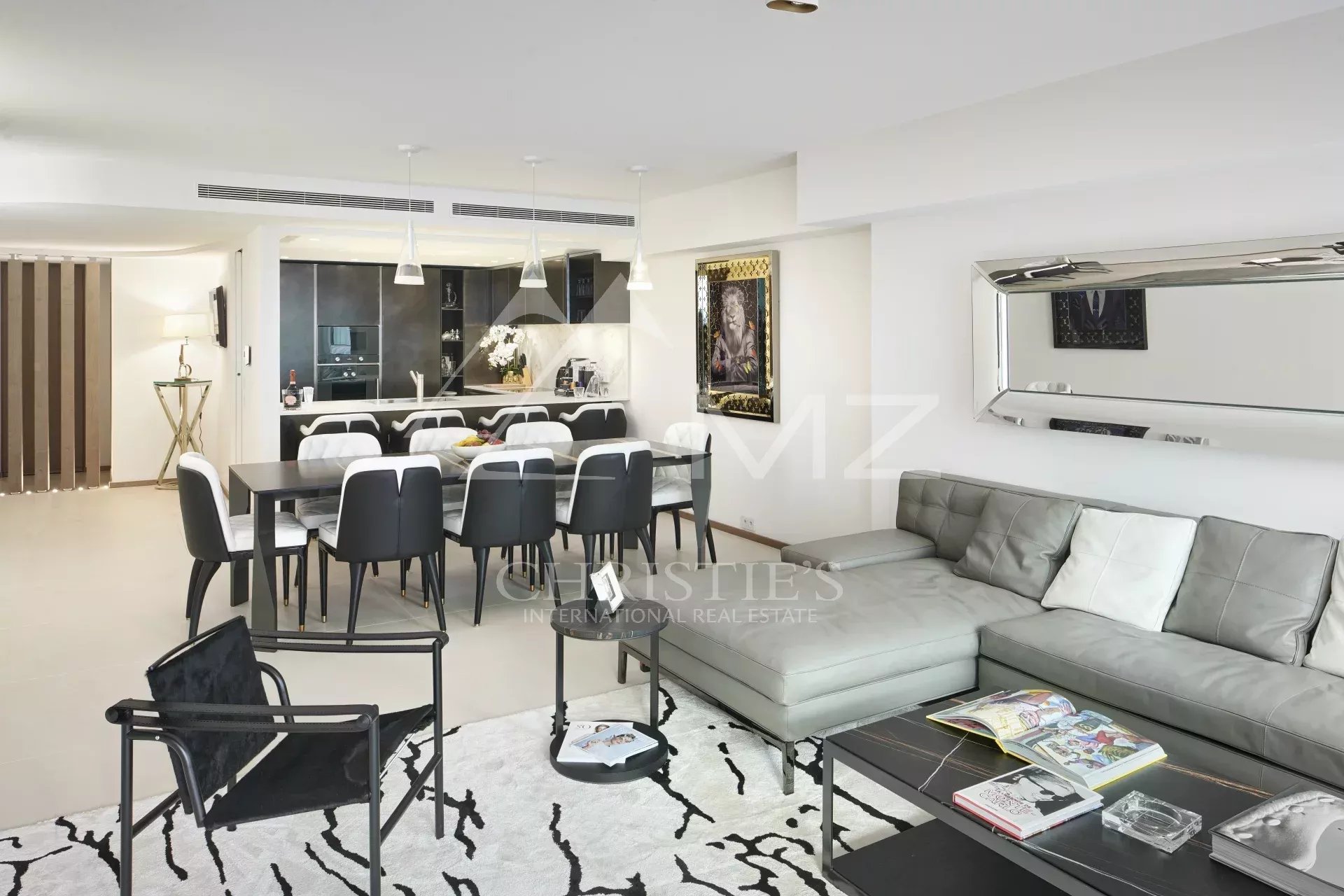 203 - Situé dans un immeuble neuf de la Croisette, en face du Palais des festivals, appartement de 114m² environ, comprenant : un séjour, une salle à manger, une cuisine équipée, une chambre en suite avec salle de douche et une chambre de maitre avec salle de bains/douche. Service conciergerie sur place. Idéal congrès et vacances.