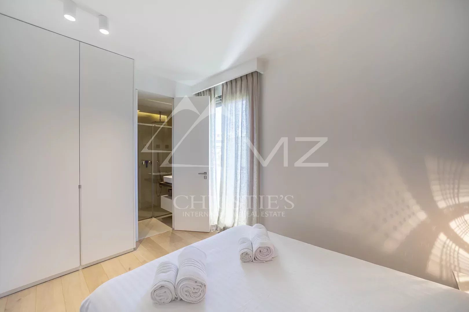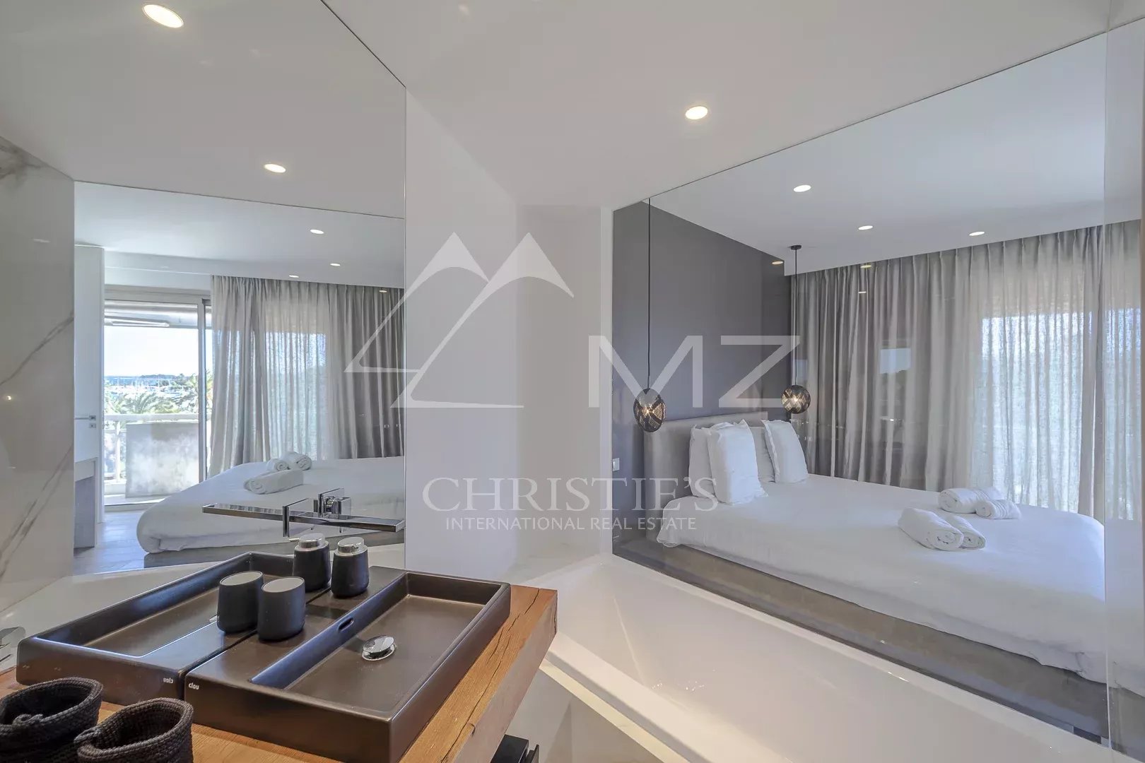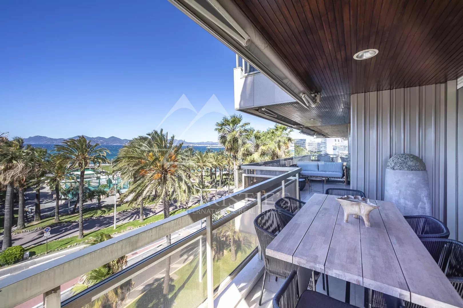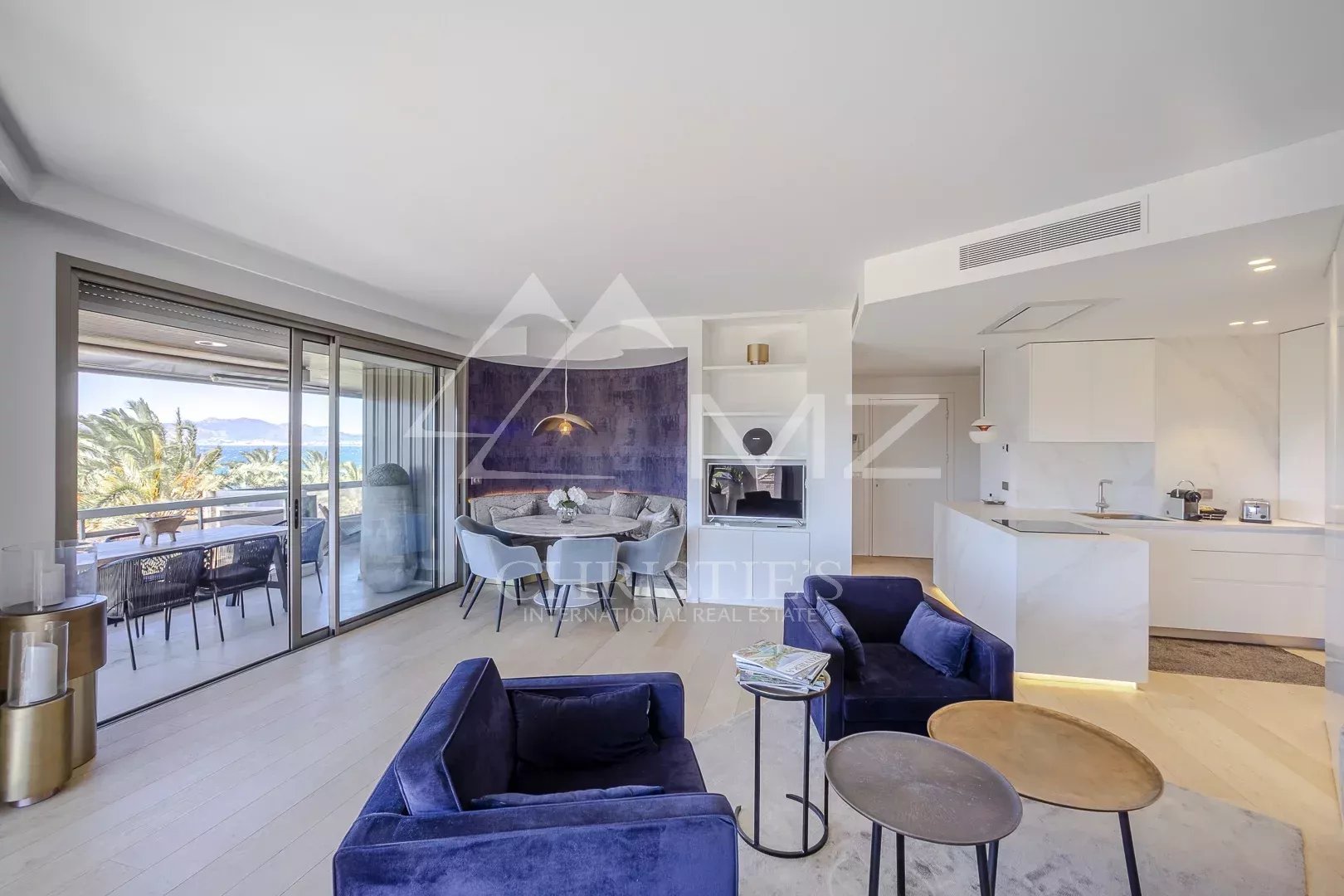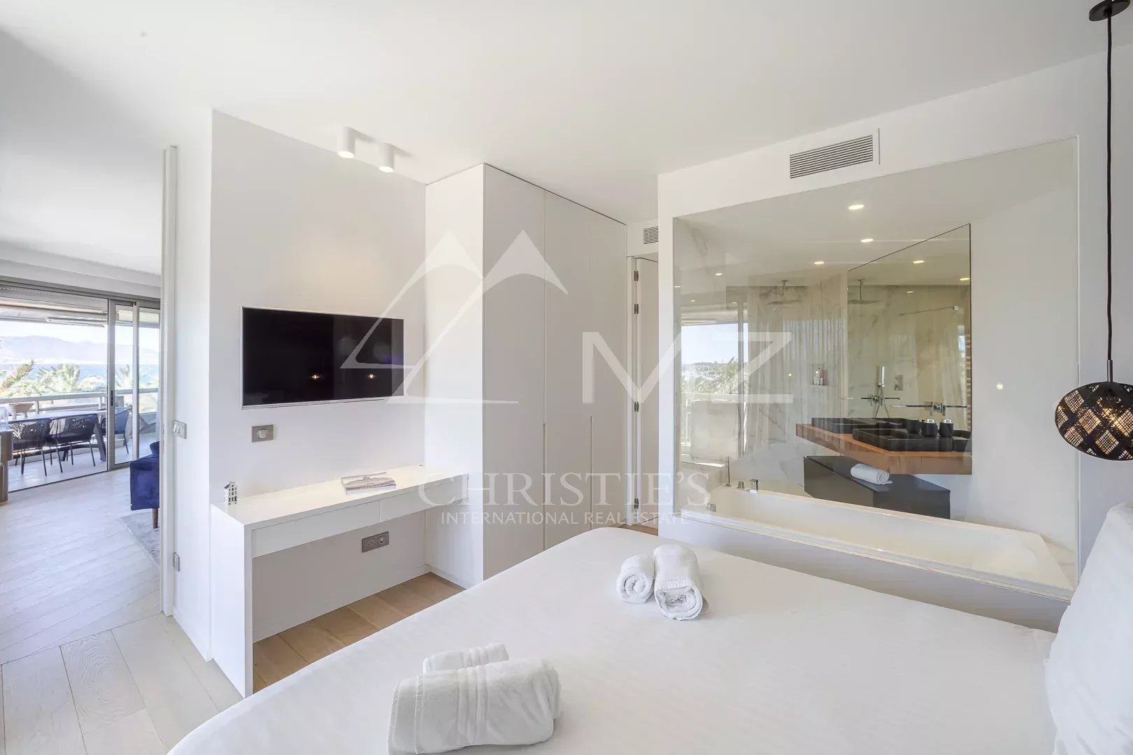 Wunderschöne, komplett renovierte Wohnung von 95 m², bestehend aus: einem Wohnzimmer mit Esszimmer und offener Einbauküche, zwei Schlafzimmern en suite mit Duschbad und einem Hauptschlafzimmer mit Bad/Dusche. Große Terrasse mit Meerblick, Lounge und Esszimmer im Freien. Zu Fuß zu den Stränden und dem Palais des Festivals.