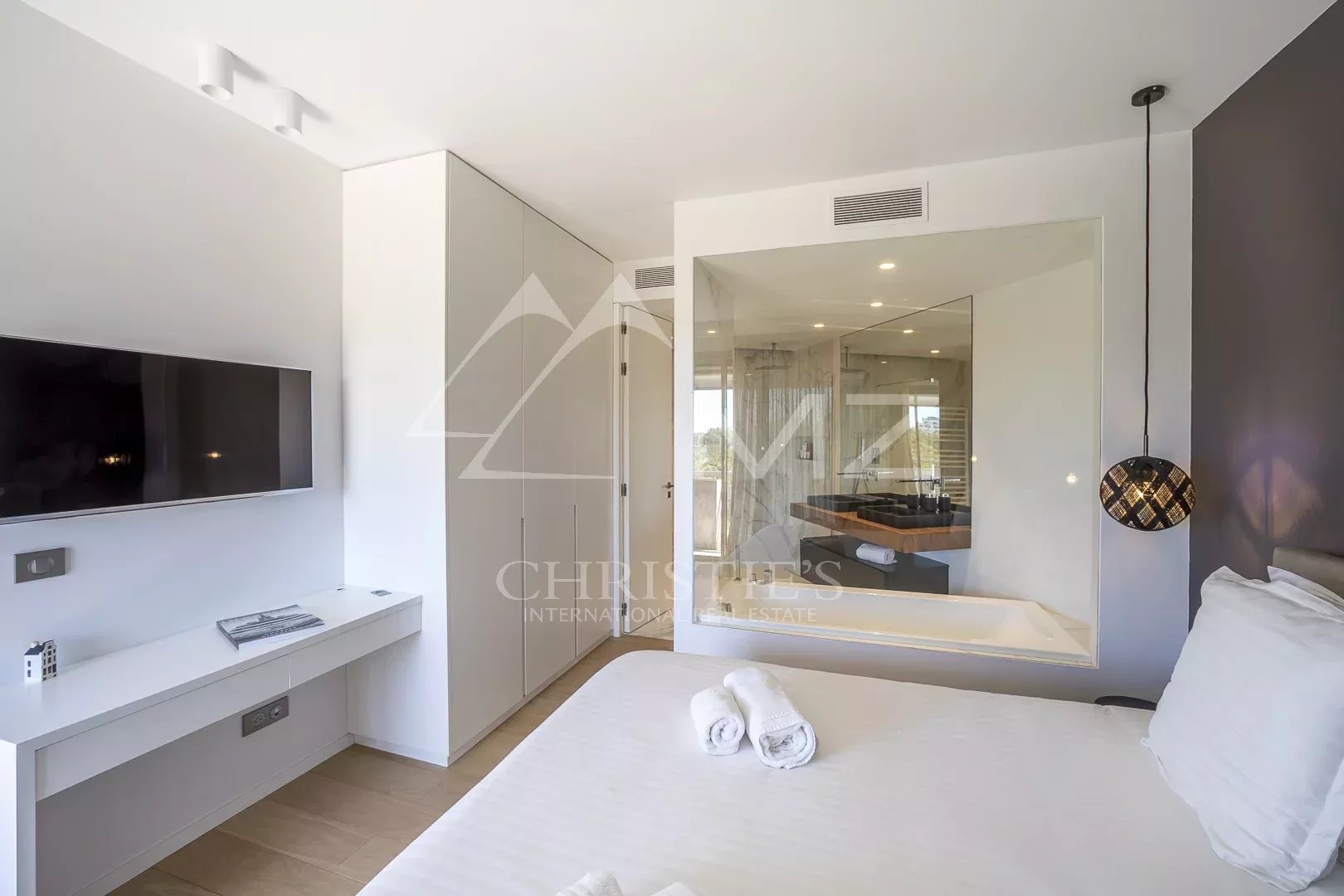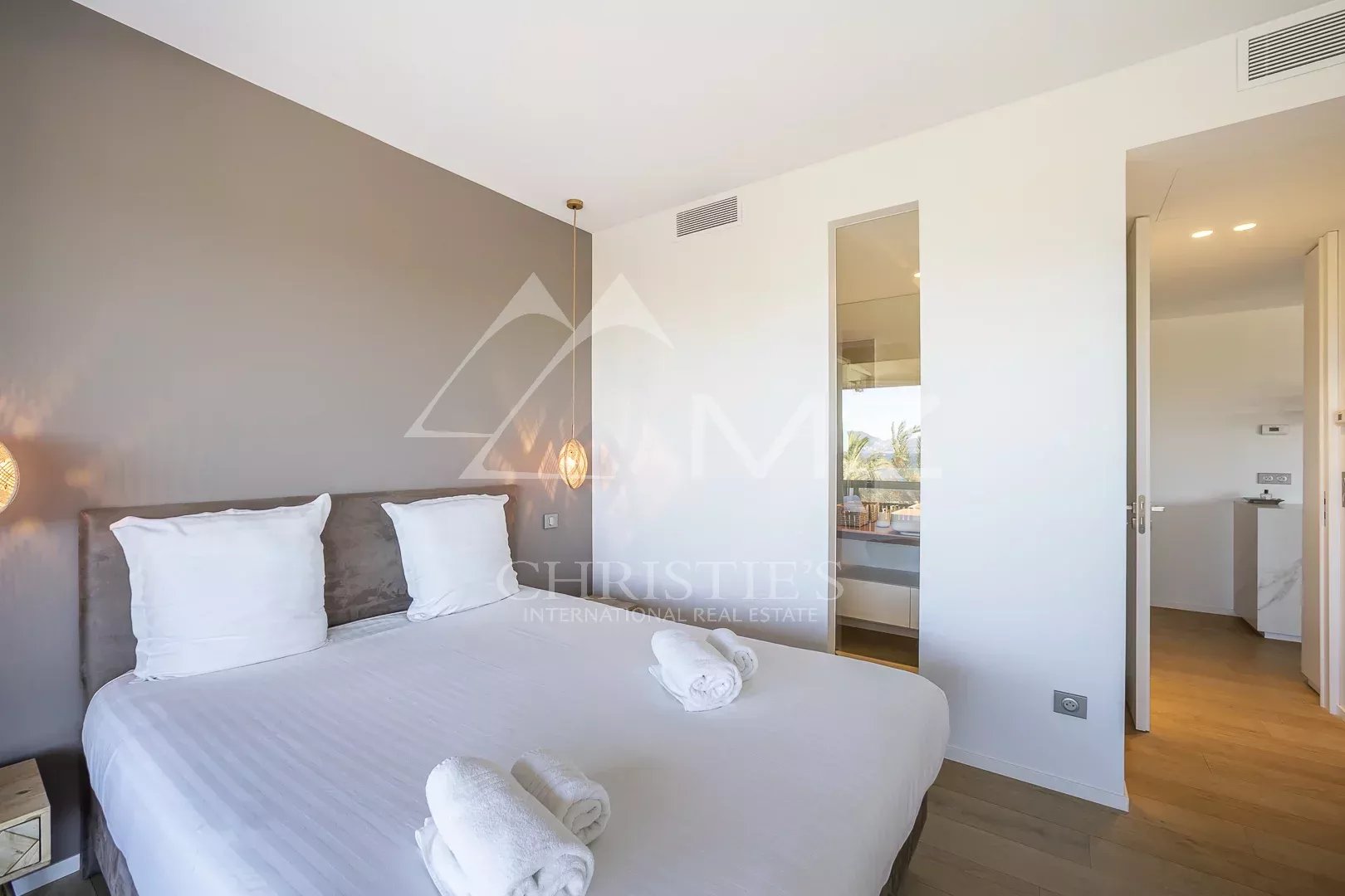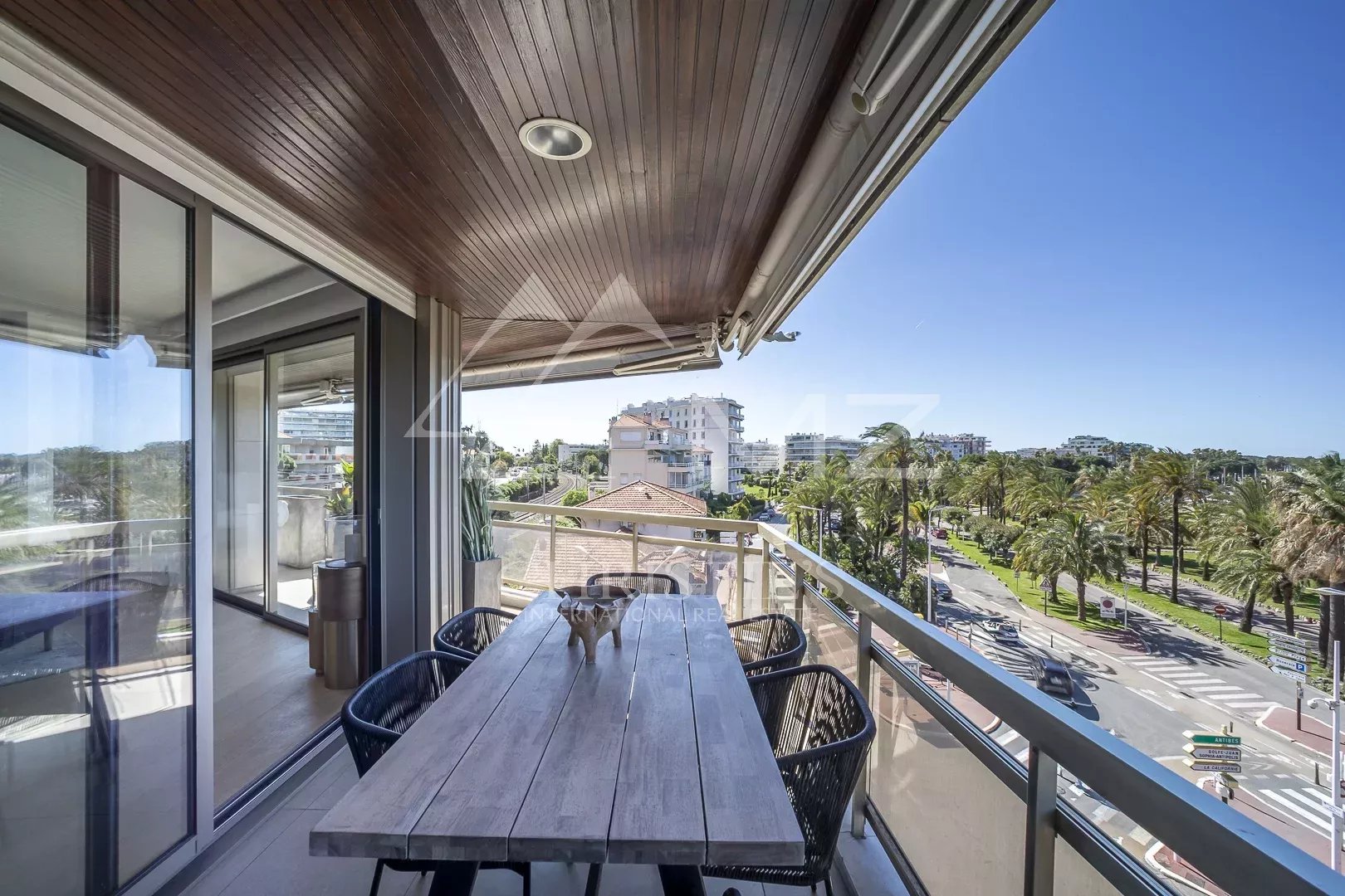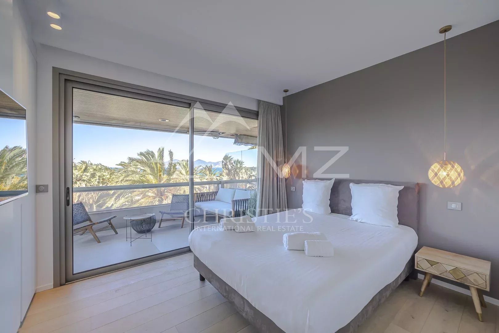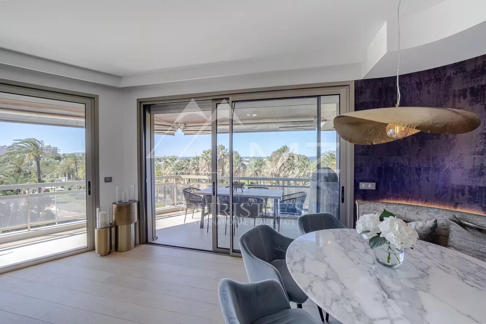 Wunderschöne, komplett renovierte Wohnung von 95 m², bestehend aus: einem Wohnzimmer mit Esszimmer und offener Einbauküche, zwei Schlafzimmern en suite mit Duschbad und einem Hauptschlafzimmer mit Bad/Dusche. Große Terrasse mit Meerblick, Lounge und Esszimmer im Freien. Zu Fuß zu den Stränden und dem Palais des Festivals.