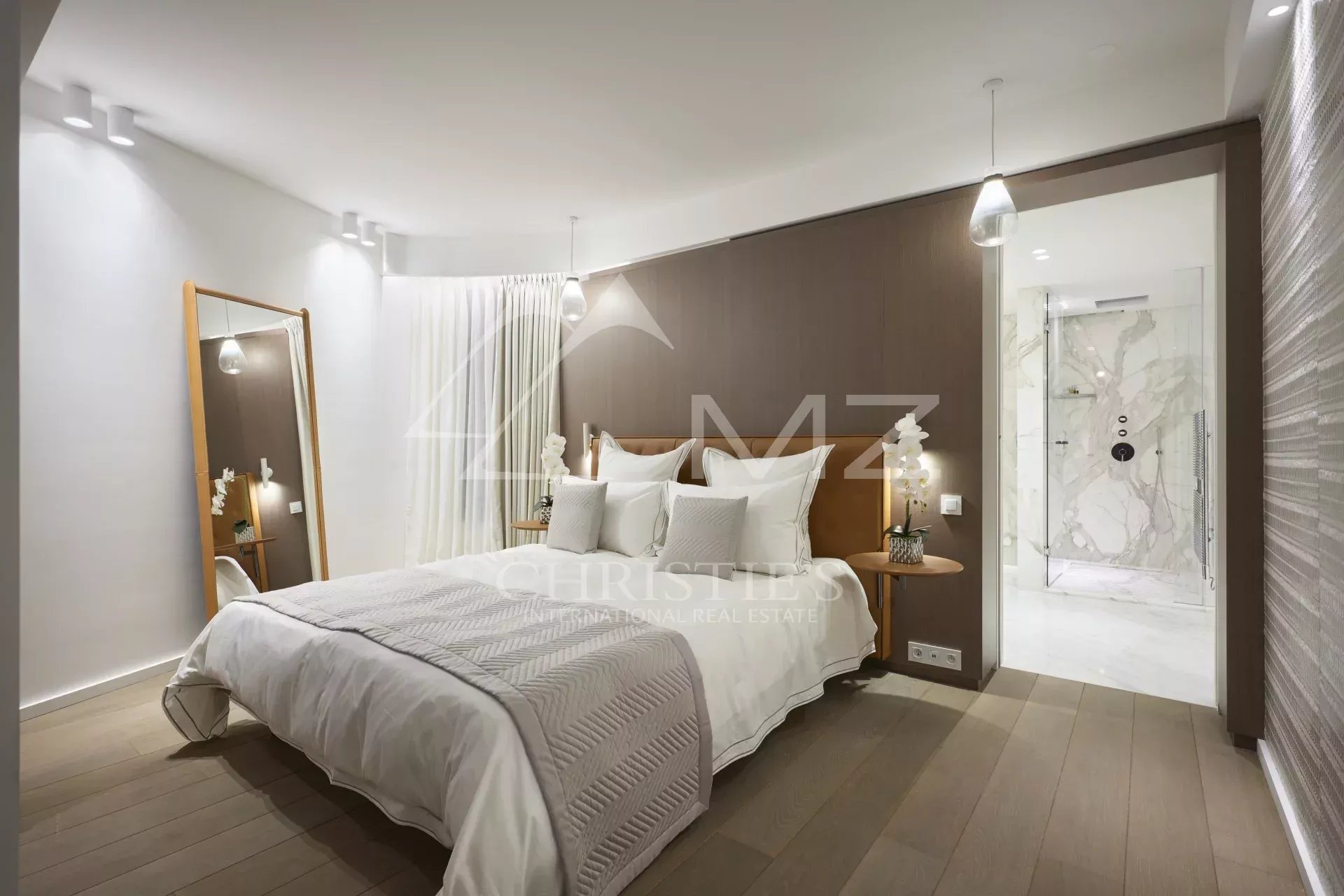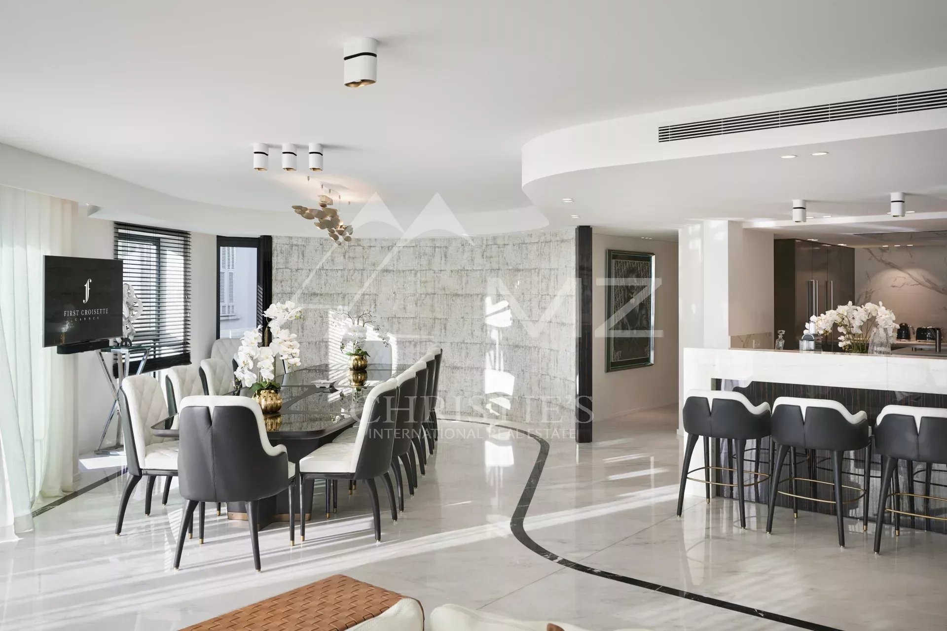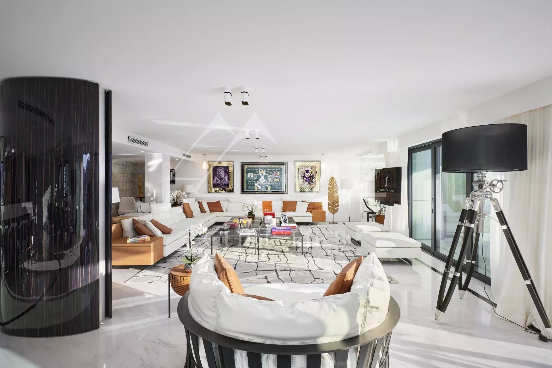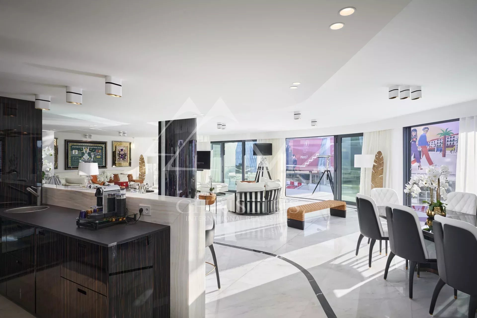 300 - In einem neuen Gebäude auf der Croisette, gegenüber dem Palais des Festivals, befindet sich ein luxuriöses Appartement von ca. 395m², bestehend aus: einem Wohnzimmer, einem Esszimmer, einer Einbauküche, drei Schlafzimmern en suite mit Bad/Dusche, zwei Schlafzimmern en suite mit Duschbad und einem Hauptschlafzimmer mit Ankleide und Bad/Dusche. Concierge-Service vor Ort. Ideal für Kongresse und Ferien. Terrasse von 38 m².