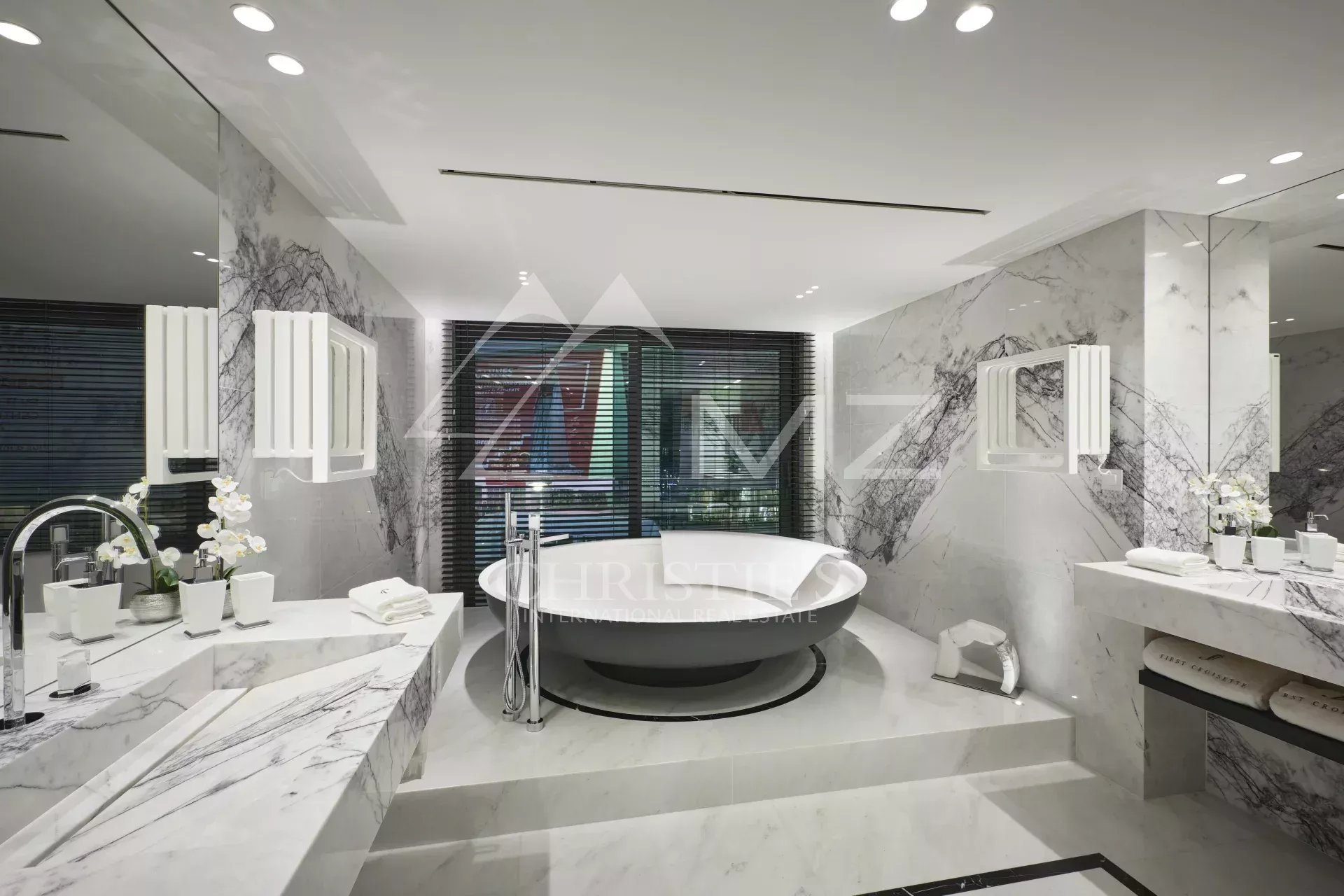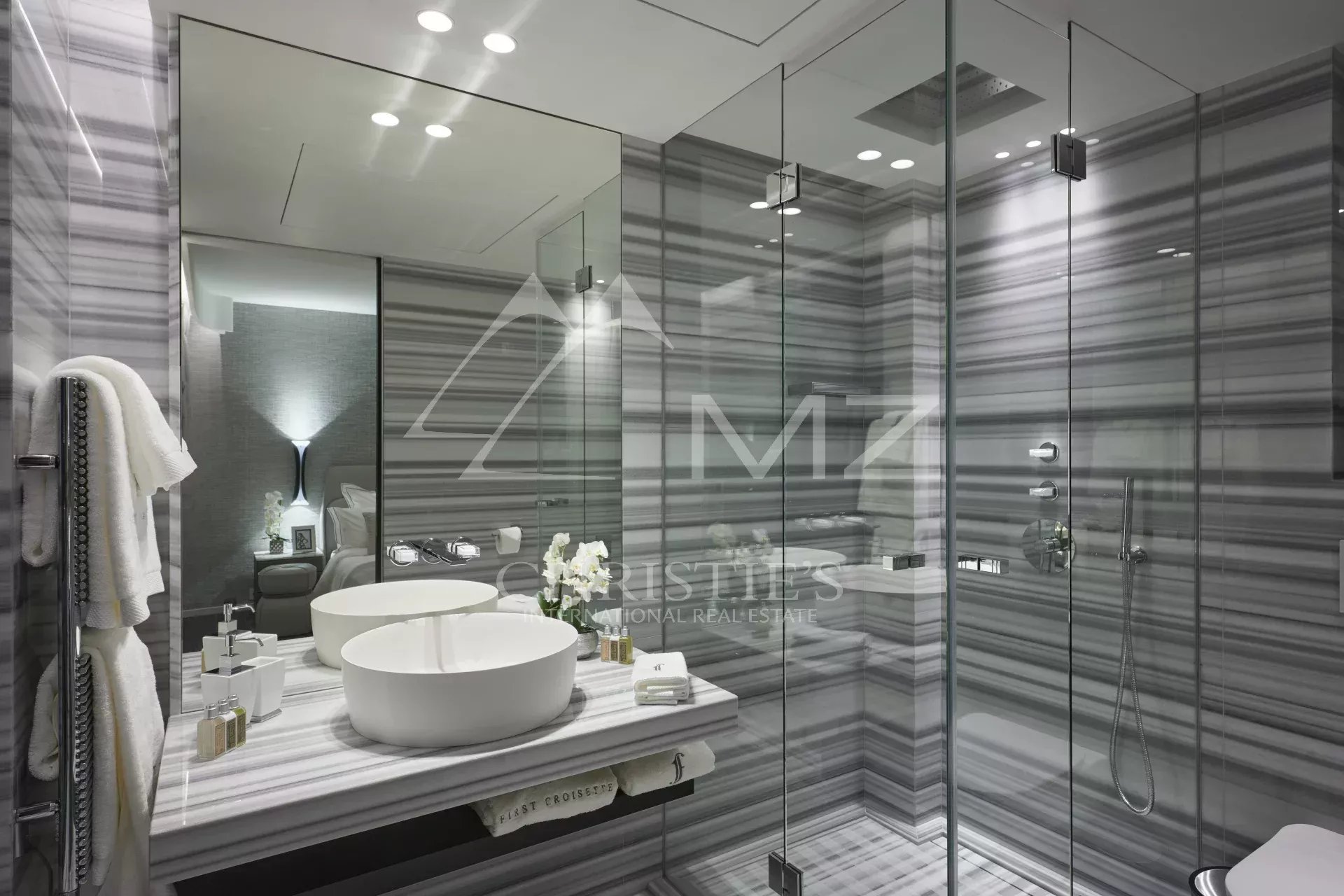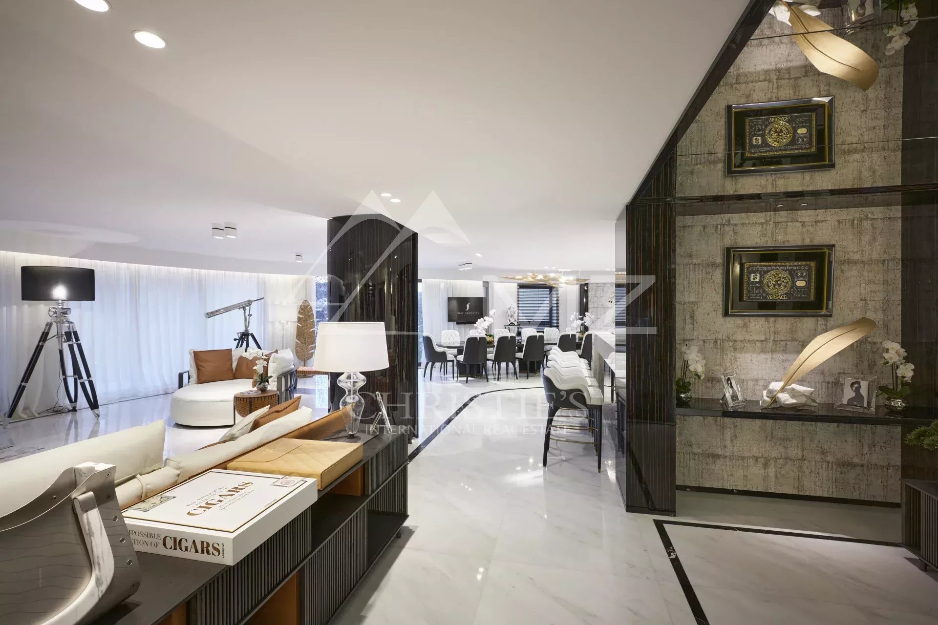 300 - In einem neuen Gebäude auf der Croisette, gegenüber dem Palais des Festivals, befindet sich ein luxuriöses Appartement von ca. 395m², bestehend aus: einem Wohnzimmer, einem Esszimmer, einer Einbauküche, drei Schlafzimmern en suite mit Bad/Dusche, zwei Schlafzimmern en suite mit Duschbad und einem Hauptschlafzimmer mit Ankleide und Bad/Dusche. Concierge-Service vor Ort. Ideal für Kongresse und Ferien. Terrasse von 38 m².