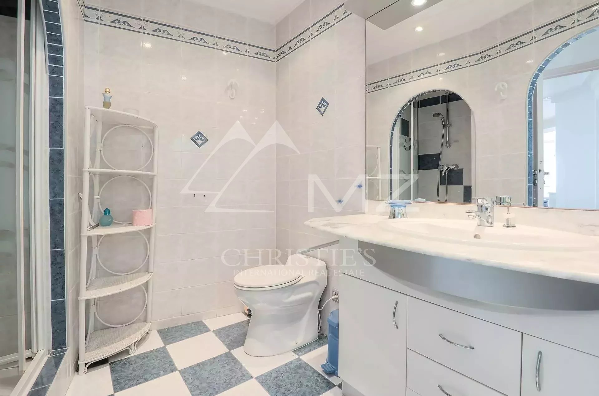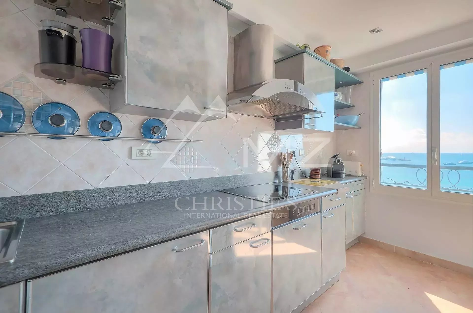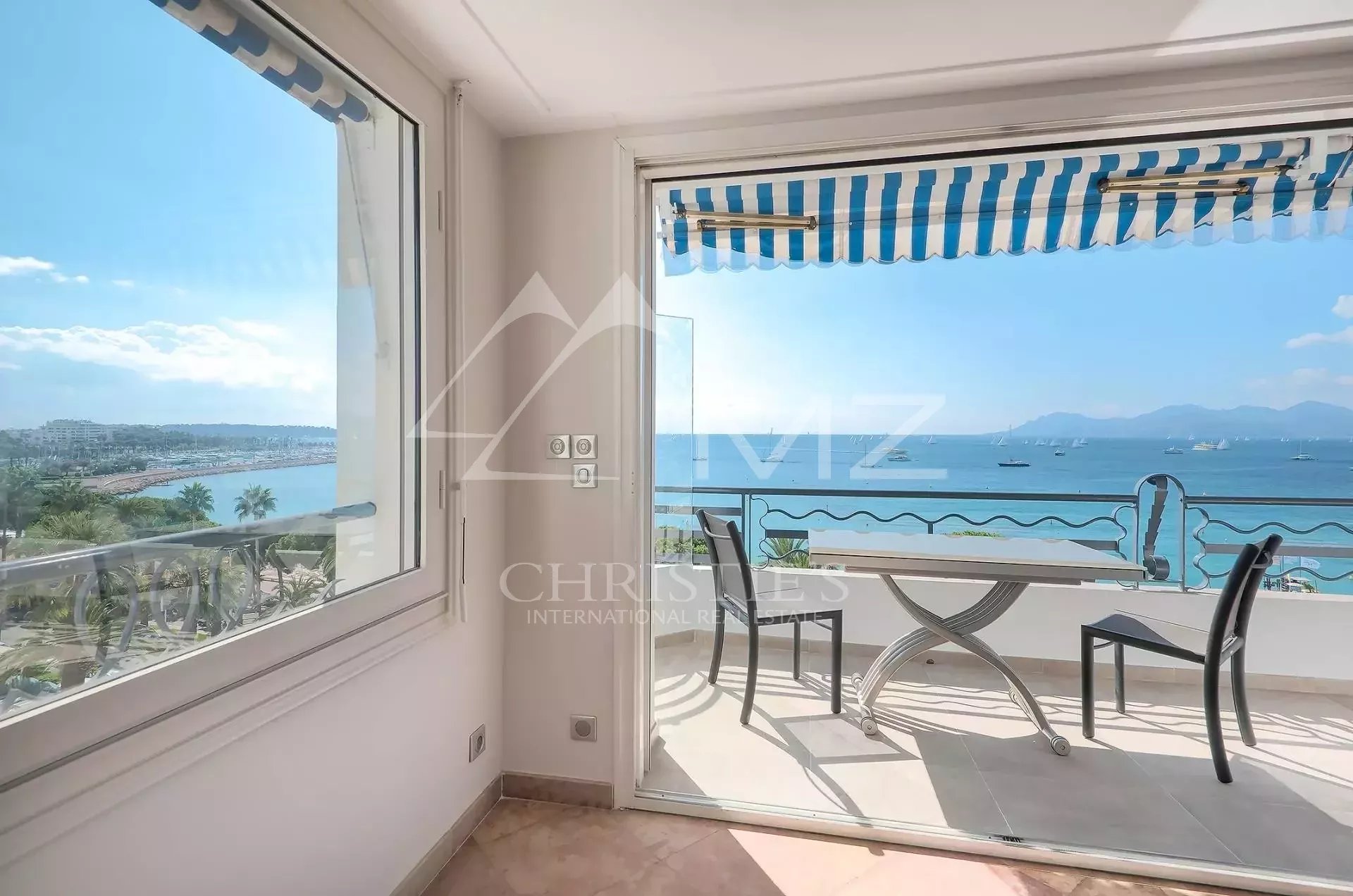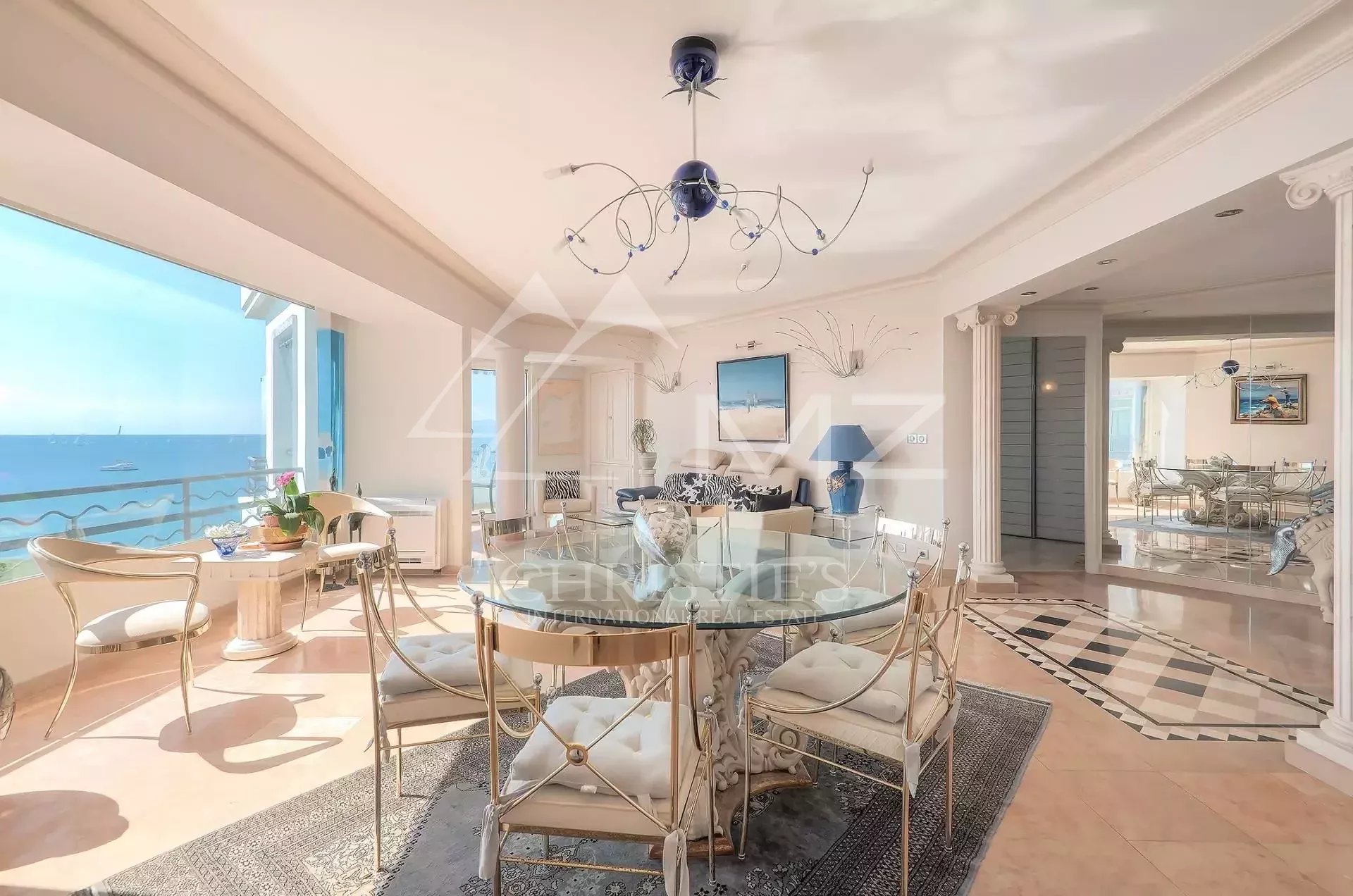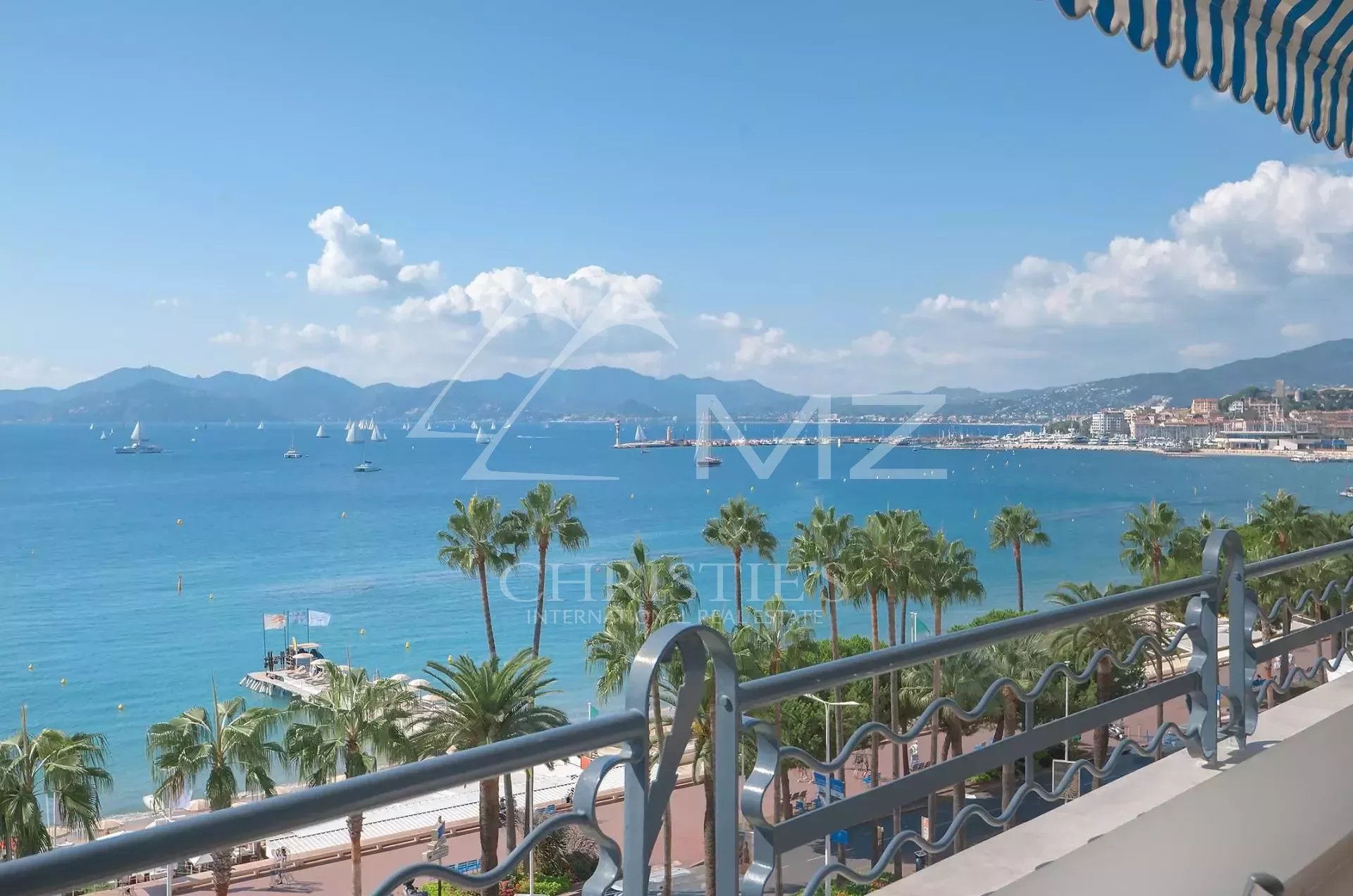 Ideale Lage, schöne Wohnung an der Croisette von 130 m², bestehend aus: Wohnzimmer mit Zugang zur Terrasse und Meerblick, Einbauküche, zwei Schlafzimmer en suite mit Duschbad und ein Schlafzimmer mit Zugang zur Terrasse.
