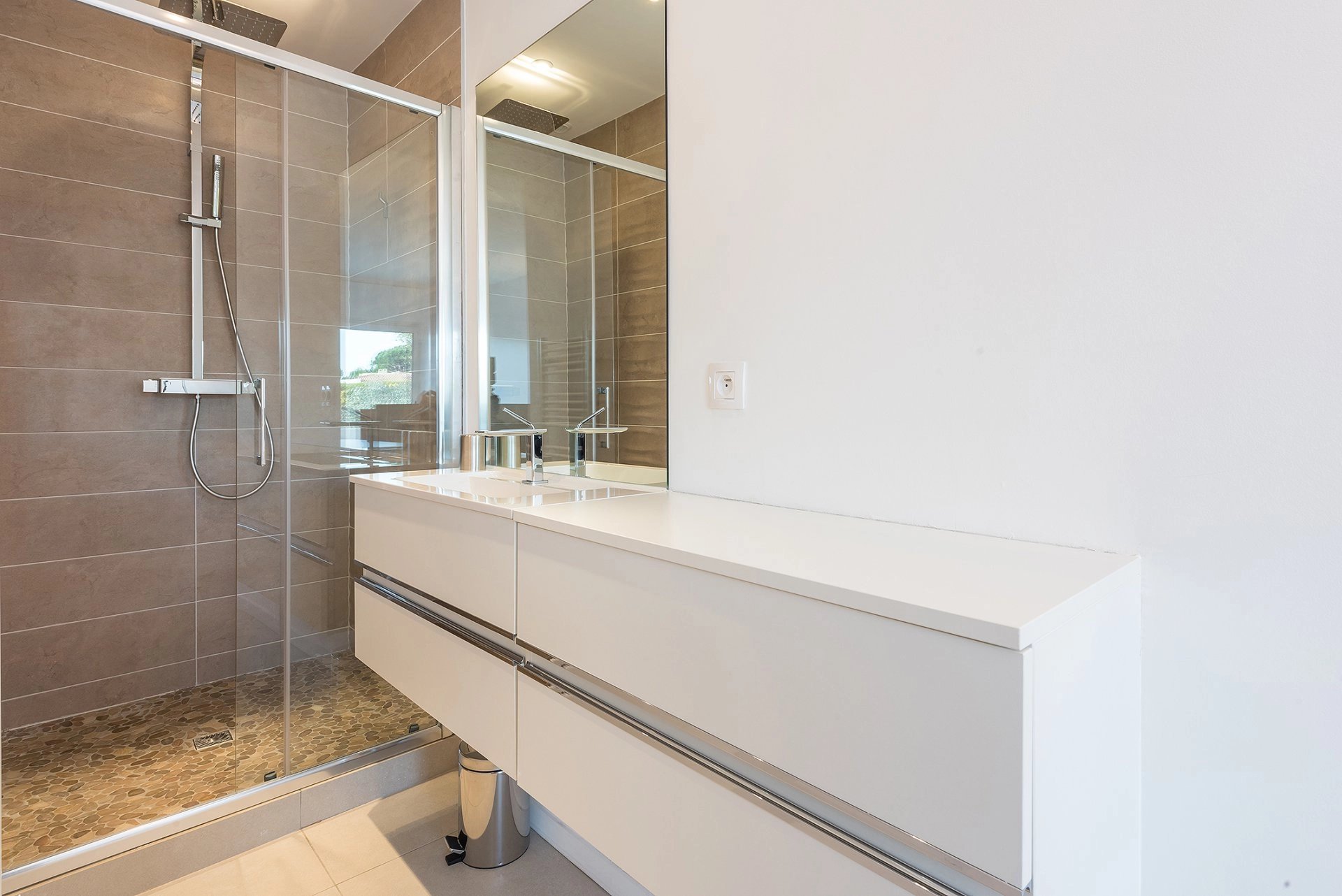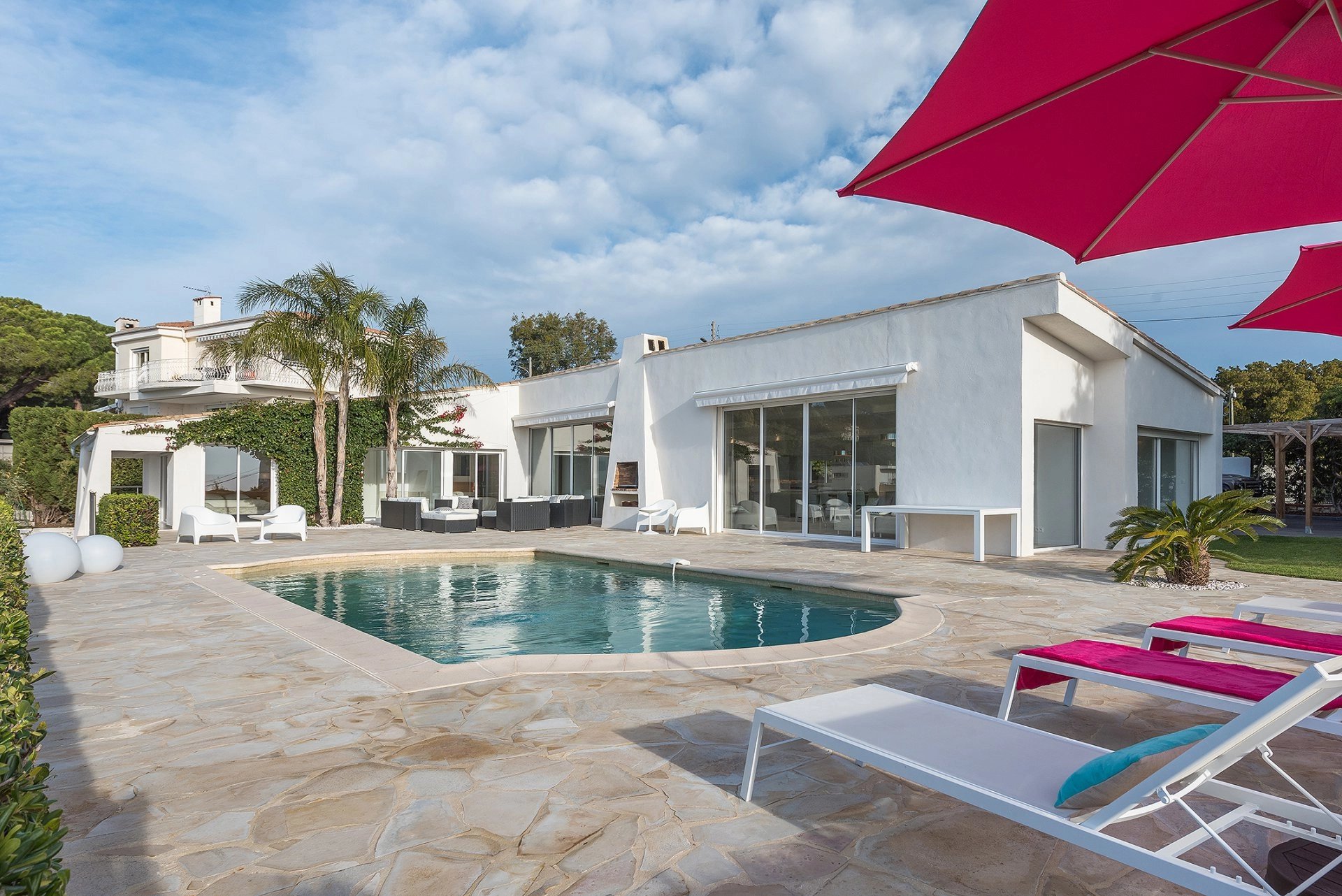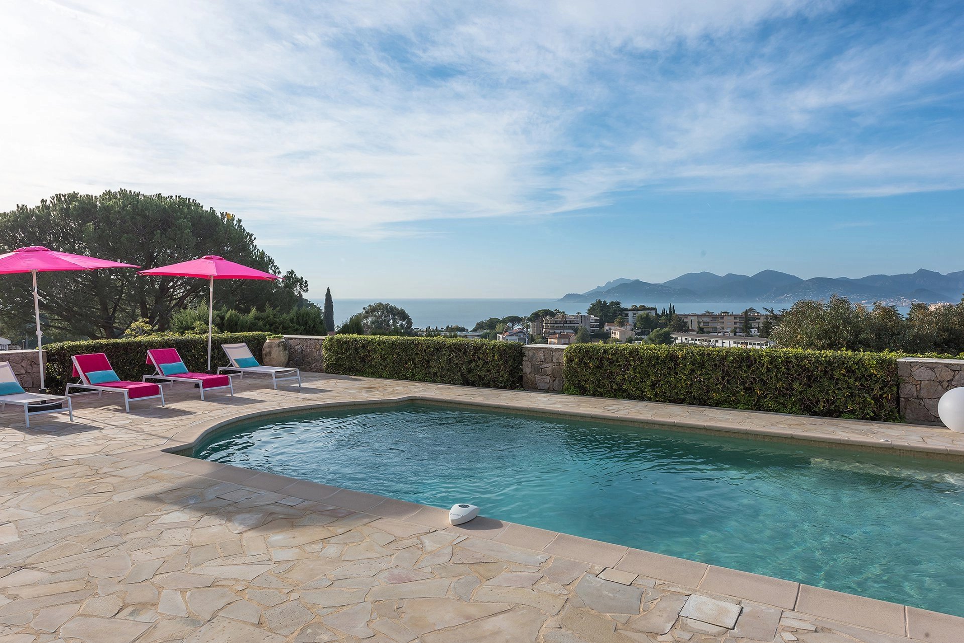 Auf den Höhen von Cannes, komplett renovierte Villa von ca. 310 m², die im Erdgeschoss aus einer ausgestatteten Küche, einem Wohnzimmer, einem Hauptschlafzimmer mit einem Badezimmer und zwei Schlafzimmern mit Duschbad besteht. Im Gartengeschoss befinden sich drei Schlafzimmer mit Duschbädern. Grundstück von ca. 2.300 m². Beheizter und salzbeheizter Swimmingpool, Garage.