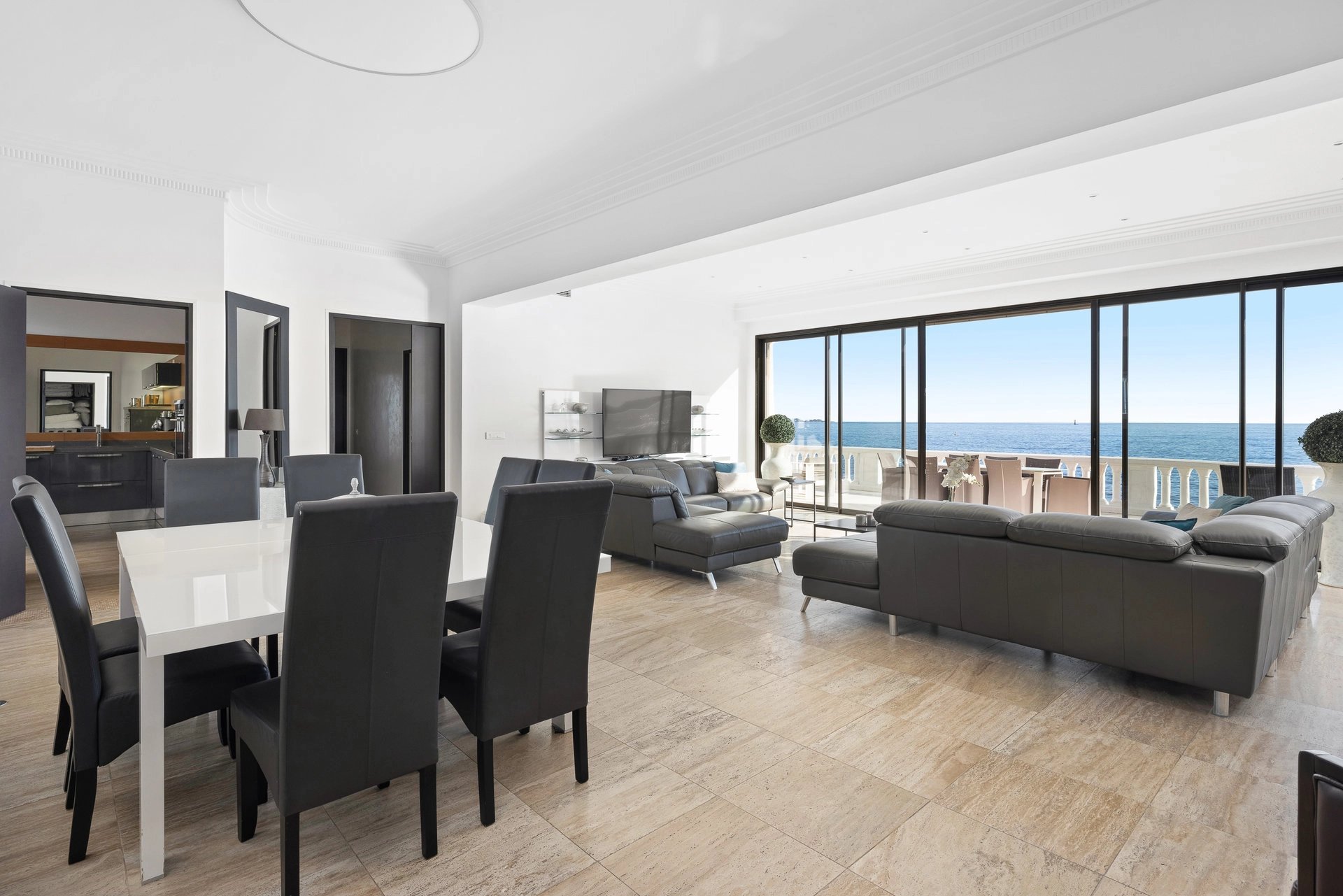 Der Empfangsbereich öffnet sich auf eine große Terrasse mit Blick auf das Meer und bietet einen spektakulären Blick auf das Cap d'Antibes und die Lérins-Inseln.