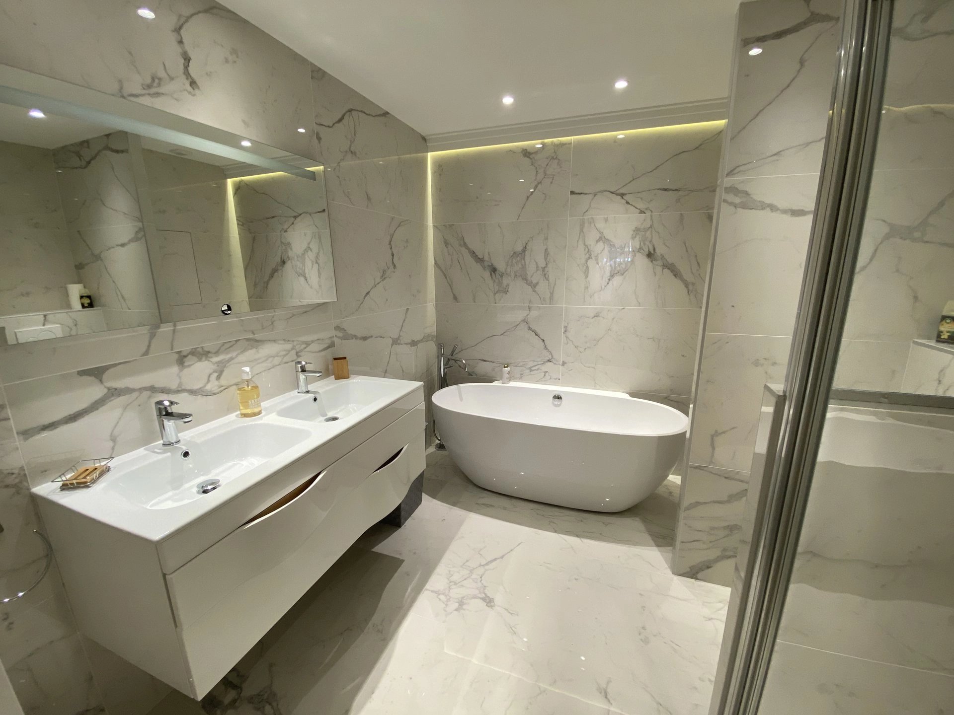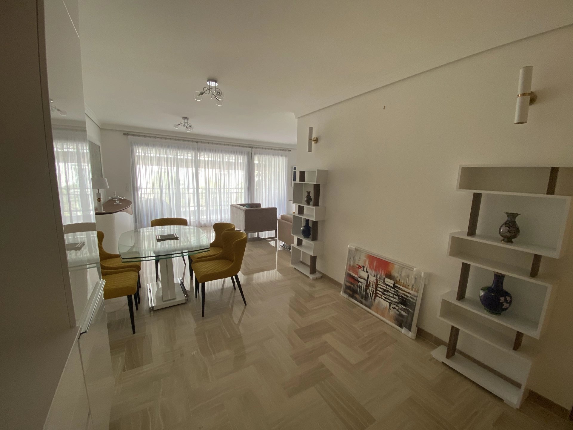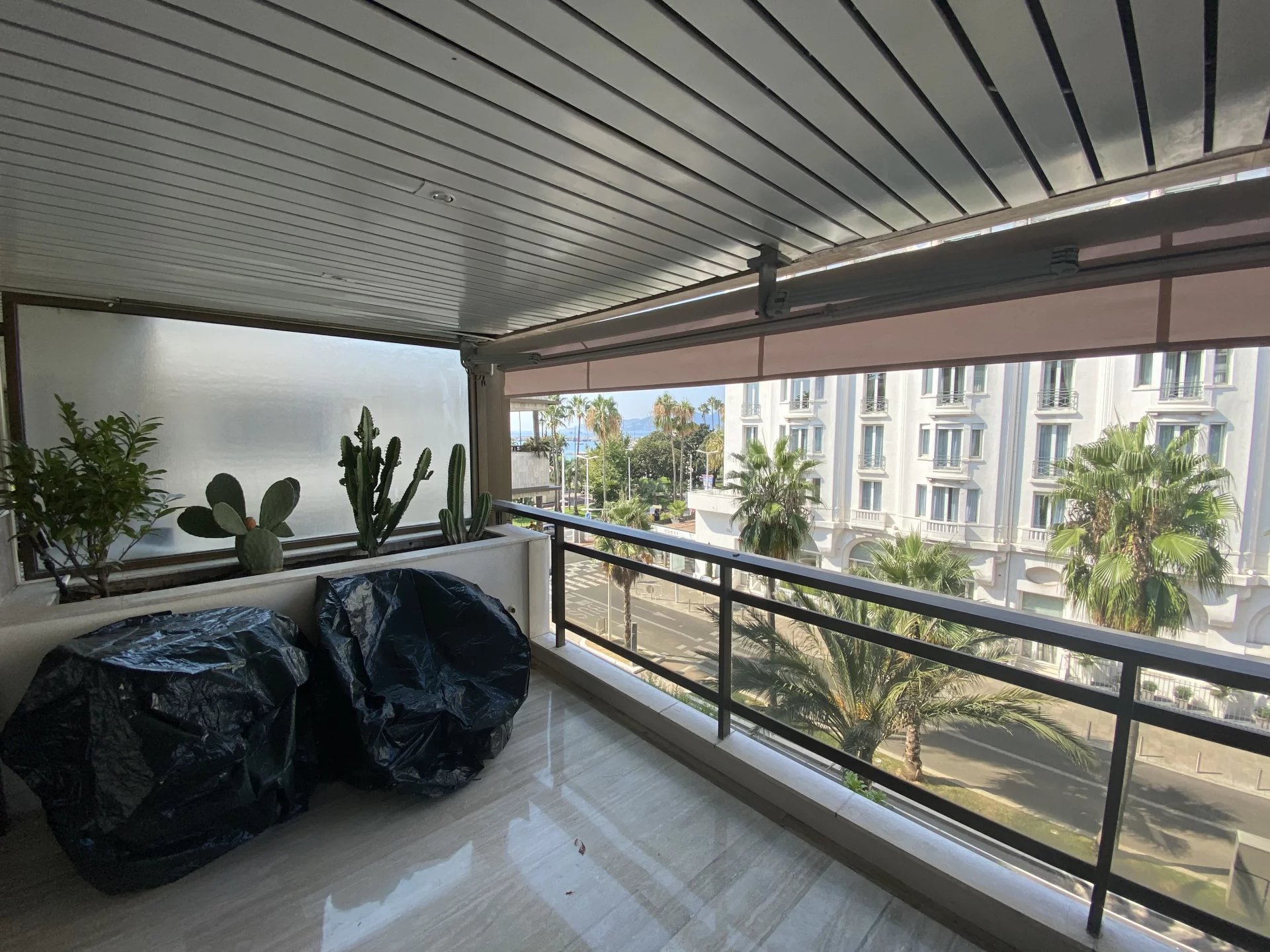 Diese komplett renovierte Wohnung von ca. 90m² bietet eine schöne Terrasse von ca. 27m² mit Meerblick und liegt nur wenige Gehminuten vom Palais des Festivals entfernt. Sie besteht aus: einem Wohnzimmer mit Esszimmer, einer Küche, einem Schlafzimmer en suite mit Duschbad und einem Hauptschlafzimmer mit Bad und Dusche. Ein weiteres Duschbad ist vorhanden.