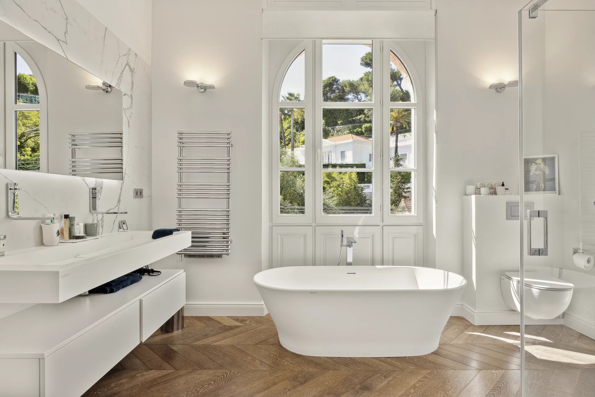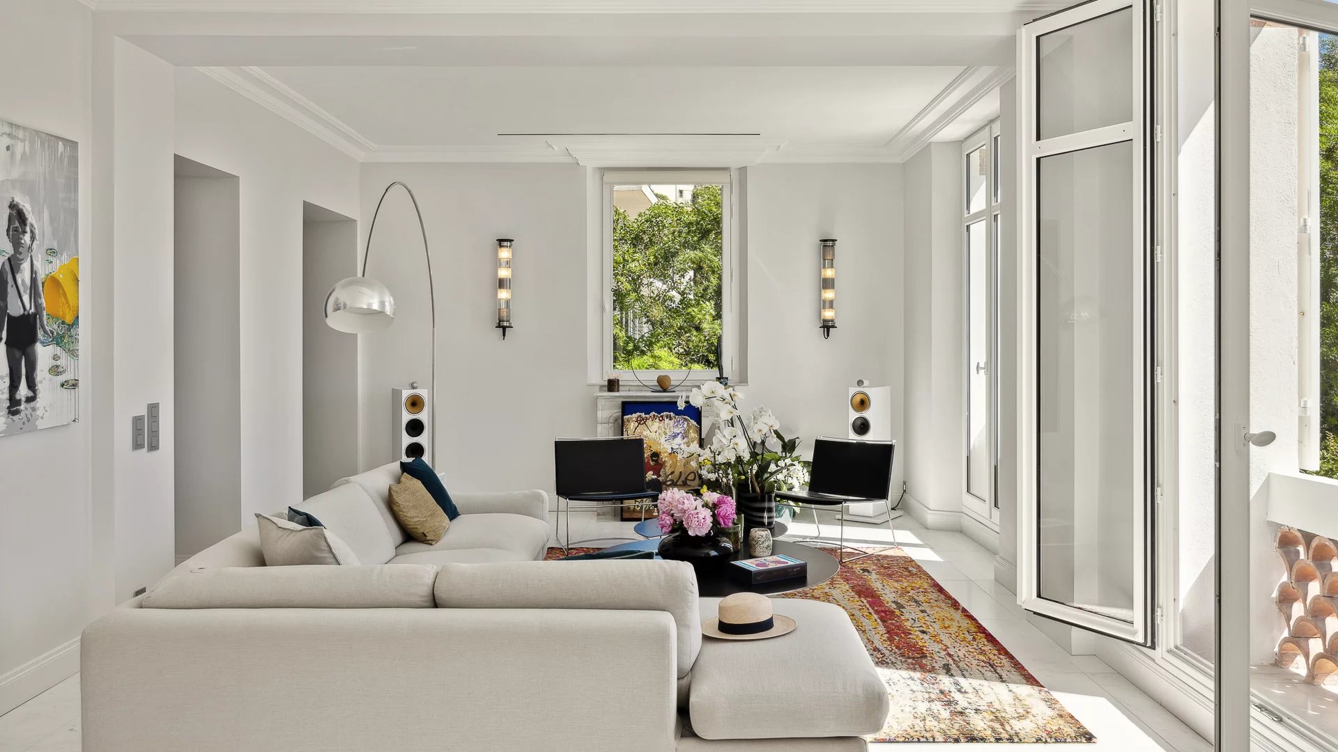 Ideal gelegen in dominanter Position im Herzen des exklusivsten Viertels von Le Cannet, nur einen Steinwurf vom alten Dorf und allen Annehmlichkeiten entfernt, wurde diese beeindruckende Villa aus den frühen 1900er Jahren vollständig geschmackvoll im zeitgenössischen Stil renoviert.