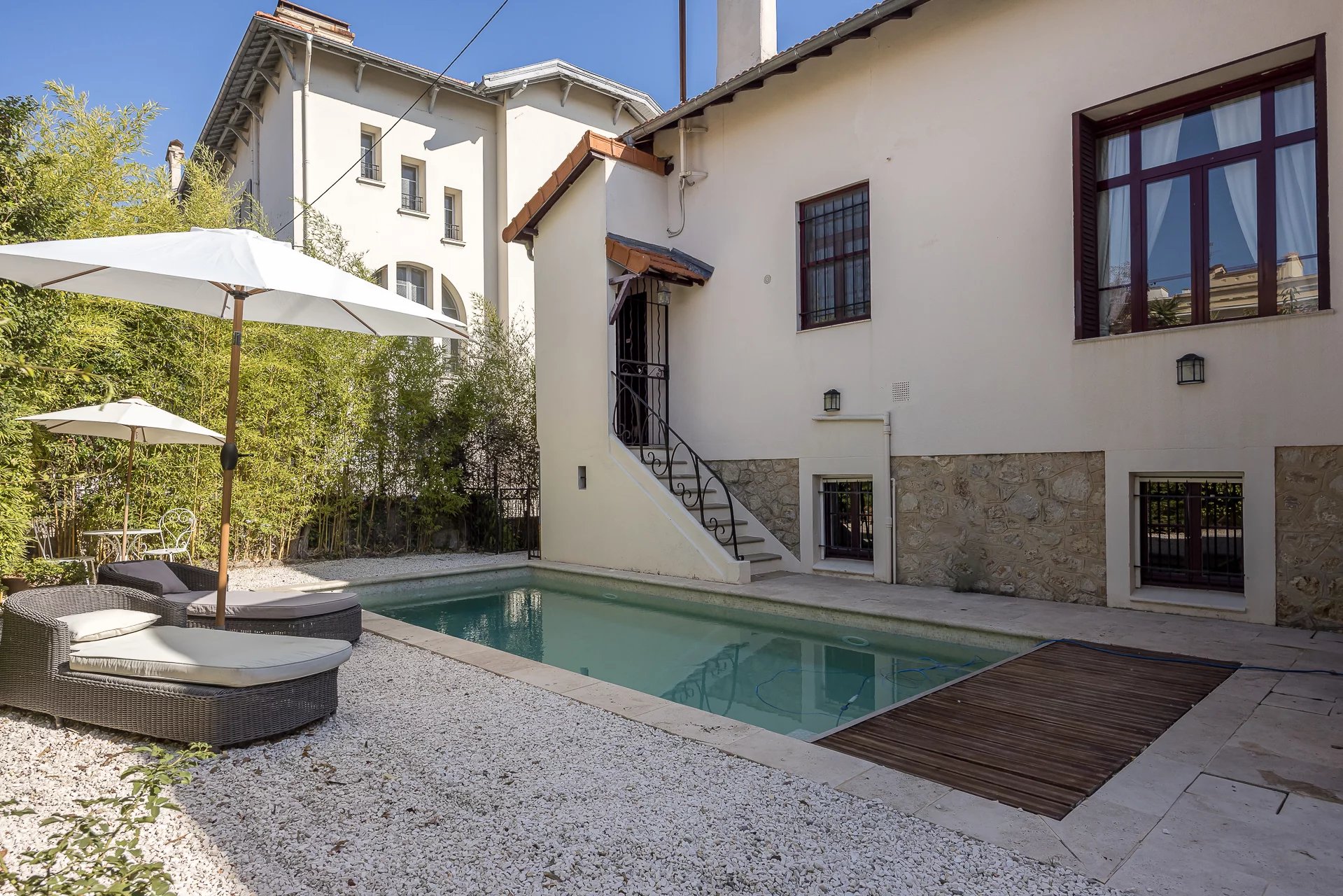 Ideale Lage im Wohnviertel Petit Juas, ruhig und in der Nähe der Geschäfte, bürgerliche Villa aus dem Jahr 1920 (klassifiziert als Kulturerbe Frankreichs) von ca. 274 m2, erbaut auf einem vollständig angelegten Grundstück von ca. 715 m2, mit beheiztem Salzwasserpool. Garage für ein Auto, 2 Parkplätze.