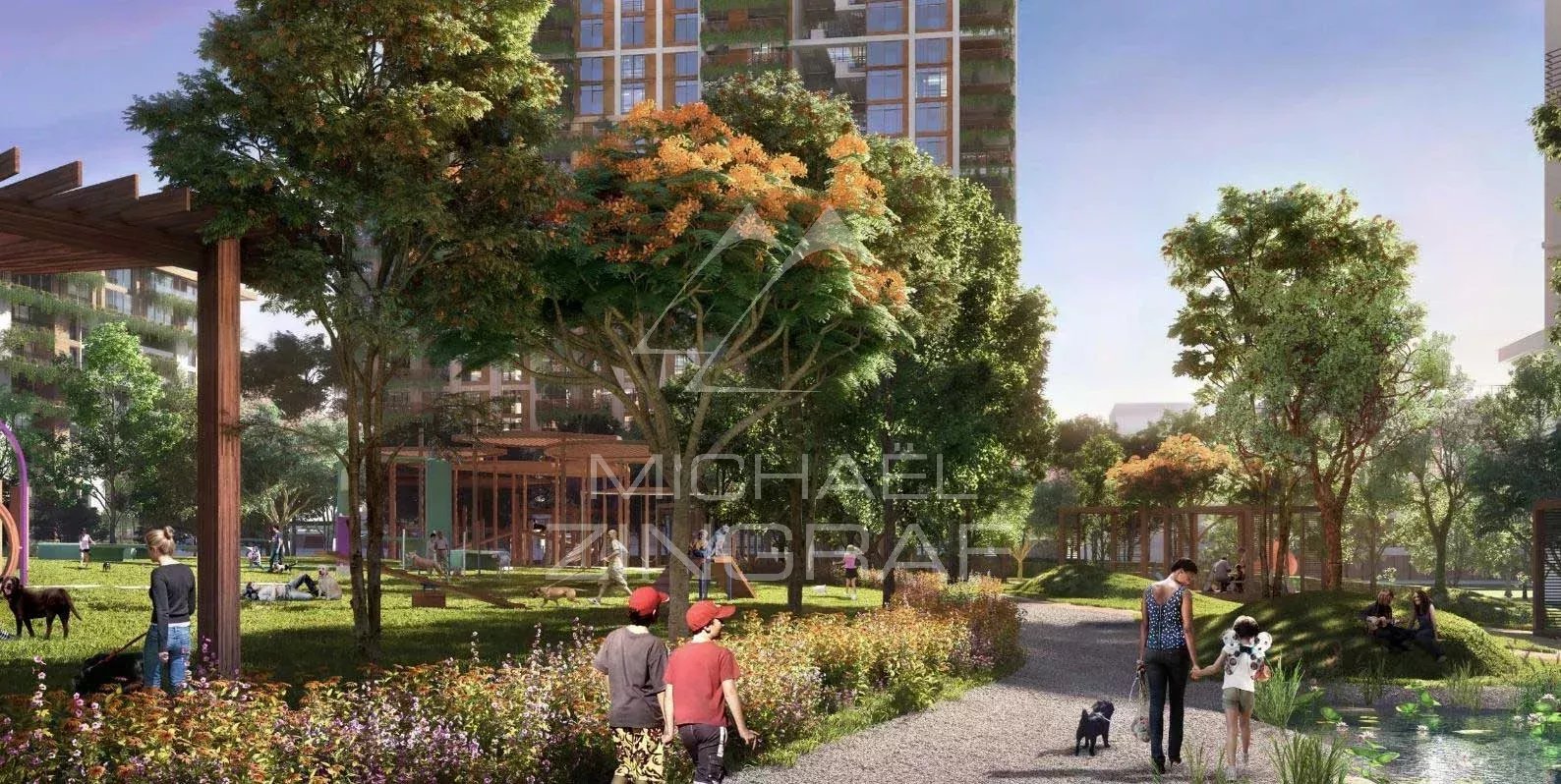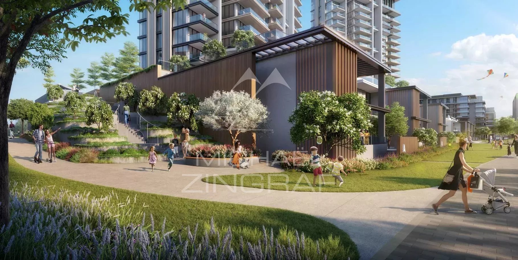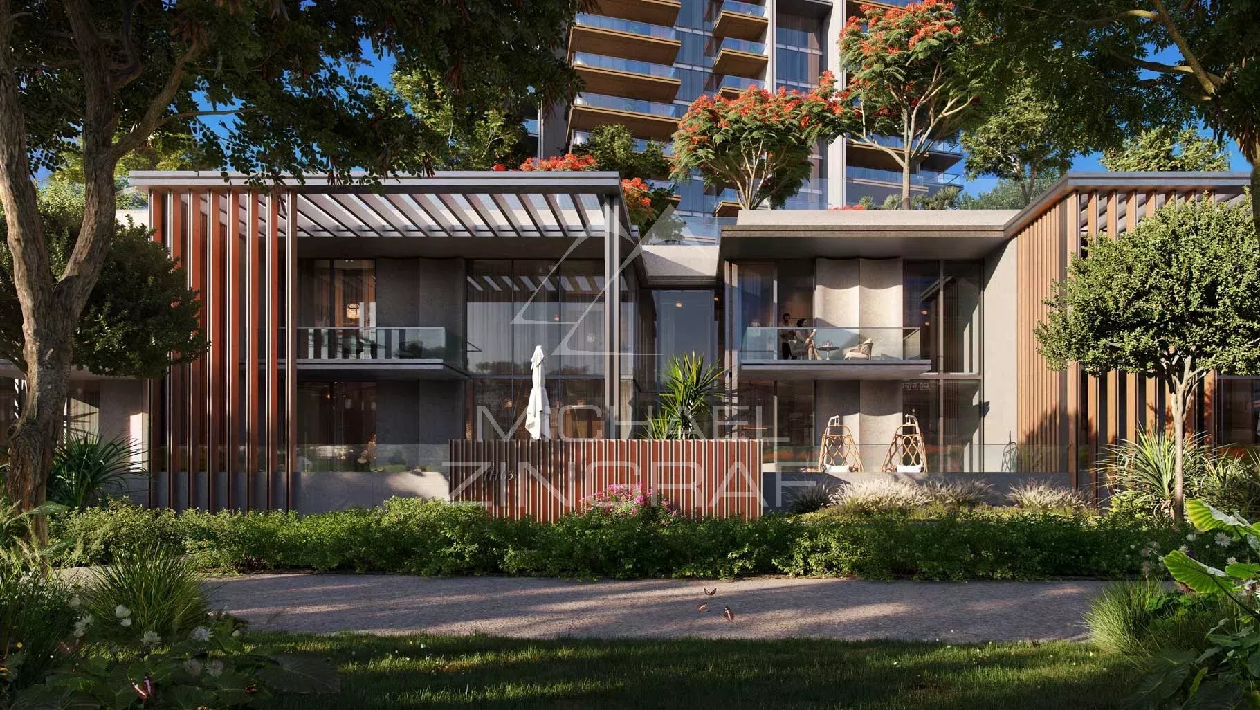 Die Stadthäuser verfügen über einen erhöhten Garten mit direktem Zugang zum Park und sind von üppigen, landschaftlich gestalteten Grünflächen umgeben, die optimale Privatsphäre bieten.