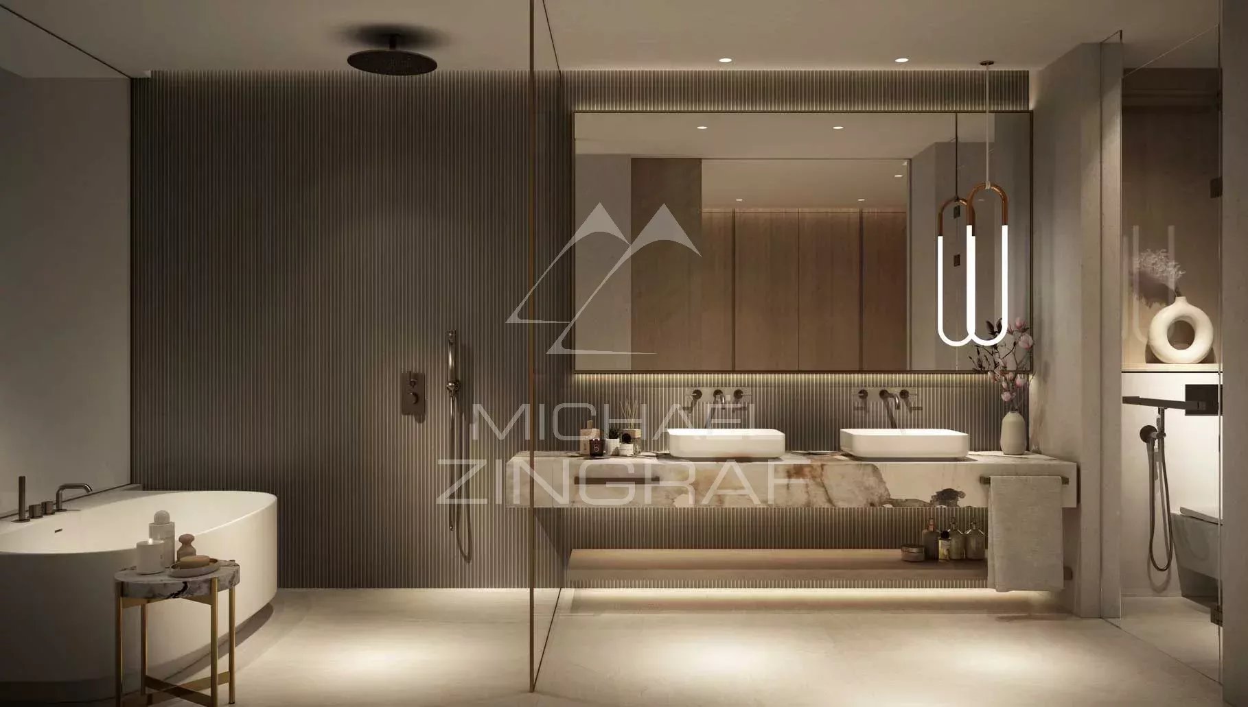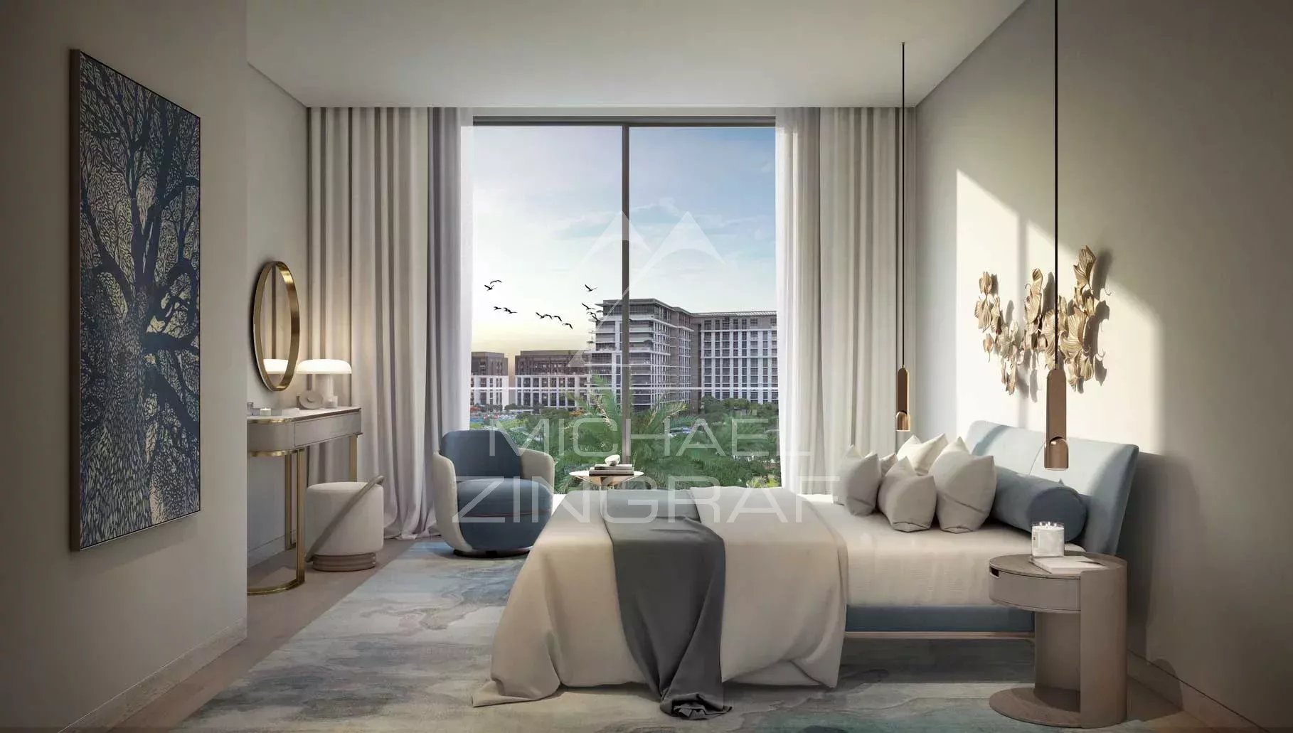 Modernes Wohnen mit hochwertigen Oberflächen und Panoramablicken aus den Eckwohnungen. Schlafzimmer mit raumhohen Glasfronten und Blick auf den Park. Großzügige Badezimmer mit einer Auswahl an hochwertigen Armaturen und Materialien.