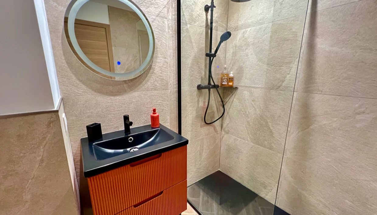 Die Oberflächen sind gepflegt, die Volumen großzügig und die Ausstattung auf der Höhe der Zeit: Klimaanlage, hochwertige Tischlerarbeiten, moderne Einbauküche, motorisierte Fensterläden.