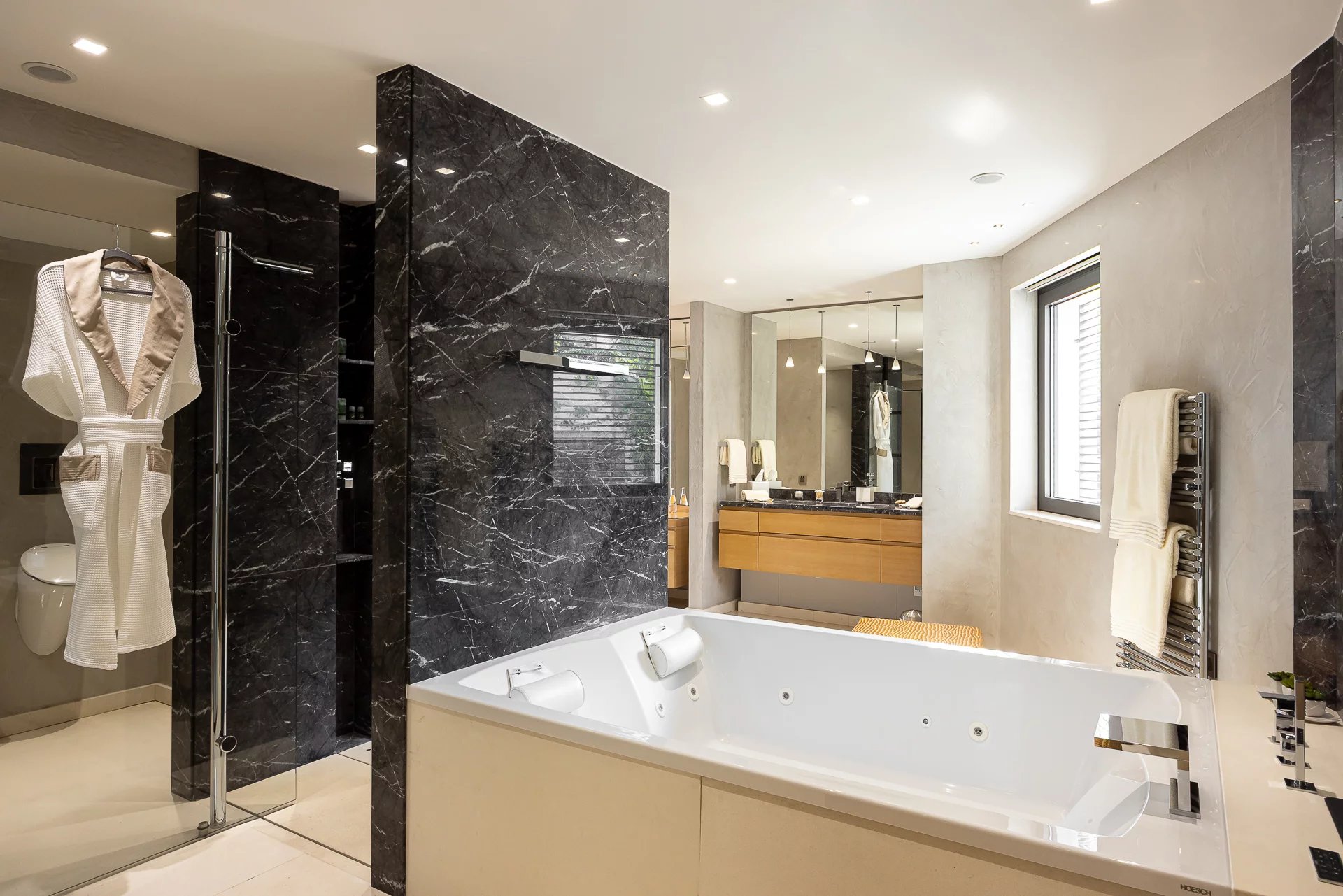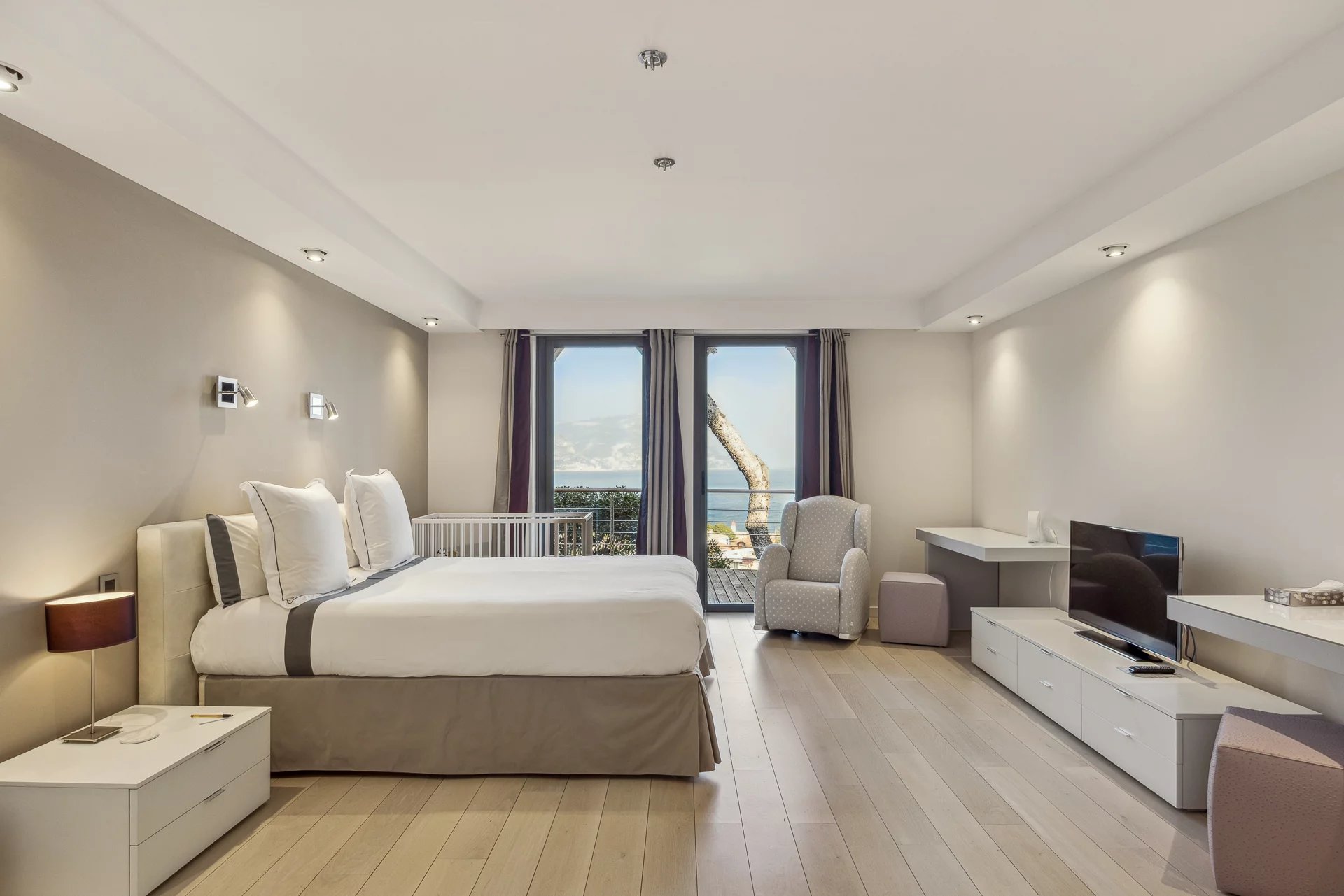 Die lichtdurchfluteten Wohnbereiche öffnen sich zu weitläufigen Terrassen und einem Infinity-Pool mit Meerblick, der zu jeder Tageszeit zum Entspannen einlädt. Sieben großzügige Suiten, darunter eine spektakuläre Master-Suite mit privater Terrasse, bieten absolute Privatsphäre für jeden Gast. Ein Heimkino, ein Wellnessbereich mit beheiztem Innenpool und ein voll ausgestattetes Fitnessstudio runden dieses außergewöhnliche Anwesen ab.