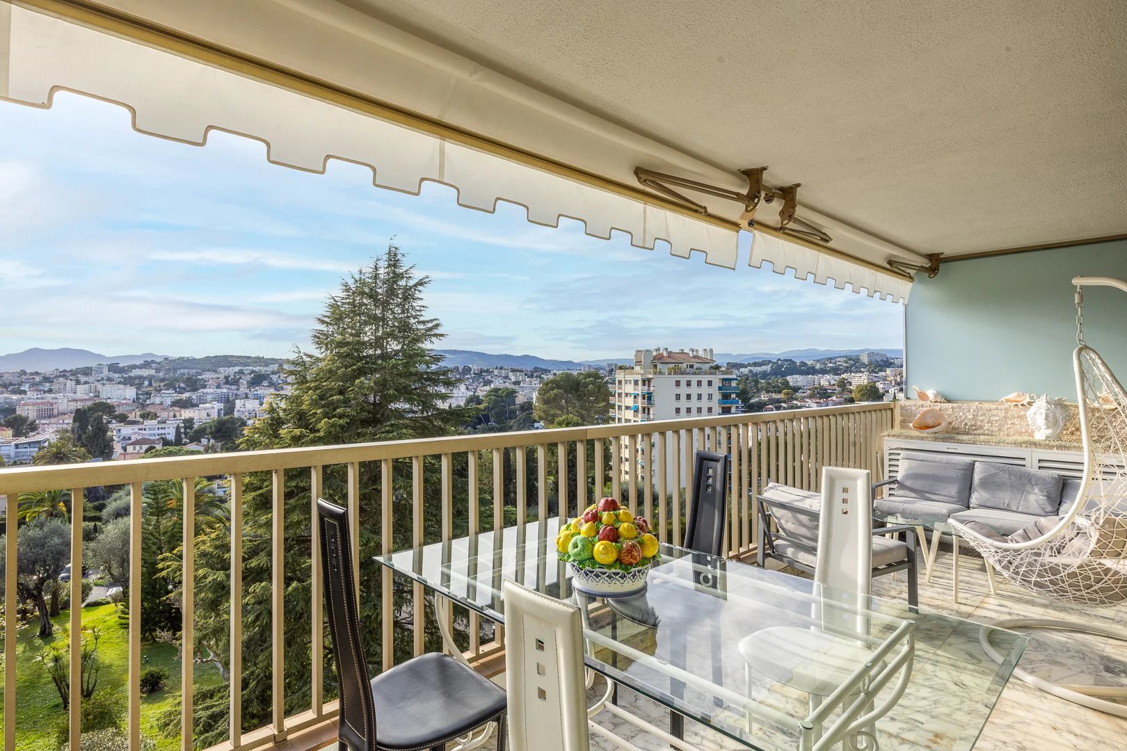 Das geräumige, helle Wohnzimmer öffnet sich zu einer großen Terrasse mit atemberaubendem Blick auf das Meer, die Bucht von Cannes und die Hügel des Estérel, was einen idealen Wohnraum zum Entspannen oder für Gäste bietet. Das angrenzende Esszimmer ermöglicht es Ihnen auch, diesen Panoramablick zu genießen.