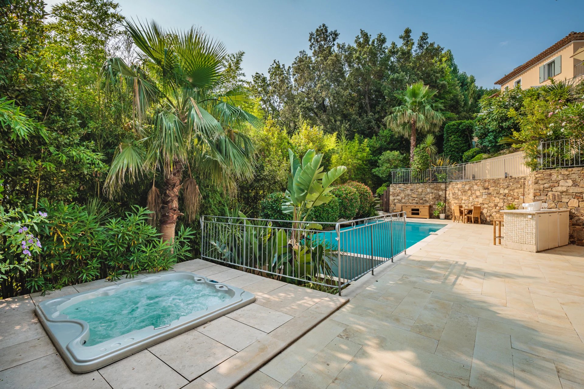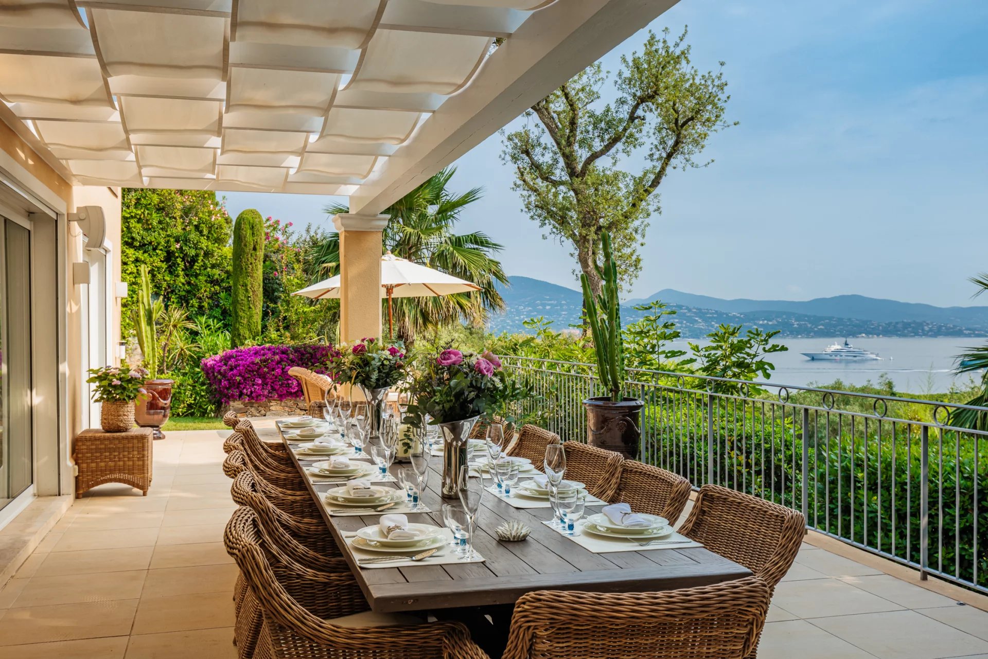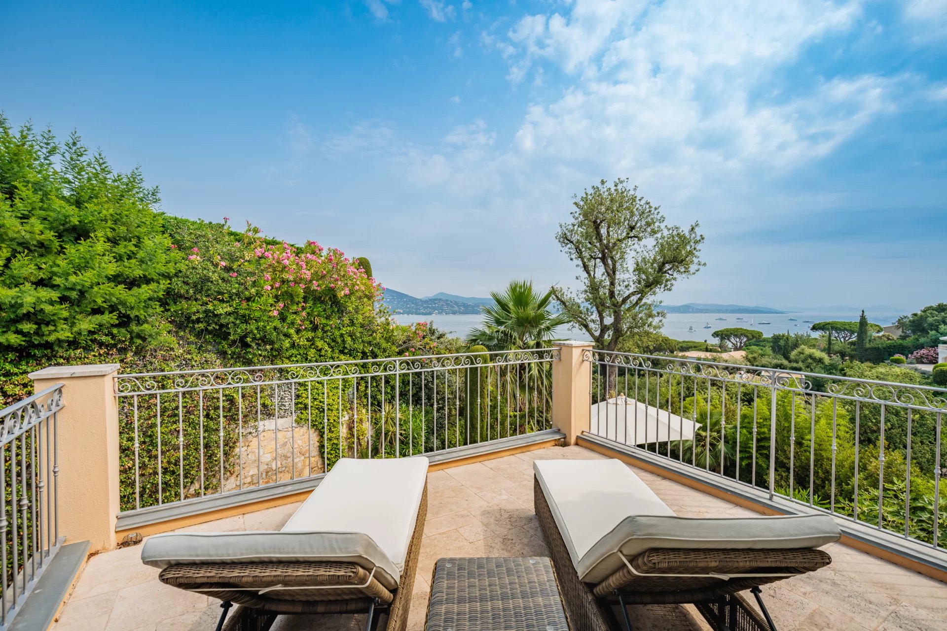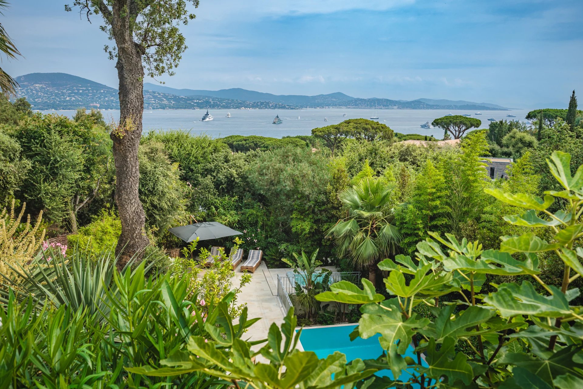 Wunderschöne Villa mit Meerblick auf den Golf von Saint-Tropez. Sie bietet 5 Schlafzimmer, ein Wohnzimmer mit Kamin sowie einen wunderschönen Garten und einen sehr schönen Pool.