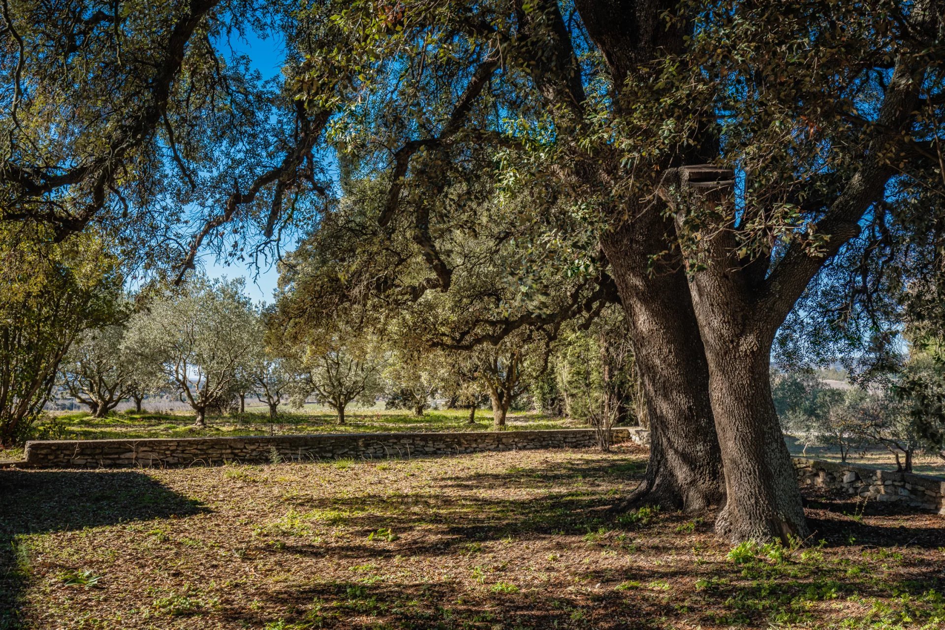 Das Anwesen ist nach Süden ausgerichtet und profitiert den ganzen Tag über von einem großzügigen Lichteinfall. Es erstreckt sich über ein Grundstück von 4186 m², das mit majestätischen 300 Jahre alten Eichen, Olivenbäumen und Trockensteinmauern bepflanzt ist, die der Landschaft ihren Rhythmus verleihen.