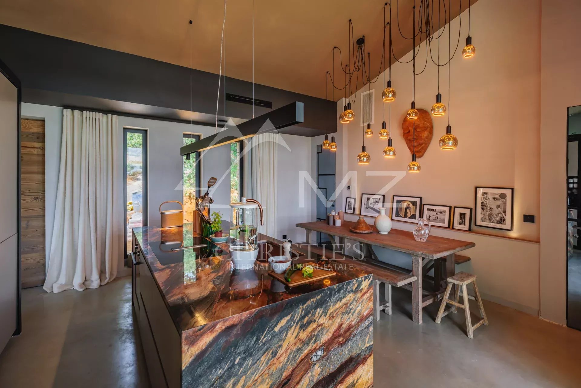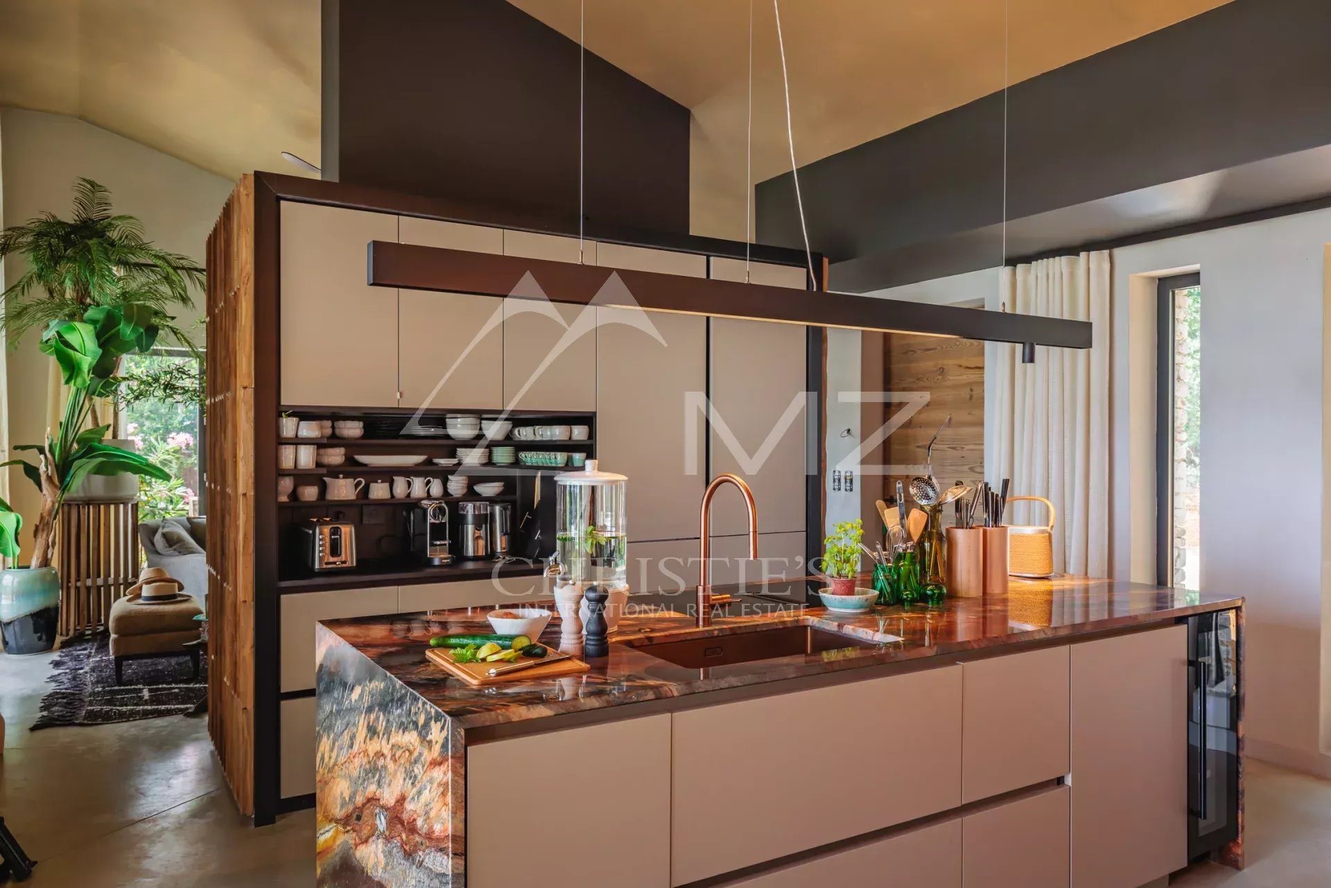 Sie werden unweigerlich von der Qualität und dem Grad der Raffinesse der Innenräume begeistert sein. Eine originelle, warme, gepflegte und ausgesuchte Dekoration, die auf subtile Weise Materialien und Werkstoffe miteinander verbindet (Vorhänge aus Leinen, Wände aus Kalk, Küchenzeile aus brasilianischem Stein...).