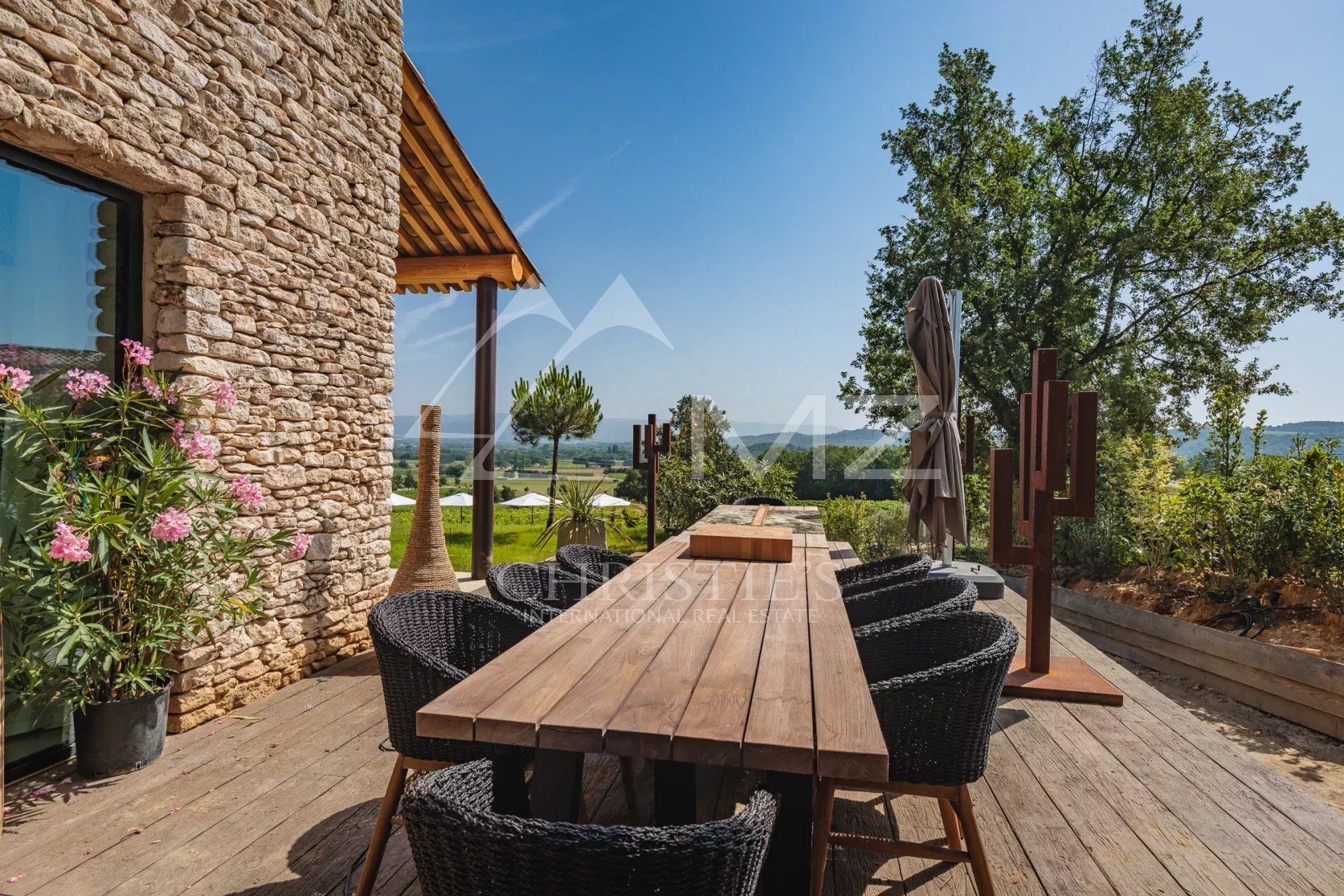 Nur einen Steinwurf vom Zentrum des Dorfes Gordes entfernt liegt dieses einzigartige Anwesen, das einen freien Panoramablick auf die Landschaft von Gordes und eine authentische provenzalische Mühle bietet. Der beheizte Swimmingpool mit bequemen Sonnenliegen und großen Sonnenschirmen befindet sich in einem liebevoll angelegten Garten.