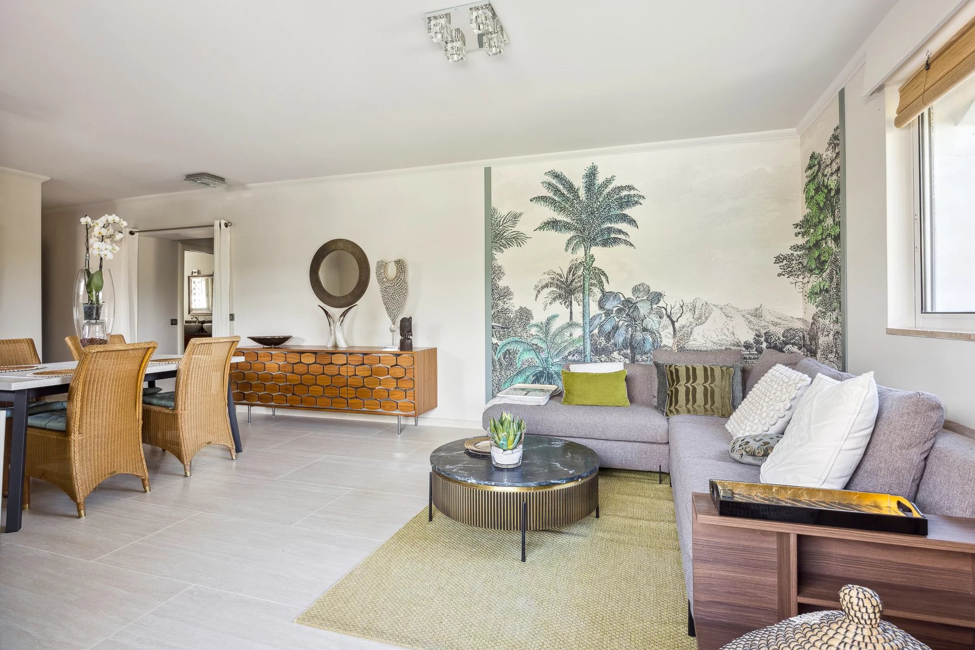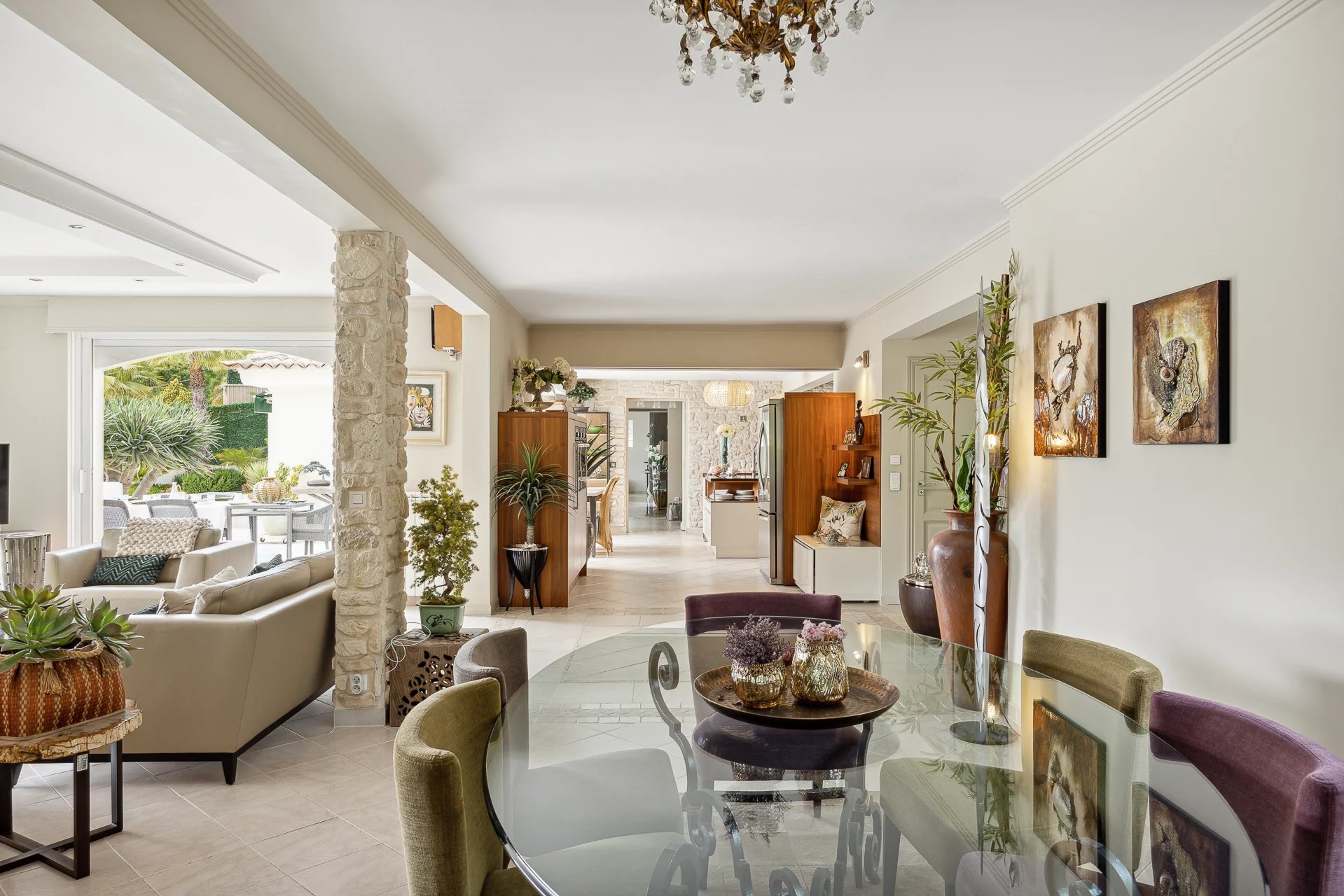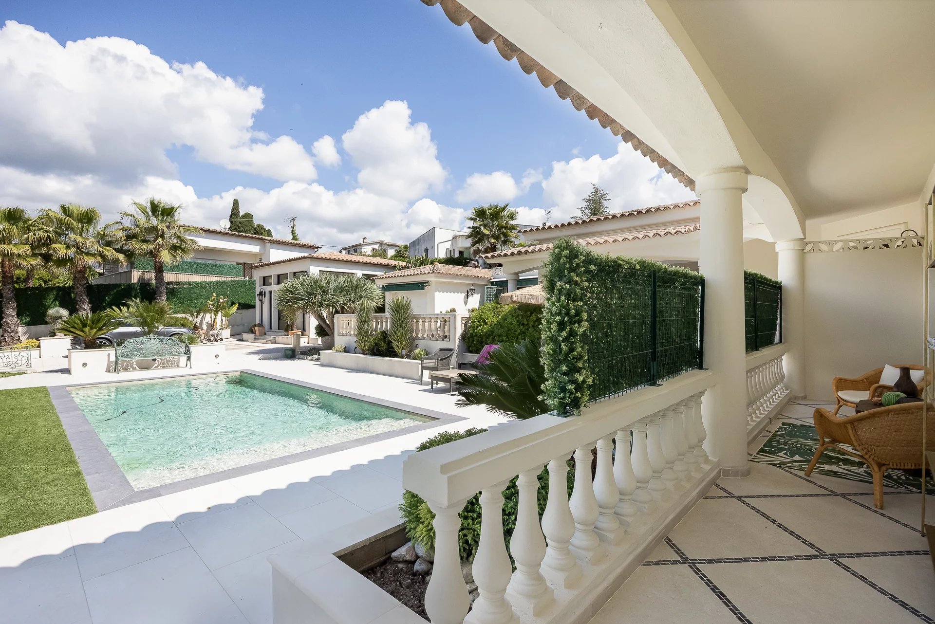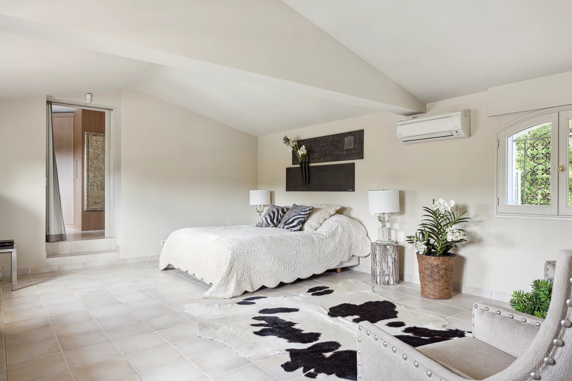 Im Erdgeschoss bietet die Villa großzügige und helle Wohnbereiche: ein Wohnzimmer mit Zugang zum Außenbereich, eine Veranda mit zweitem Wohnbereich und Büro-Ecke, die auf eine möblierte Terrasse führt. Hinzu kommen ein elegantes Esszimmer, eine voll ausgestattete Küche, eine zweite Küche sowie ein Hauswirtschaftsraum.