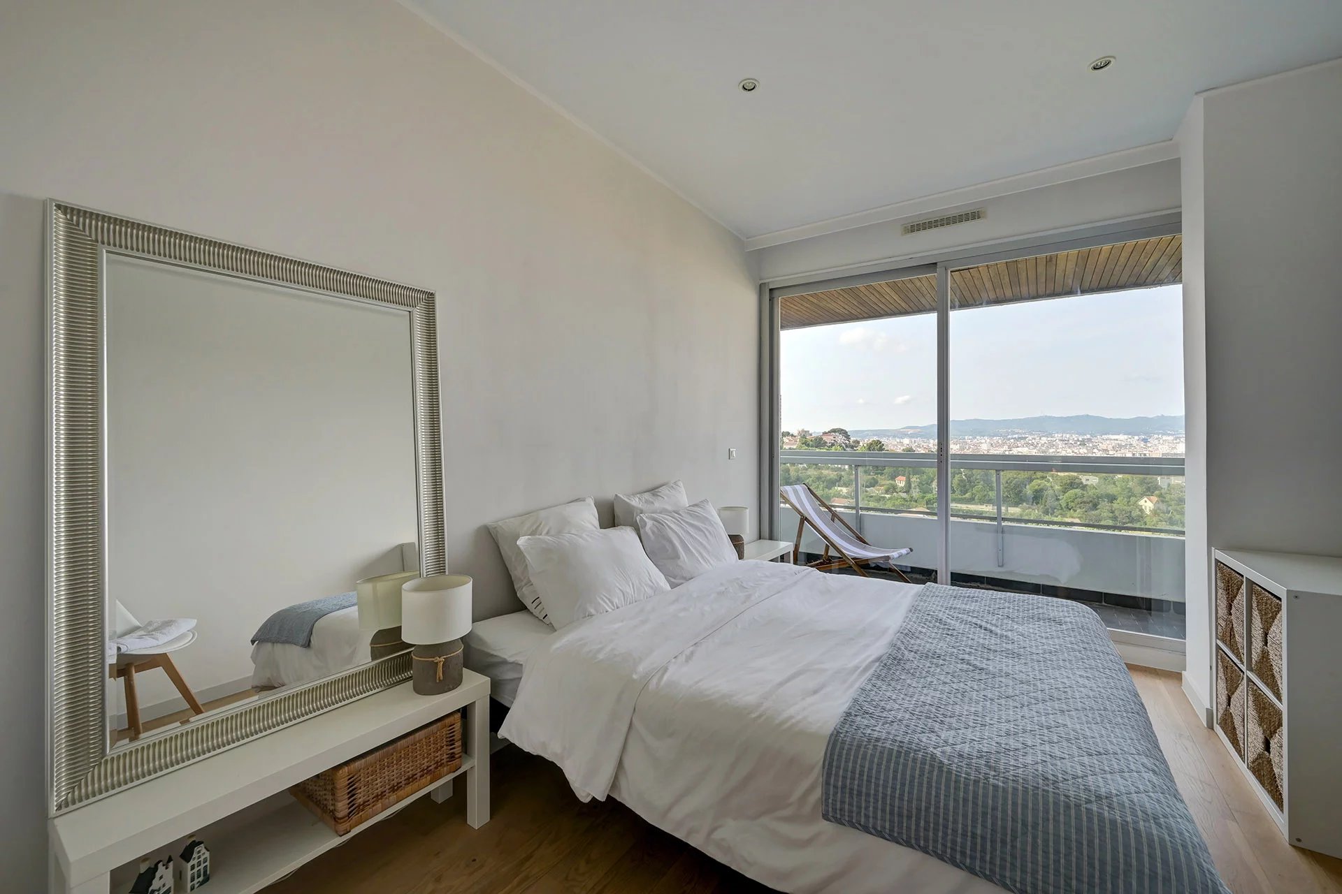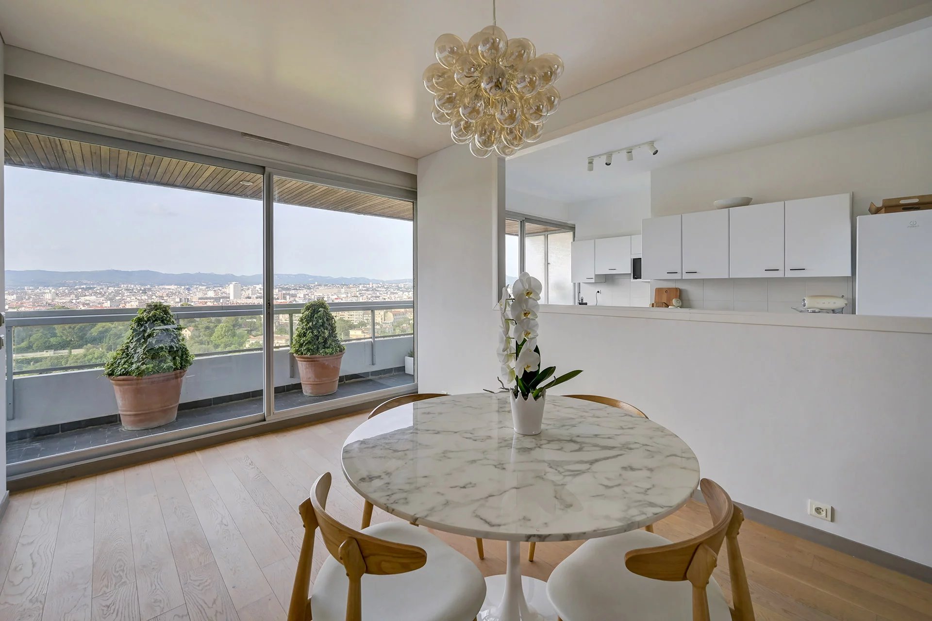 Entdecken Sie diese außergewöhnliche Wohnung im Herzen des 8. Arrondissements von Marseille, in der renommierten Residenz "Les Jardins de Thalassa". Diese helle Wohnung auf einer hohen Etage bietet eine Fläche von 134 m² (nach Carrez-Gesetz) und verfügt über 40 m² Terrassen mit atemberaubendem Blick auf das Mittelmeer und die Stadt Marseille.