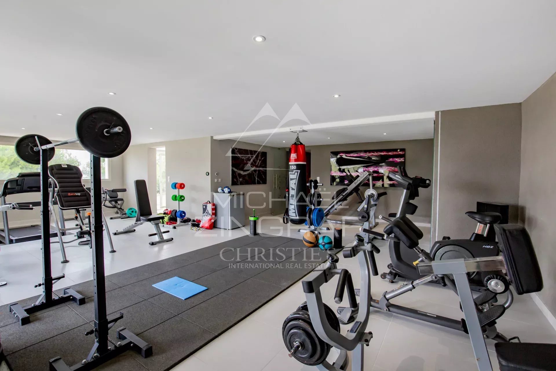 Im Inneren befinden sich Wohnräume und 5 geräumige und helle Schlafzimmer, davon 3 en suite. Alles klimatisiert und mit direktem Zugang zum Außenbereich und der atemberaubenden Aussicht auf die Umgebung. Ein über 100m2 großer Fitnessraum mit Hammam.