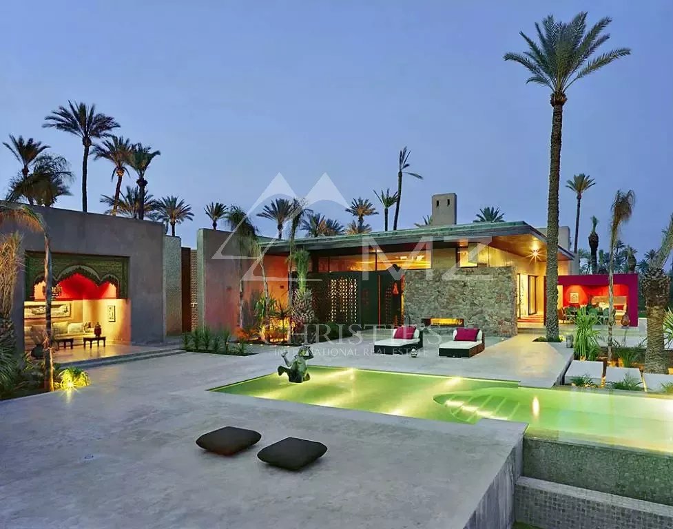 In einem 5,6 Hektar großen Park, am Anfang des Palmenhains und ganz in der Nähe der Medina von Marrakesch, öffnet sich das Anwesen zu den schneebedeckten Gipfeln des Atlasgebirges im Süden. Ein Olivenhain, ein Orangenhain sowie majestätische Palmen umgeben die zahlreichen Gebäude des Anwesens: die Hauptvilla mit ihren drei Suiten, die Gästevilla, der Turm sowie eine charmante Ecke, die schelmisch als Hippie-Dorf bezeichnet wird.