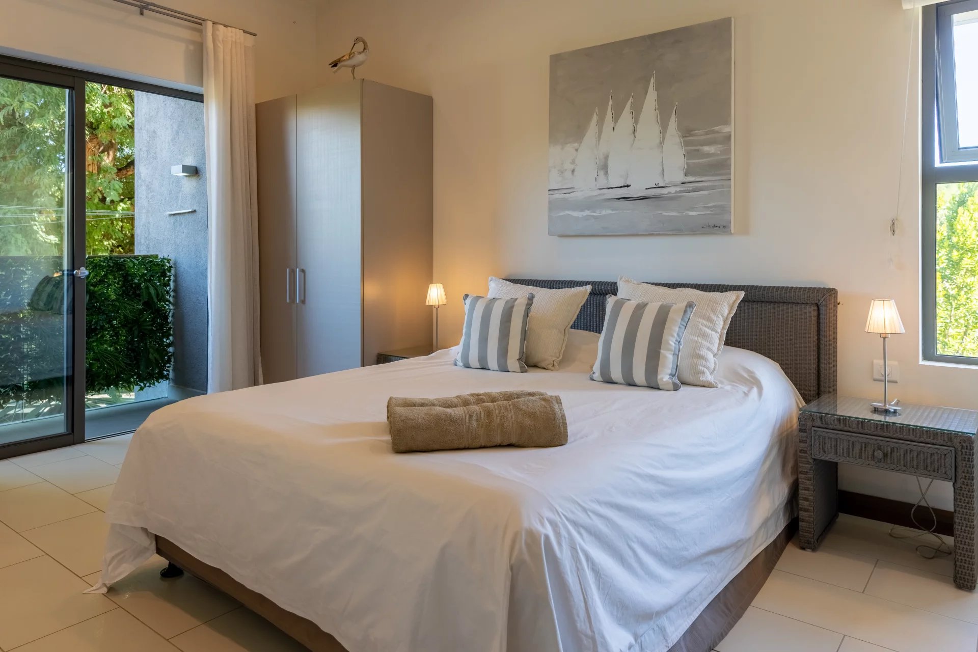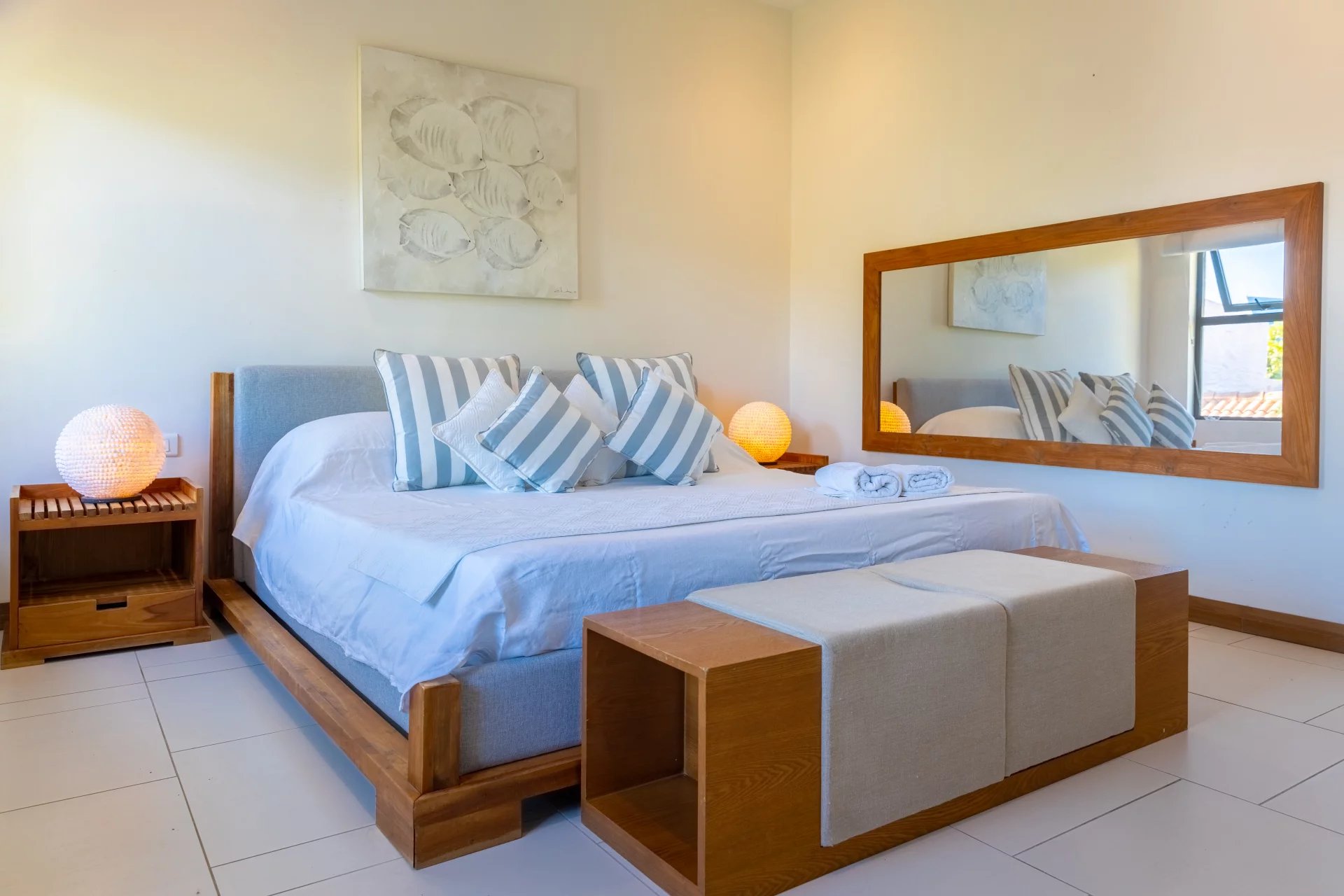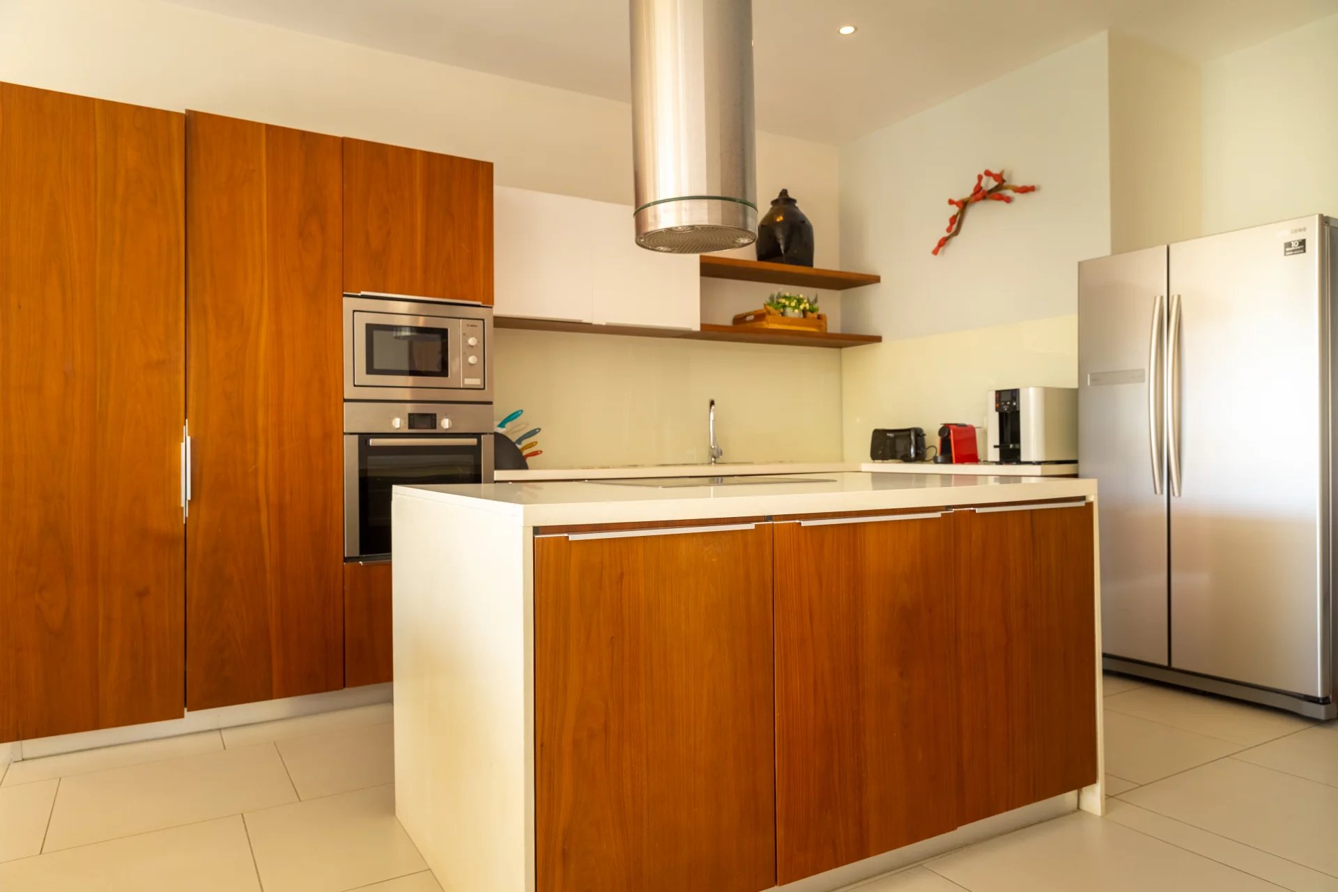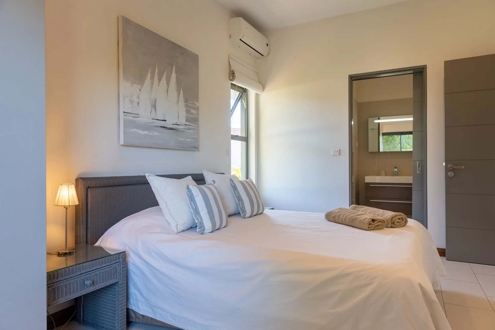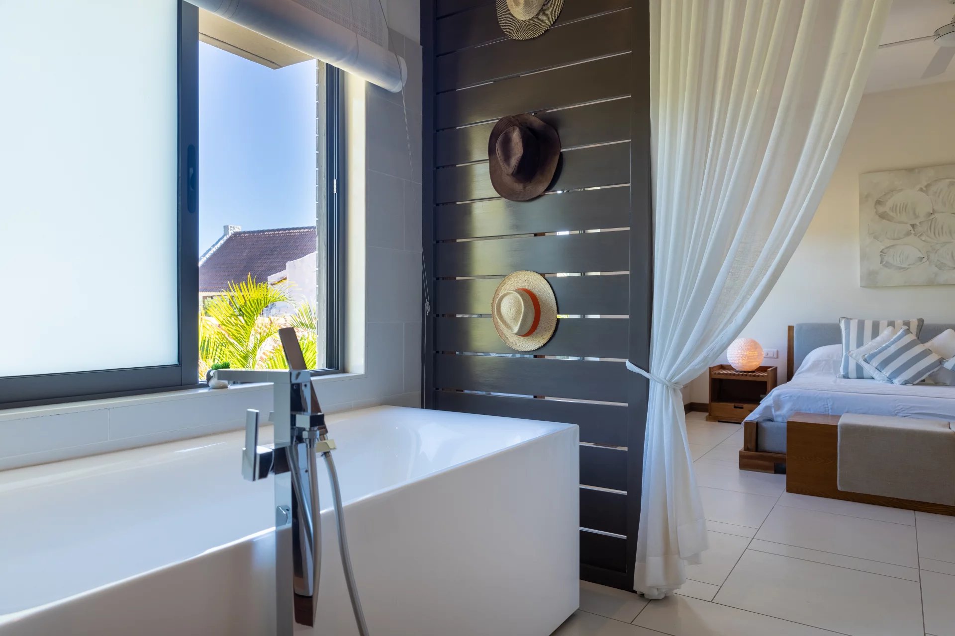 De hoofdslaapkamer en suite heeft een kleedkamer en een badkamer met bad om te ontspannen. De andere 2 slaapkamers hebben ook een eigen badkamer. Dit modern vormgegeven appartement biedt veel comfort in een trendy, tropisch-chique omgeving.