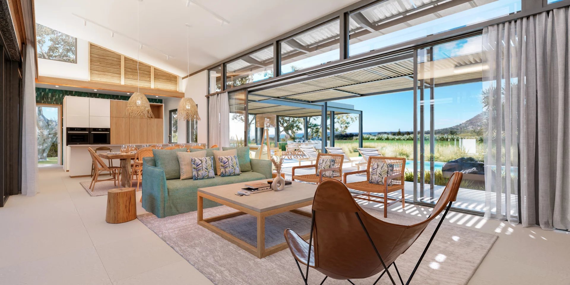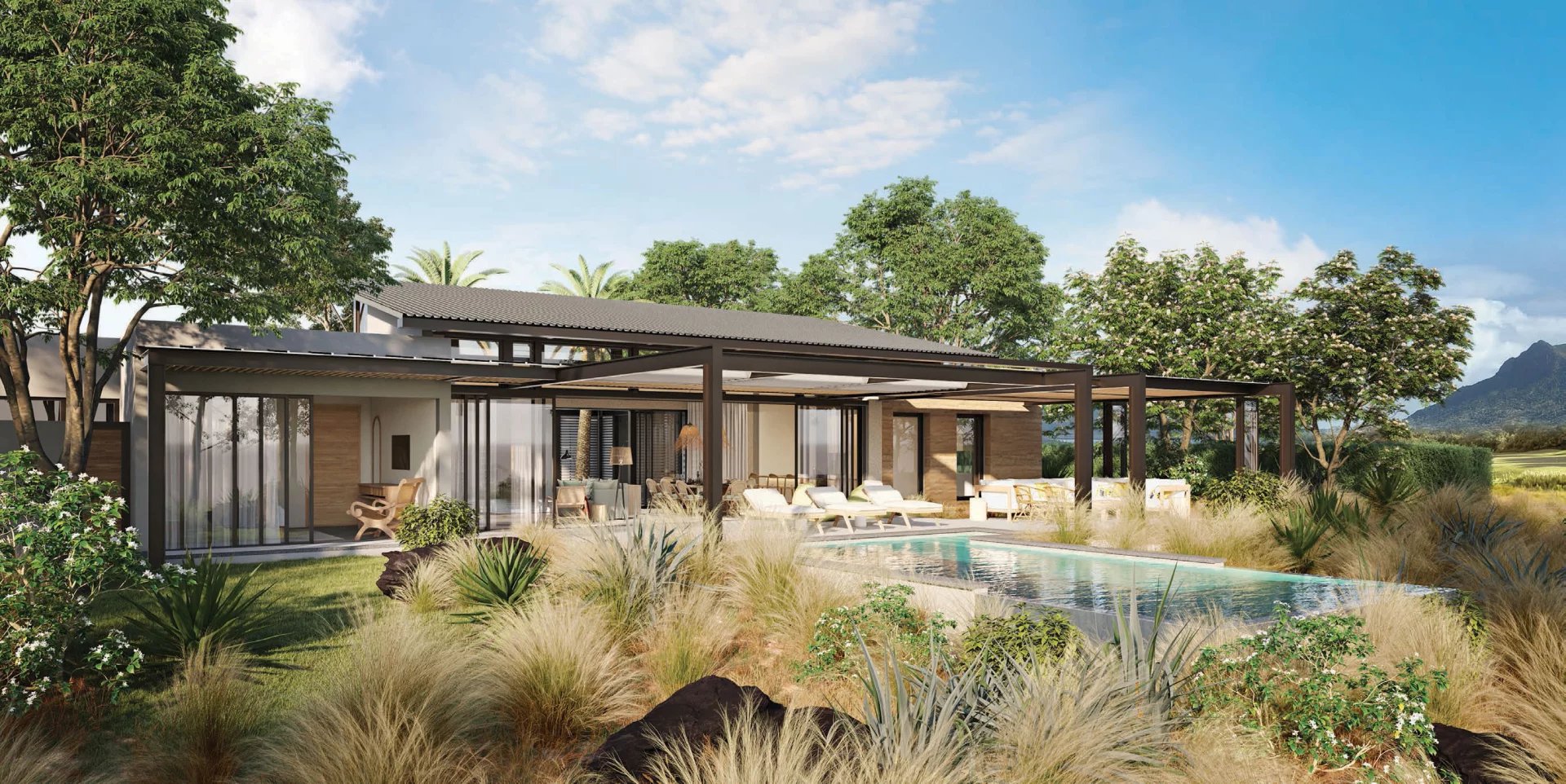 Die Website profitiert von einer einzigartigen Savannah -Atmosphäre. Sein Klima ist sehr trocken und seine aktuellen Landschaften bestehen aus einer Kombination aus hohen Kräutern im schwarzen Fluss, endemischen Bäumen, schwarzen Holzbäumen, Tamarindenbäumen, kreolischen Agaven und Vulkanfelsen. Das Konzept der Landschaftsgestaltung zielt darauf ab, die Schönheit des Geländes zu bewahren, indem 100 % der vorhandenen Pflanzen auf dem Gelände für Straßenrand wieder verwendet werden und 90 % der Umwelt um jede Villa mit vorhandenen Pflanzen des Geländes und endemischen Pflanzen von Mauritius entwickelt werden