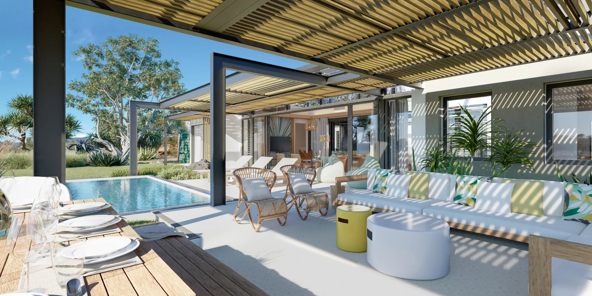Elegant, geräumig und intim, bietet die Villa N einen hervorragenden Blick auf den Golfplatz und den Tamarin -Turmberg und bietet gleichzeitig eine ideale Orientierung, die vor den Winden geschützt ist und vollständig vom natürlichen Licht profitiert. Ihre Terrasse mit tropischer Landschaft ist eine grüne Lunge, um die das Leben des Haushalts täglich artikuliert wird. Mit ihren drei Schlafzimmern in Suite (ein 4. Schlafzimmer wird als Option angeboten) und sein großer Wohnraum, der Wohnzimmer, Esszimmer und offene Küche zusammenbringt, verwandelt sich alle in Außenlebensräume (Kiosk und Schwimmbad), es ist das Haus der tropischen Familie, die sich in der Familie befindet par excellence.