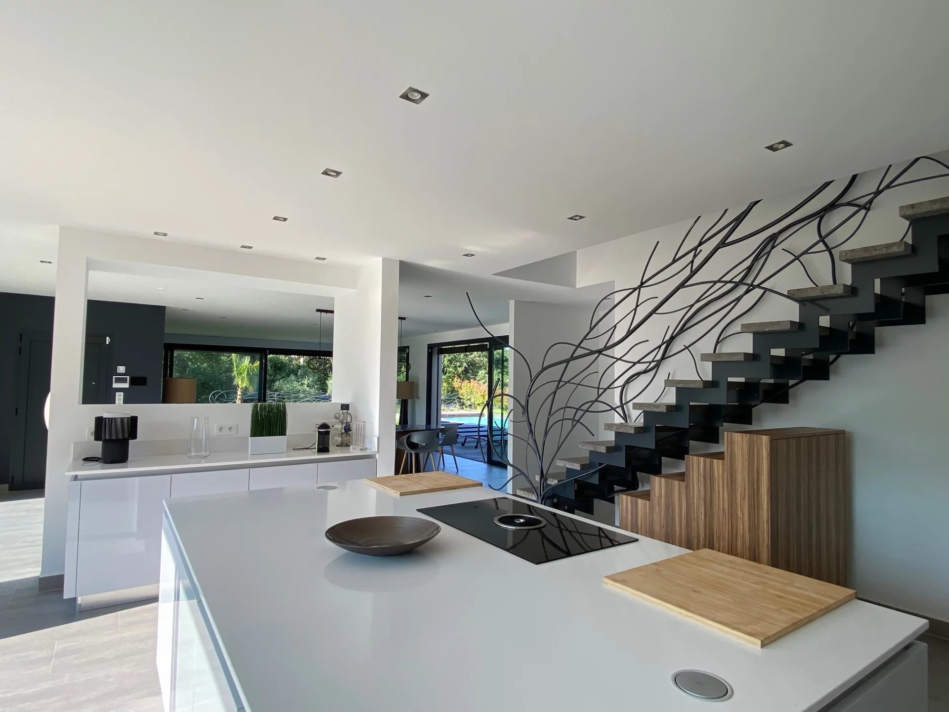 Die Villa Blanche liegt inmitten eines großen, bewaldeten Parks im Hinterland von Cannes. Das Haus mit seinem zeitgenössischen Charme ist mit seinen 205 m², dem großen, gesicherten Parkplatz und dem beheizten Pool perfekt für große Familien.