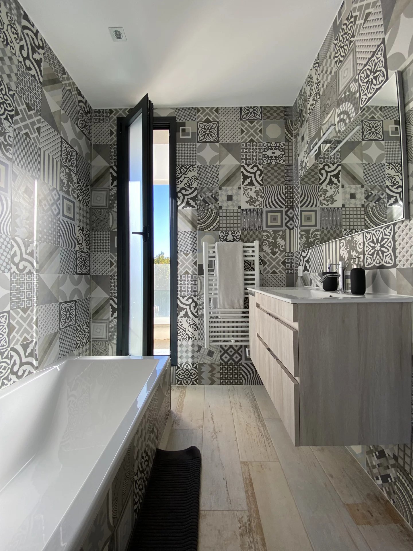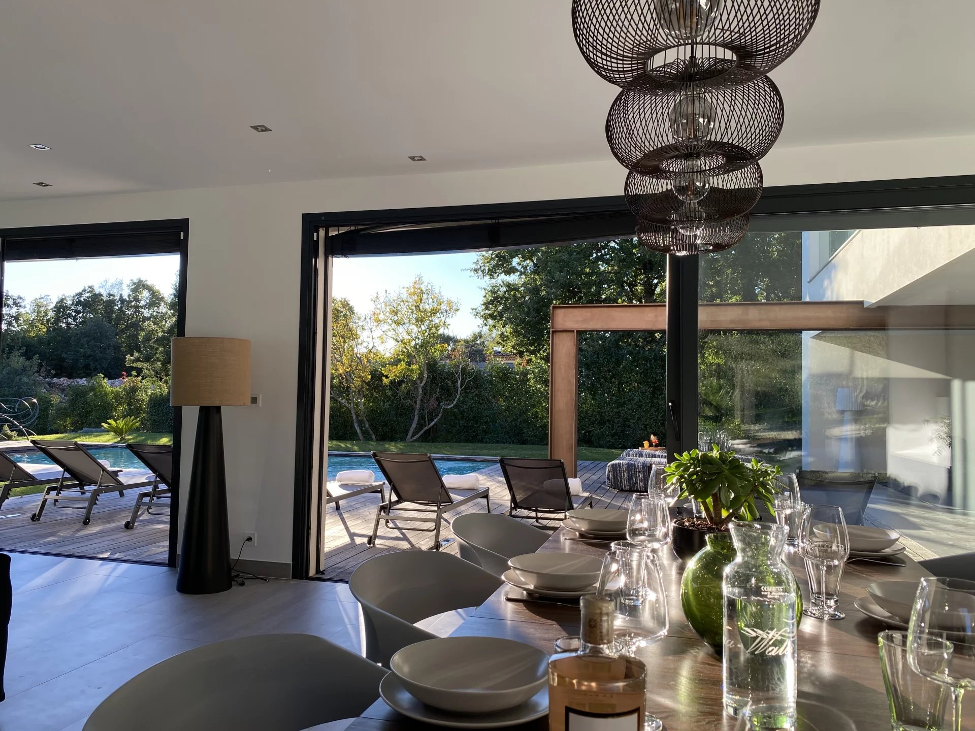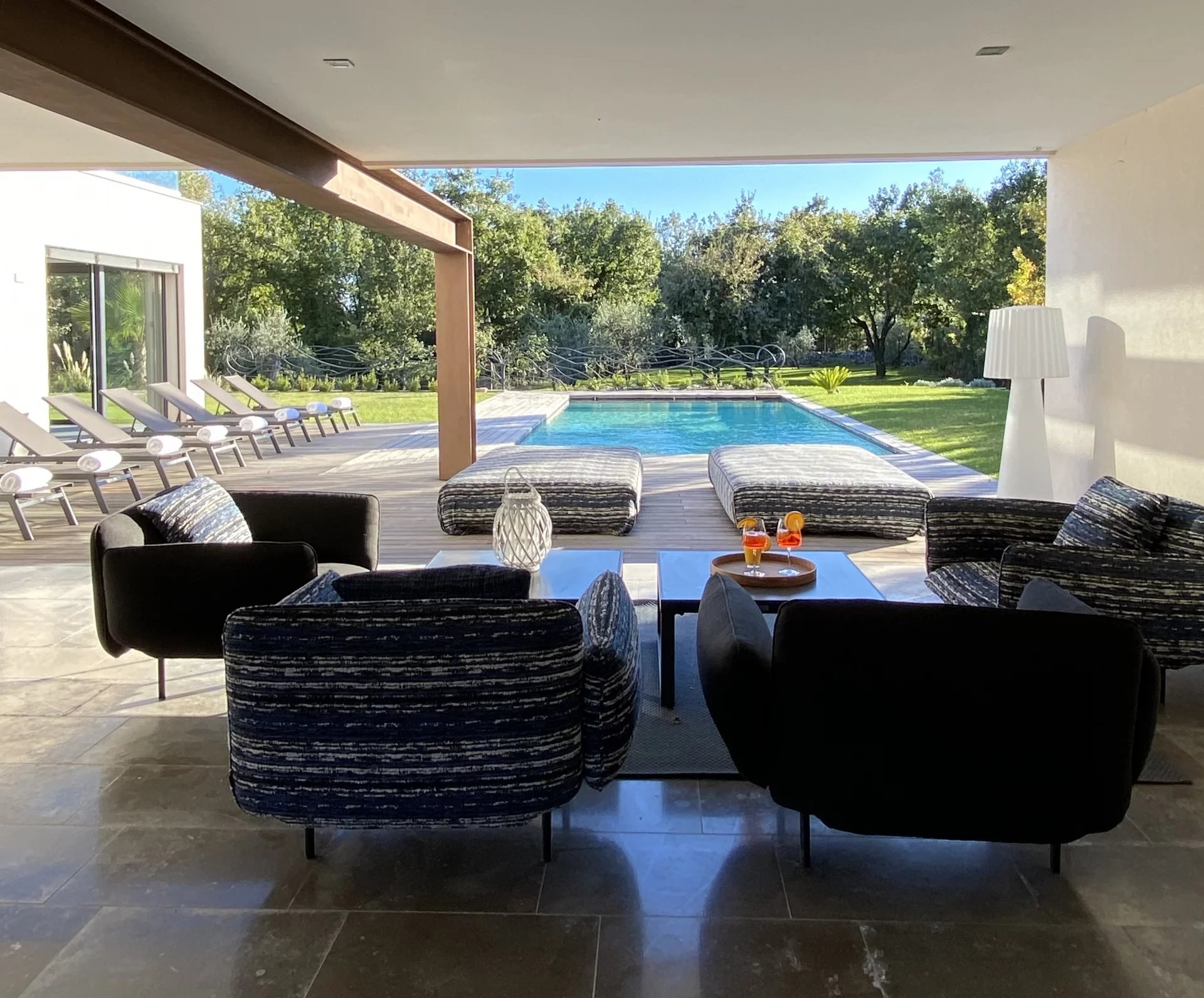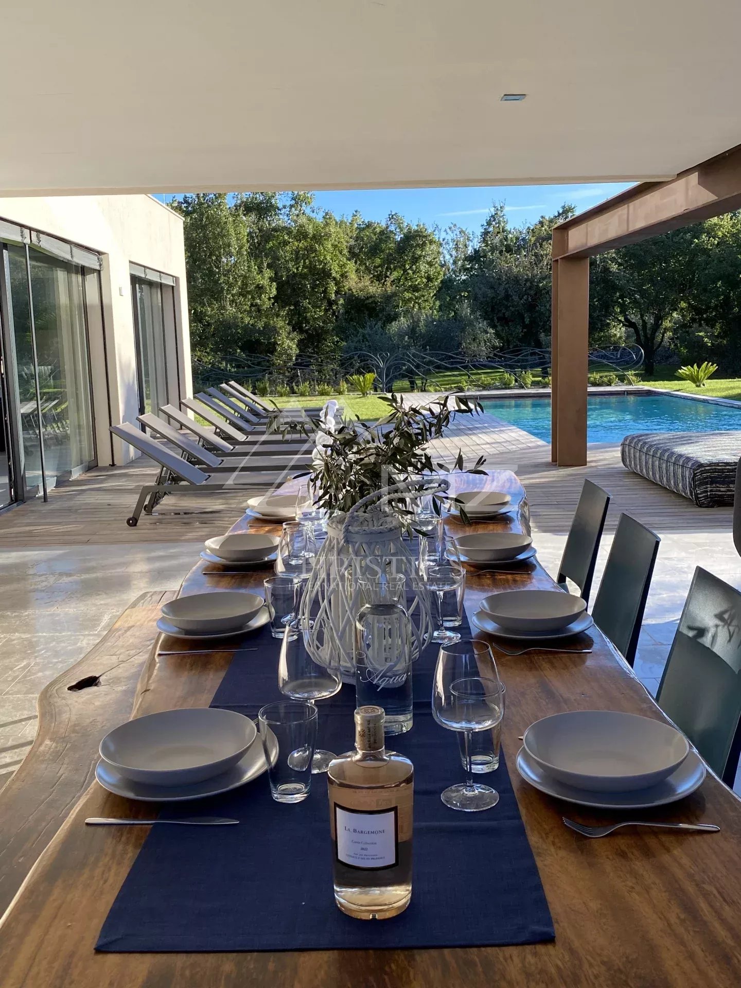 Eine große überdachte Terrasse bietet Ihnen Komfort und Frische. Sie ist mit einem großen Tisch für 12 Personen, einer Plancha und einem Loungebereich ausgestattet, um den Bedürfnissen jeder Tageszeit gerecht zu werden.