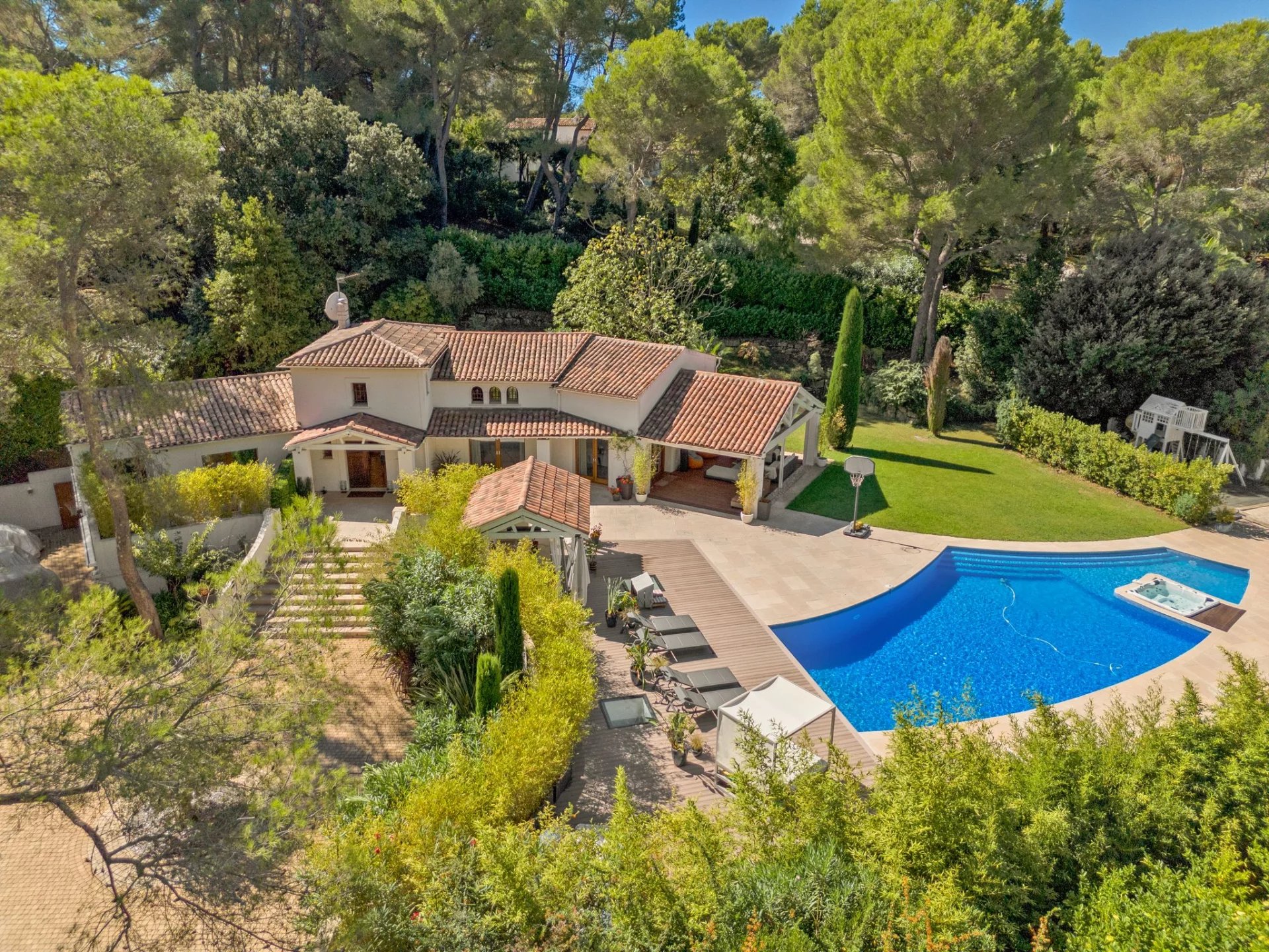 Im Herzen einer der besten und sichersten Wohnsiedlungen von Mougins, in einer Oase der Ruhe und umgeben von viel Grün, bietet dieses prächtige Anwesen eine hochwertige Ausstattung und eine sehr gesellige Lebensqualität. Die Wohnräume öffnen sich zu einer großen Terrasse mit Swimmingpool sowie einem Poolhaus und dem Garten. Die Hauptvilla mit ca. 350 m² besteht aus geräumigen Empfangsräumen, einem großen Wohnzimmer mit Kamin, einer voll ausgestatteten Küche mit Zugang zur Terrasse, 5 Schlafzimmern mit Bad en suite, darunter eine schöne Master-Suite mit Bad und einem kleinen Wohnzimmer. Außerdem gibt es einen Fitnessbereich und eine Garage. Die Gästewohnung besteht aus einem Wohnzimmer mit Küche und zwei Schlafzimmern mit eigenem Duschbad.