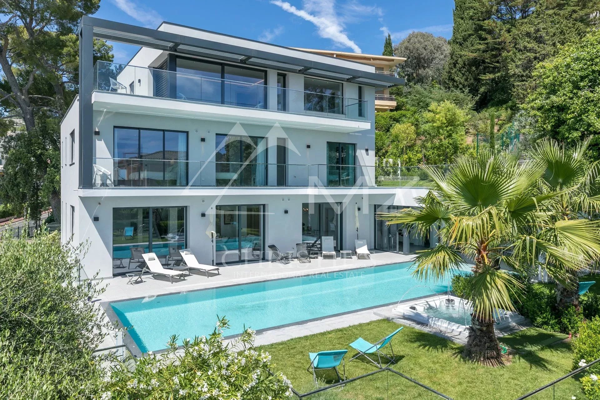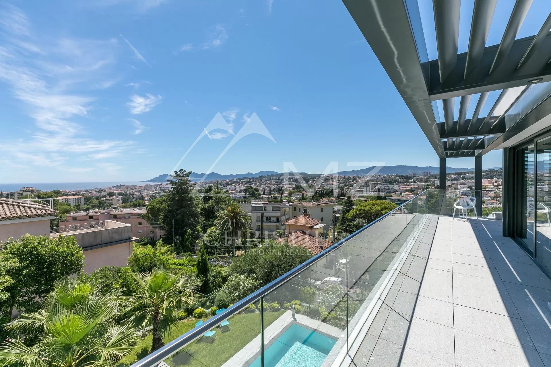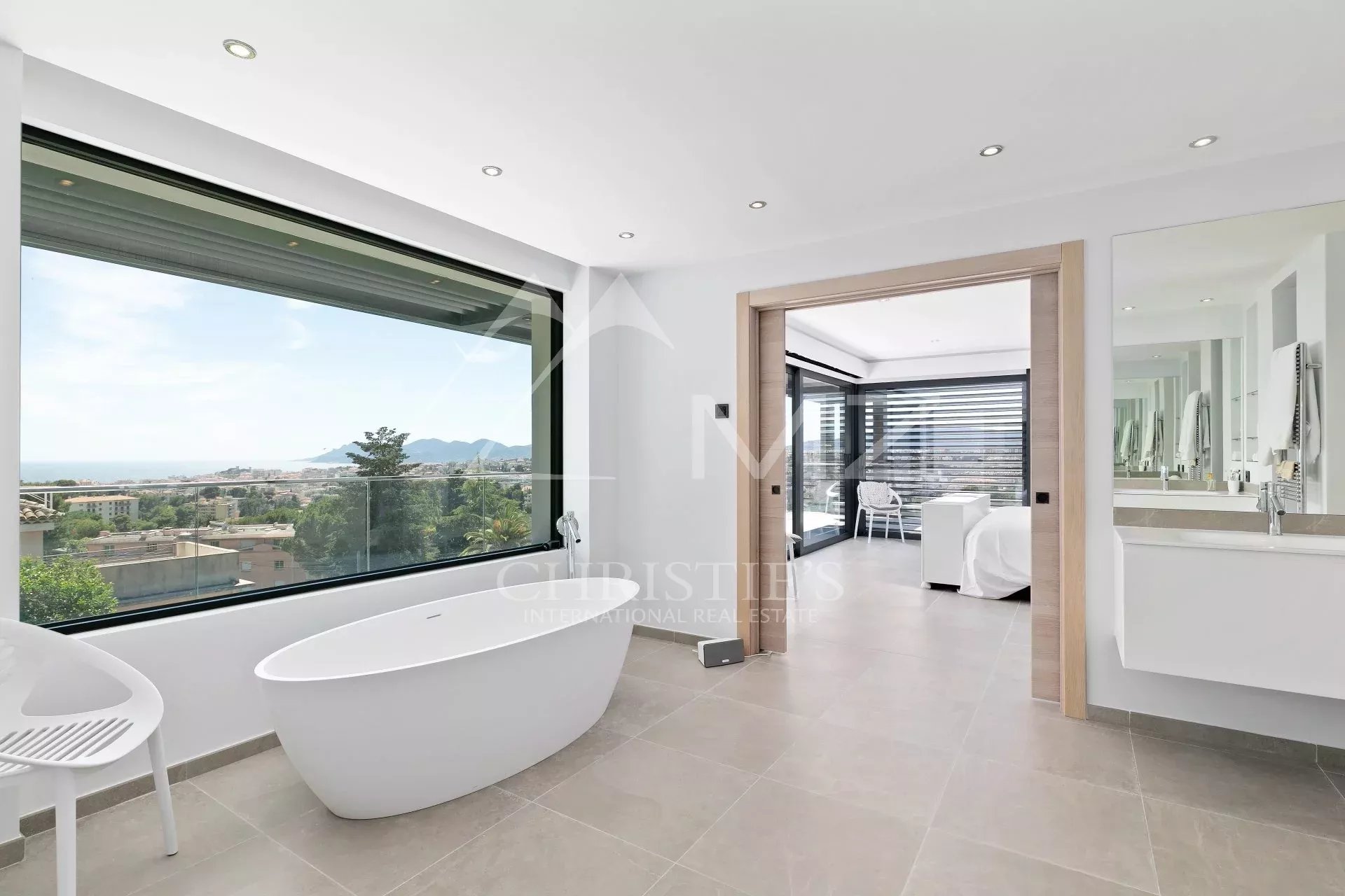 In der Nähe des Zentrums von Cannes, wunderschöne neue zeitgenössische Villa von ca. 450 m², bestehend aus: Erdgeschoss, Wohnzimmer, Küche, Schlafzimmer en suite mit Duschbad und Waschküche. Im Obergeschoss befinden sich drei Schlafzimmer en suite mit Duschbad und ein Schlafzimmer en suite mit Badezimmer. Im zweiten Stock befindet sich ein Hauptschlafzimmer mit Ankleide, Badezimmer und Dusche, Küchenzeile. Spiegelpool 15X4,5, beheizt. Grundstück von 1200m². Zwischengeschoss, ein Schlafzimmer, eine Garage und ein Fitnessraum.