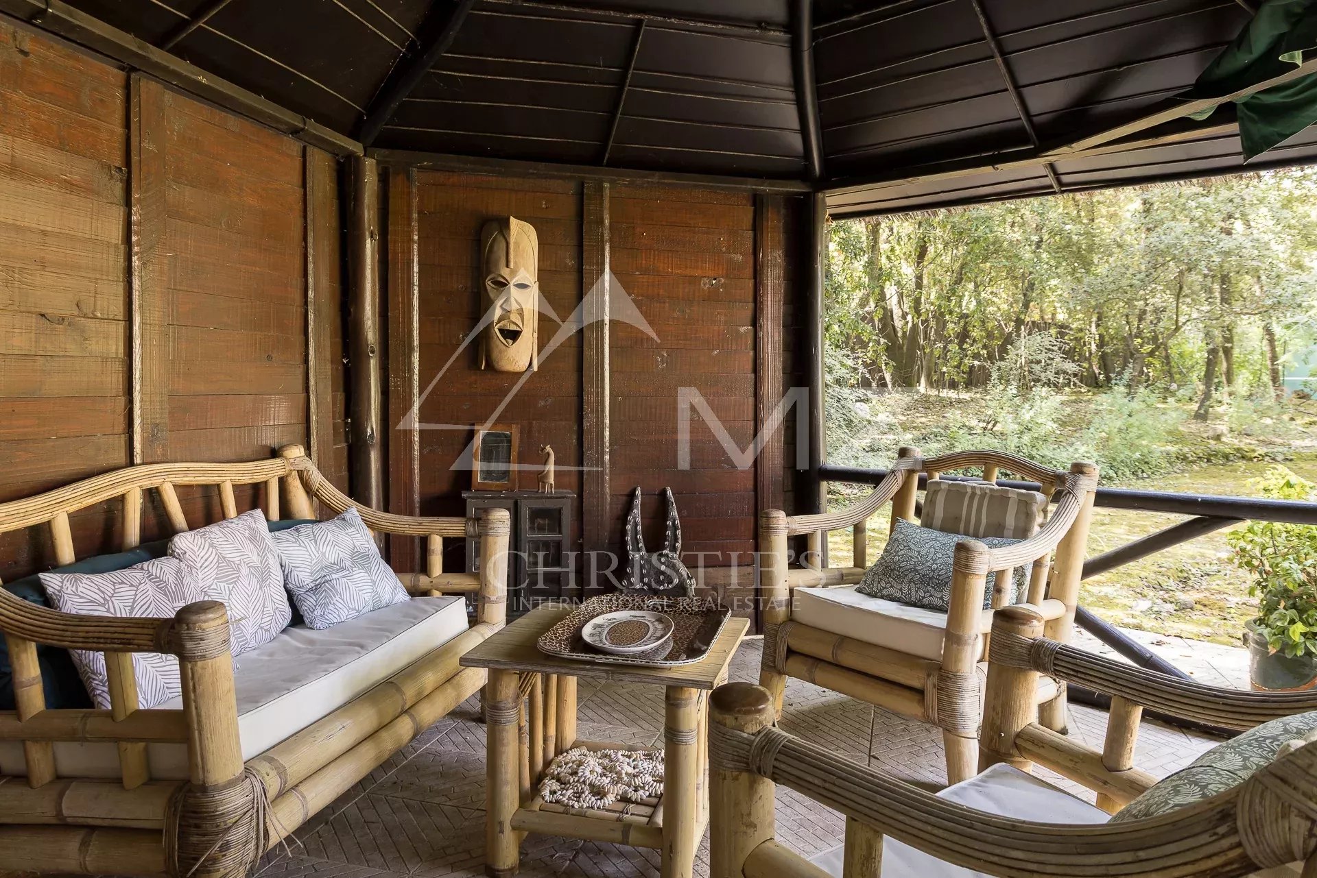 Das Anwesen profitiert von einem großen, flachen Grundstück von ca. 5771m² mit beheizbarem Salzwasserpool, zahlreichen Entspannungsbereichen im Freien, Sommerwohn- und Esszimmer, Bouleplatz, Tennisplatz, Tischtennisplatte, Spielplatz, Karpfenteichen.