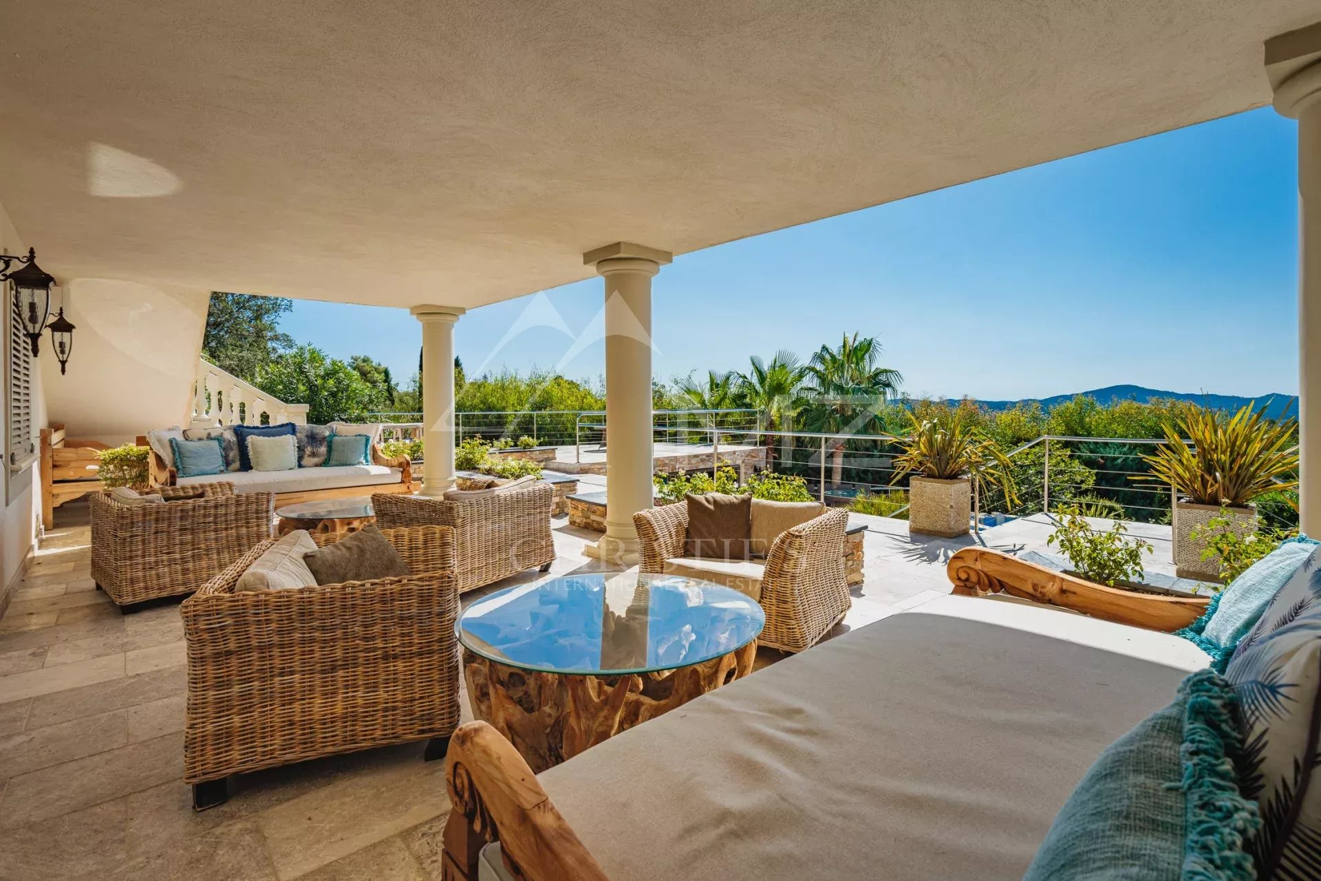 Diese luxuriöse Immobilie, ideal am Hang gelegen in einer begehrten und gesicherten Wohnanlage, wurde vollständig renoviert und erstreckt sich über etwa 400 m².