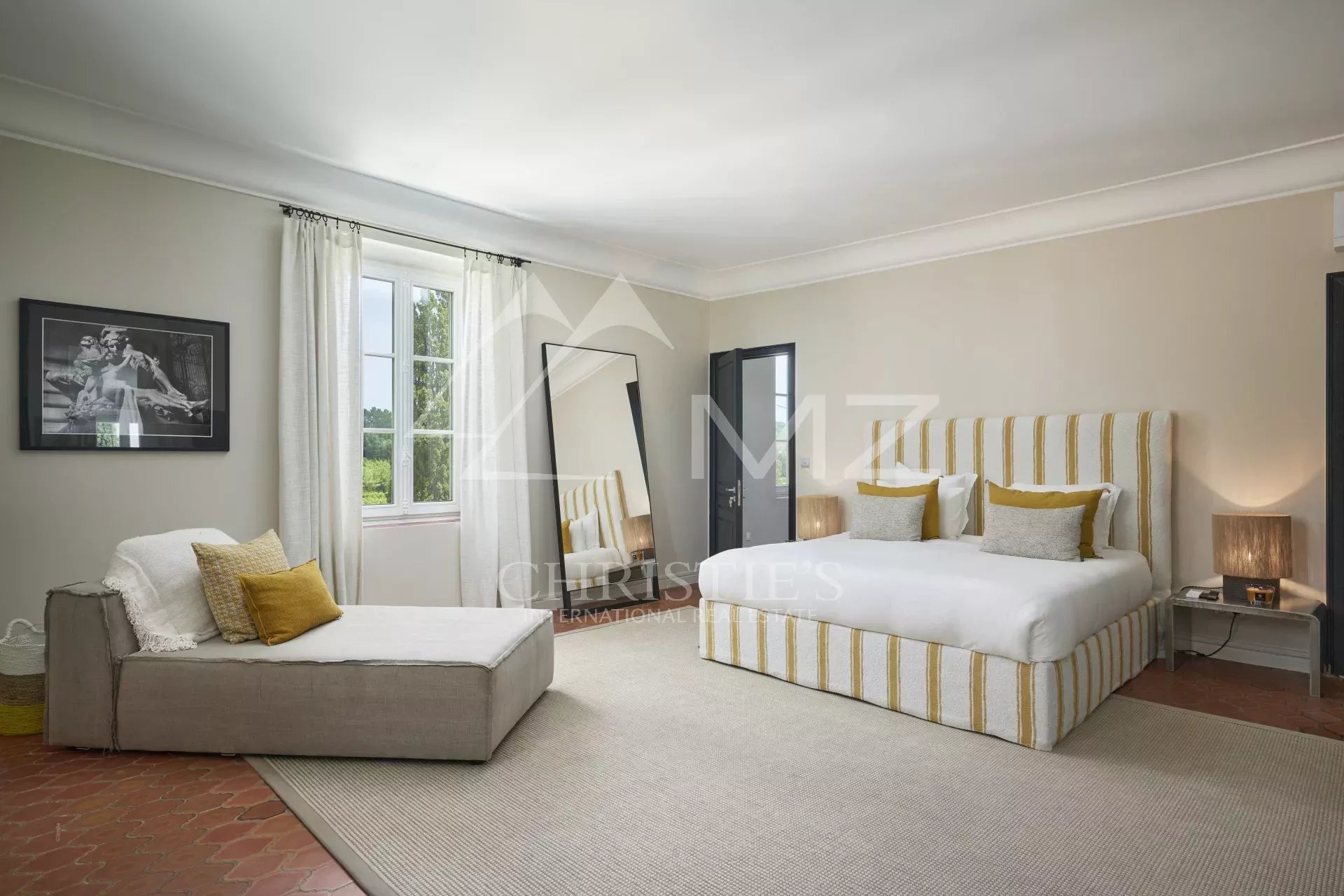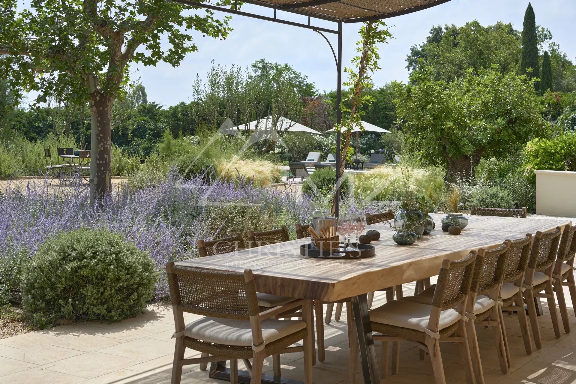 Es ist umgeben von einem herrlichen Garten mit Bäumen, großen Terrassen, einem großen Swimmingpool, einem Petanque-Platz und einem Fitnessstudio im Nebengebäude.