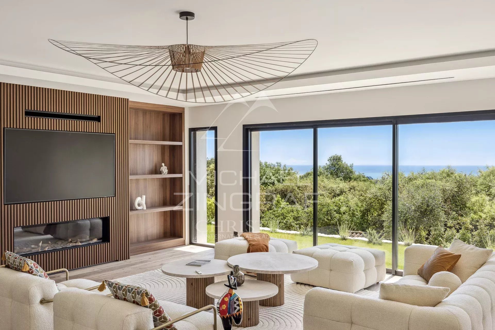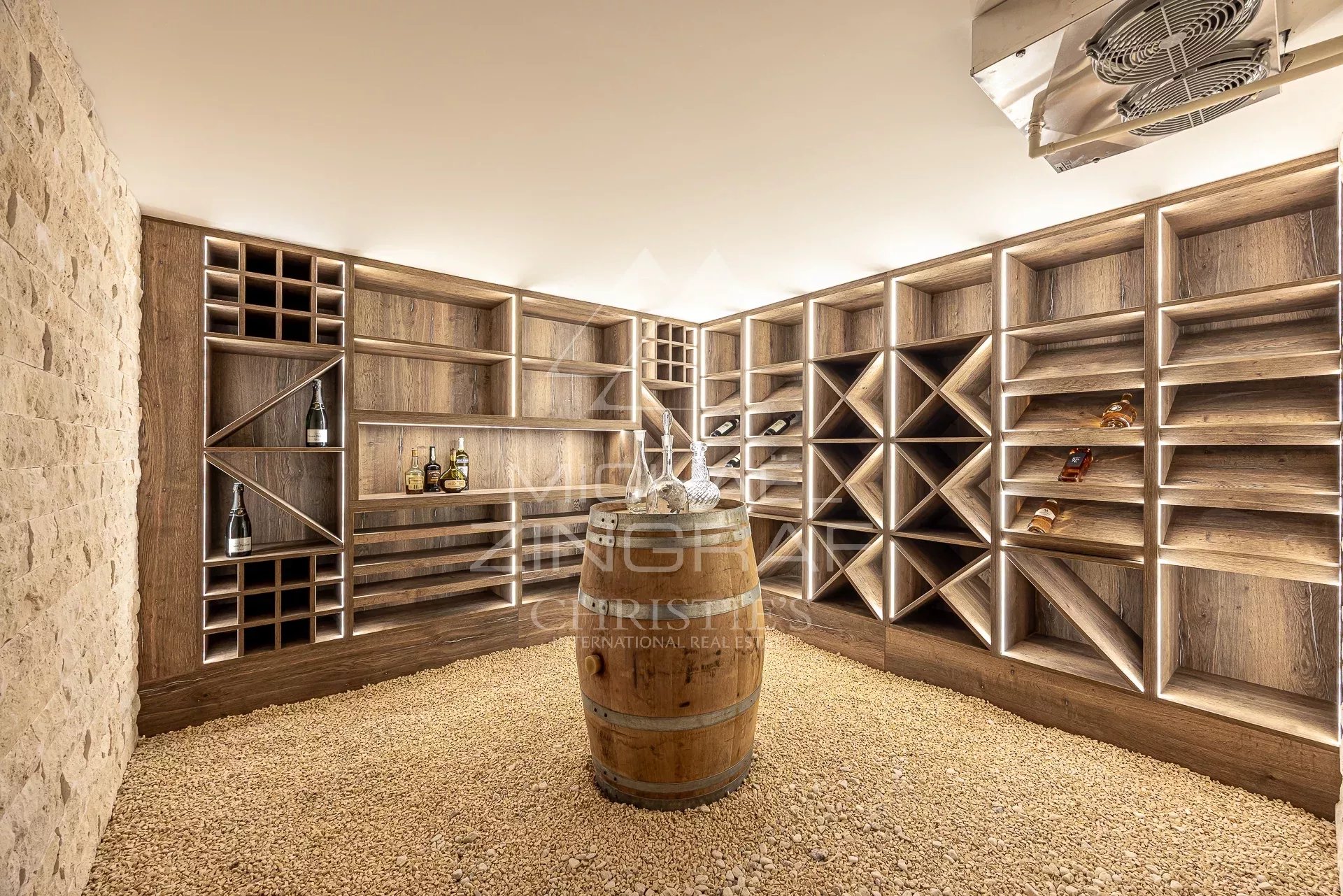Das Haus ist ebenerdig und verfügt über ein großes, helles Wohnzimmer mit Kamin, eine Einbauküche mit Pergola, eine Bibliothek, einen Abstellraum und eine Master-Suite. Im Obergeschoss sorgen vier weitere Suiten mit Meerblick, Terrassen und Ankleidezimmern für Komfort und Privatsphäre.